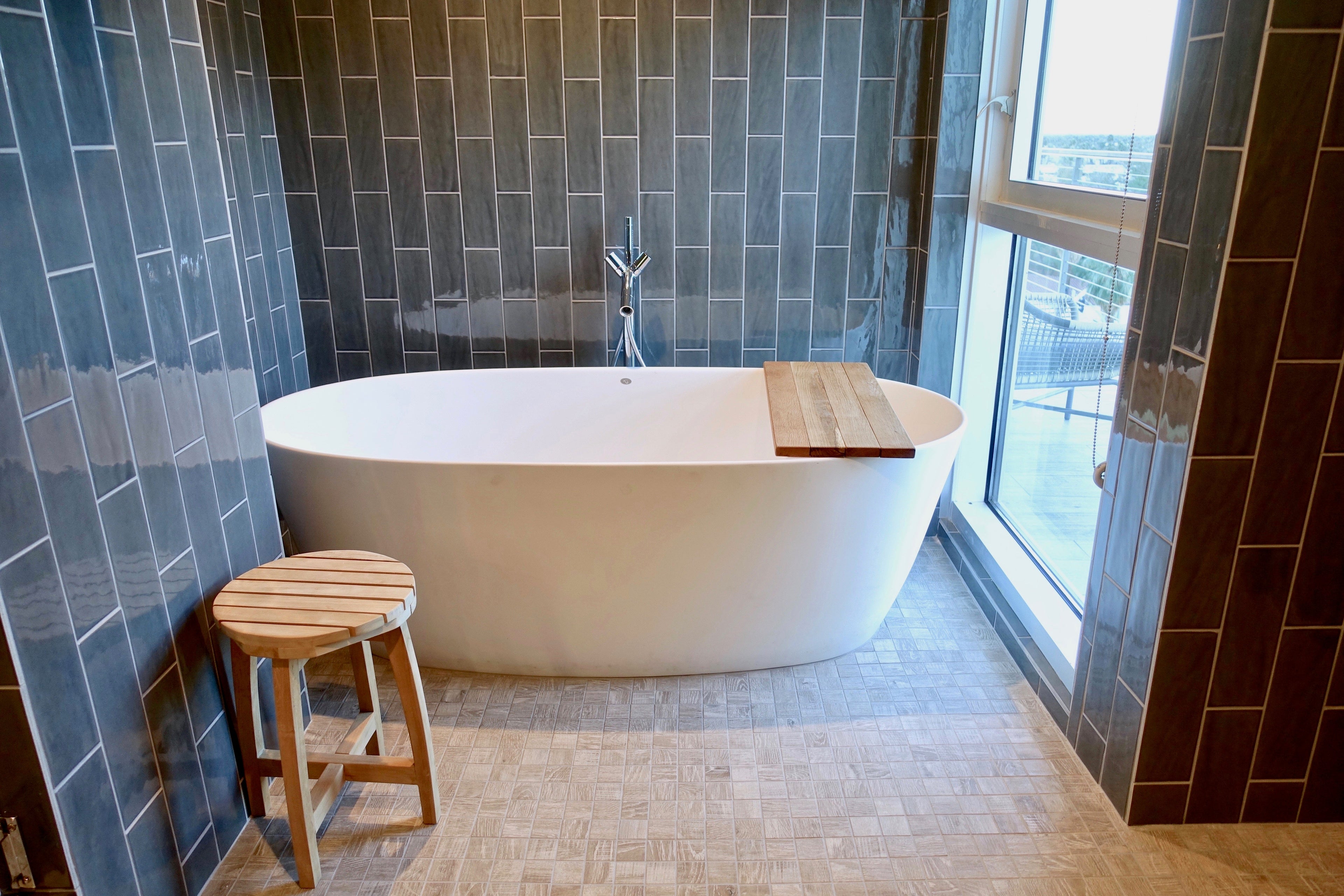 The shower area led right to the tub. There was a ton of natural light streaming through the balcony window.