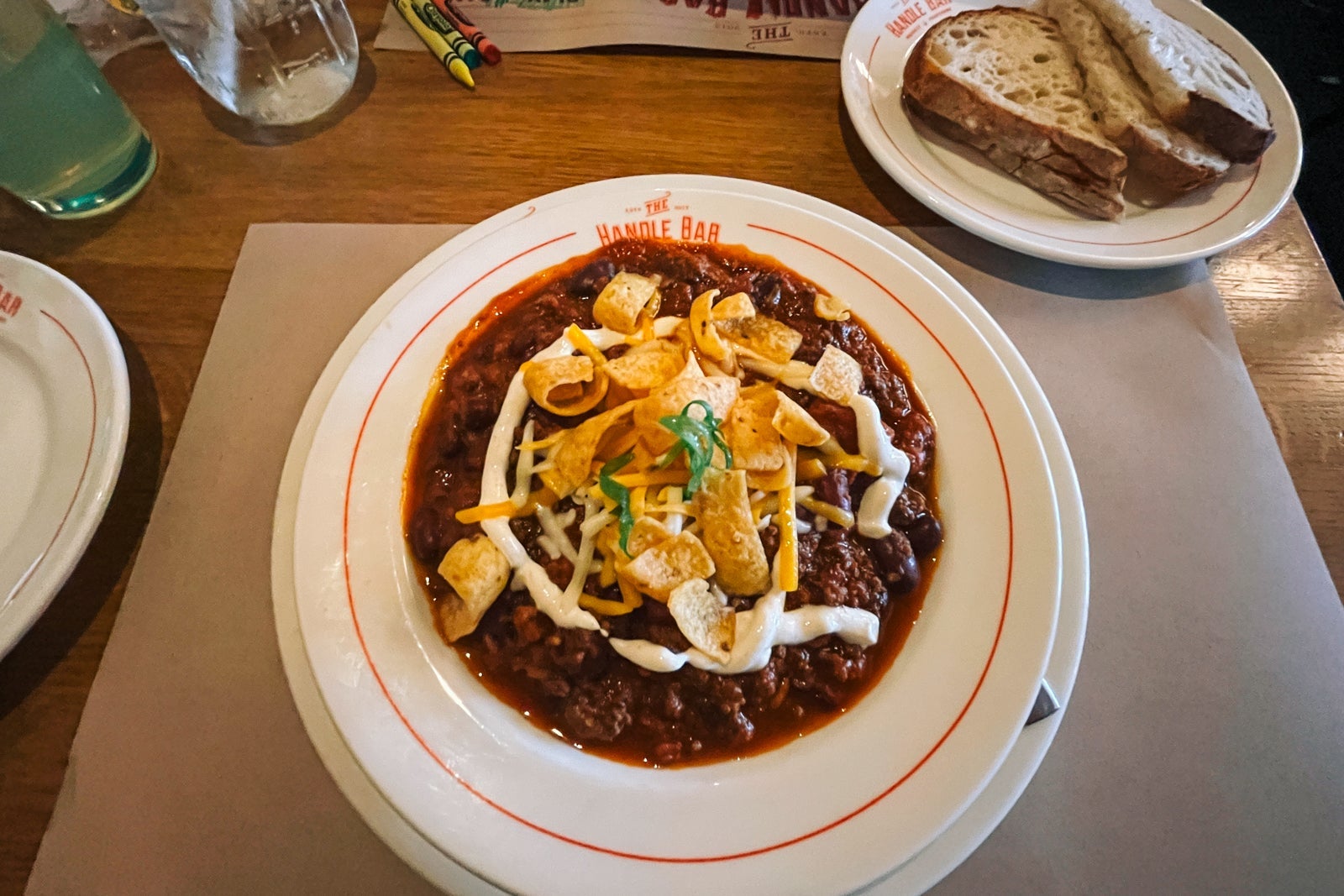 The menu was quite diverse, offering everything from a bison burger to short rib barbacoa tacos — it was hard to choose. While we were deciding, the chef surprised us with a lightly fried cauliflower bite as an amuse-bouche to start off our lunch. I ordered a bowl of the Elk and Red Bean Chili ($19), which was flavorful and hearty. Our server suggested a spiced cider called Sweater Weather, which paired nicely with the chili. The kid's chicken tender basket with fries was big enough to share.
