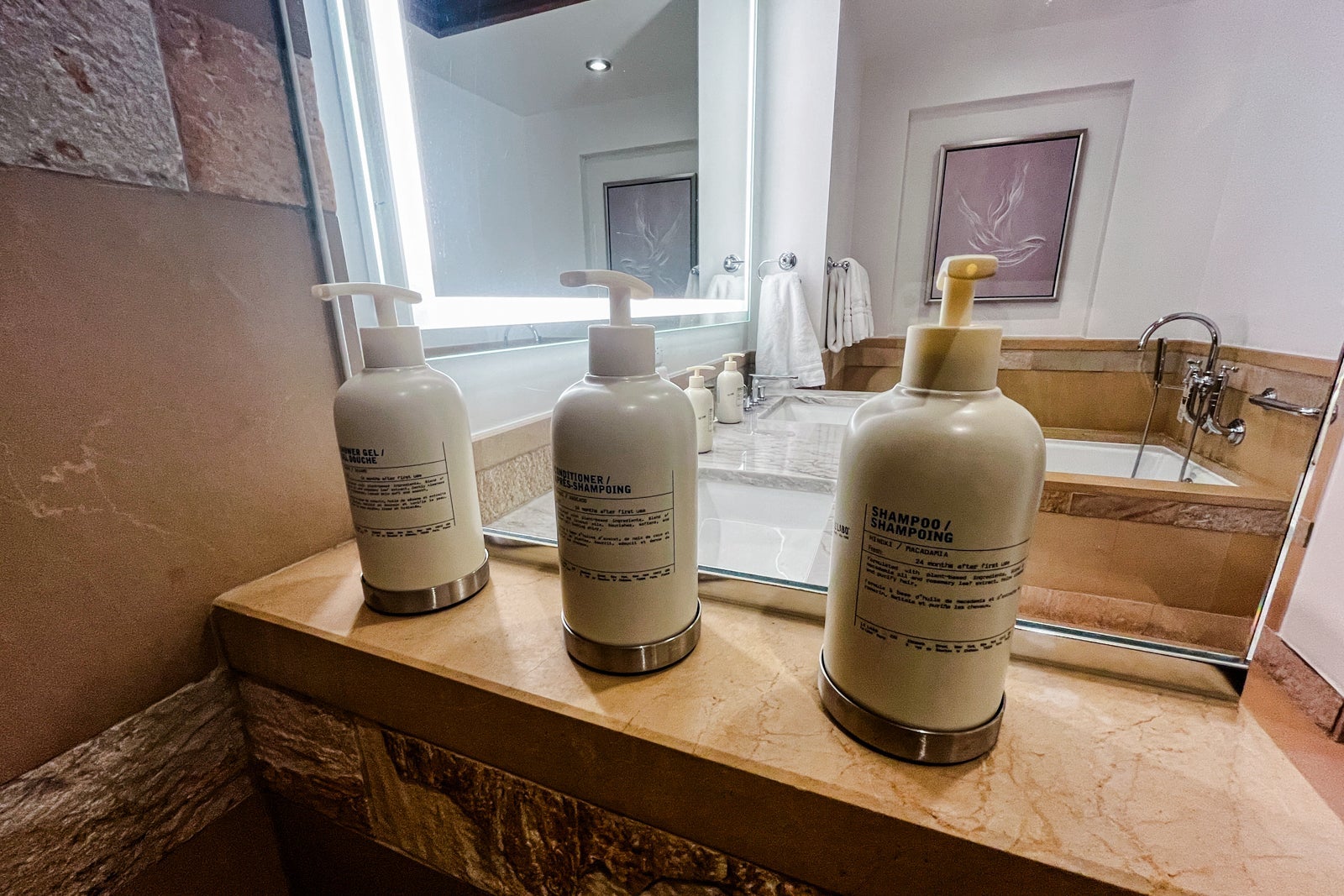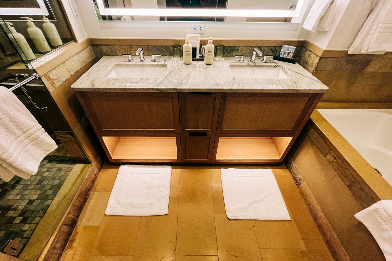 Located to the right of the entryway, through double sliding doors, was the spacious bathroom, which included a separate shower, a large soaking tub flanking the double vanity and a separate water closet to complete the setup. Le Labo bath amenities are provided in refillable bottles to reduce waste. The marble-topped double sink vanity provided plenty of counter space for travel bags and offered two drawers below the counter for additional storage. Radiant-heated tiled floors meant we never stepped off the carpet onto cold tiles — a true pleasantry in the wintertime.