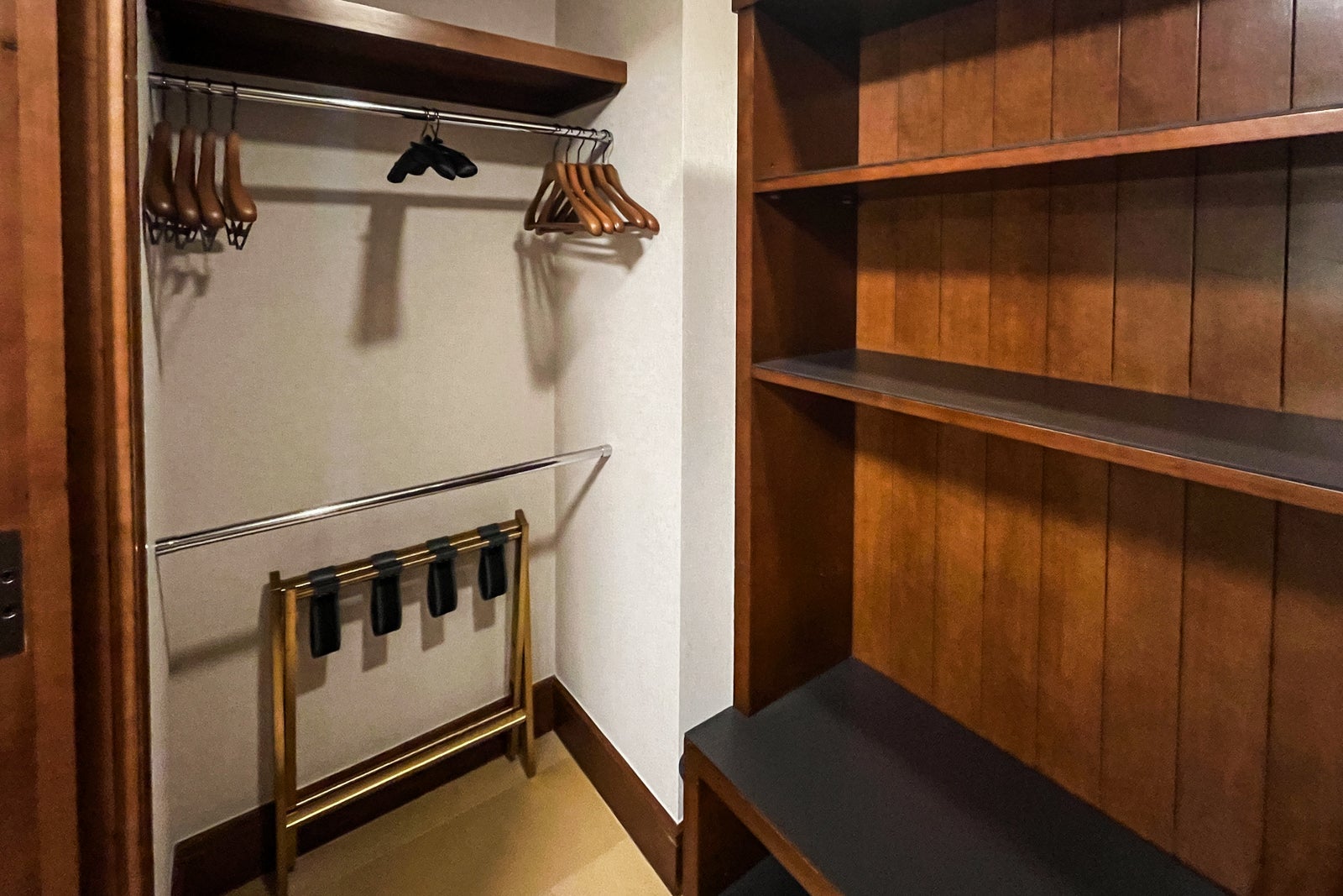 From the room's entryway, the large walk-in closet (on the left side of the entryway) was one of my favorite features. Not only were the robes and slippers kept here, but I loved being able to close the double doors and hide suitcases, snow boots and jackets. The double closet had enough room for two suitcases to be opened on top of the luggage racks, with plentiful hanging space above each. Built-in shelving housed the safe, laundry bag and shoe accessories for housekeeping — while still offering ample shelves above for gloves, hats and purses. The bottom shelving is the ideal height for snow boots and could easily fit up to eight pairs of shoes.