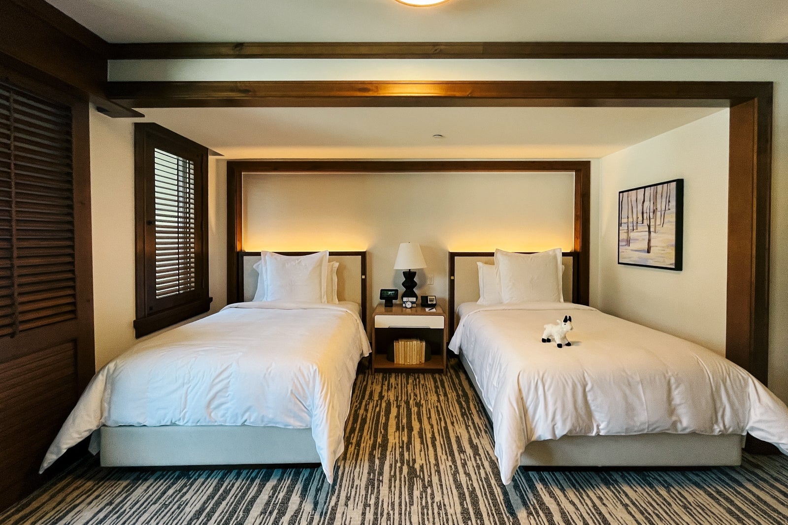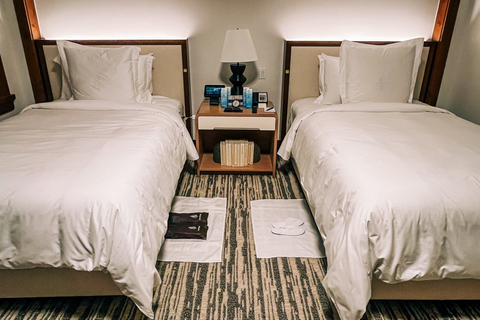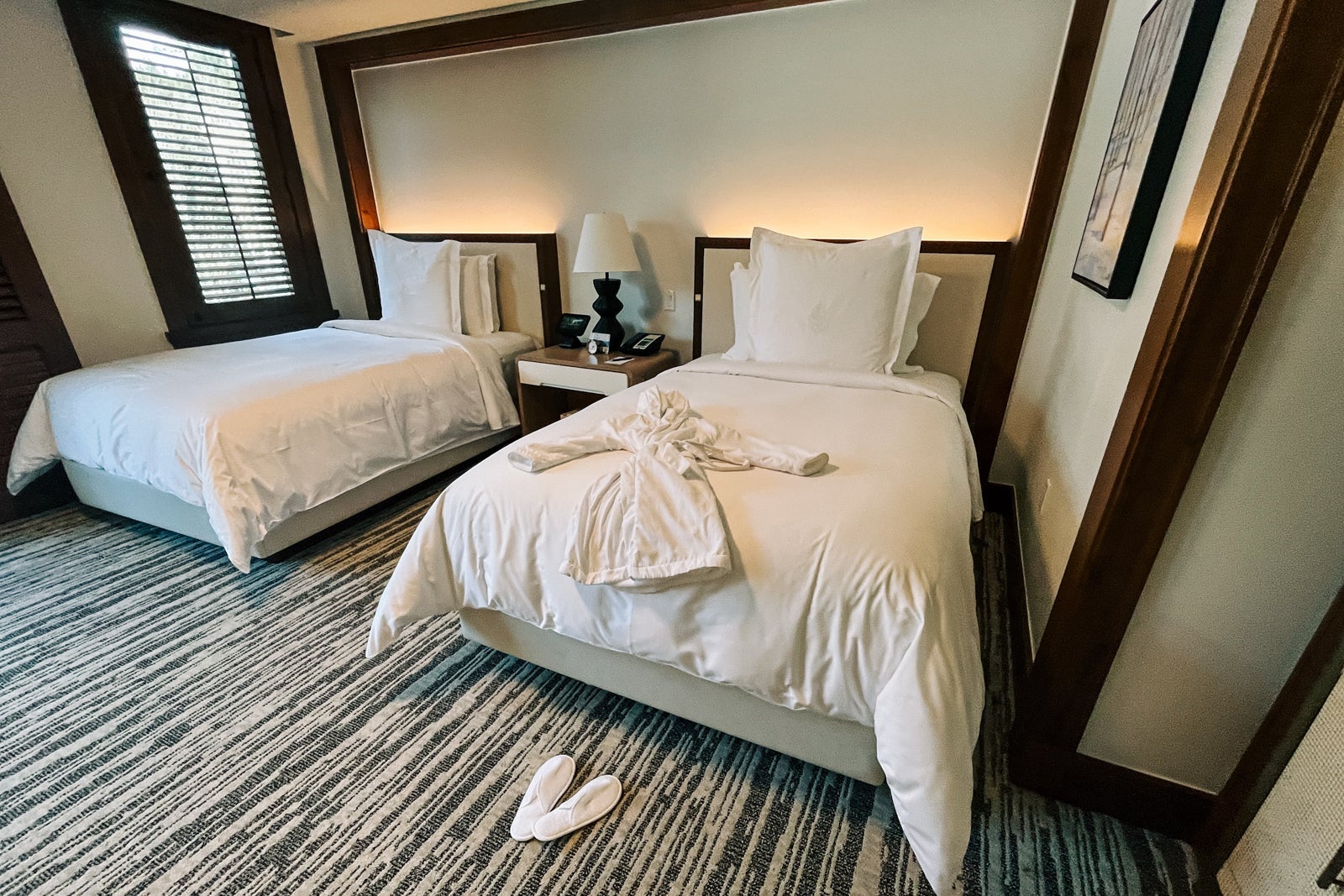 The guest room was elegantly furnished with a cozy settee, velvet dining chair and round table fitting for in-room dining or remote work. The two double beds shared a large bedside table with built-in phone chargers, a lamp and the in-room tablet where you can browse the resort's spa and dining menus and resort activities, or order in-room dining 24/7.