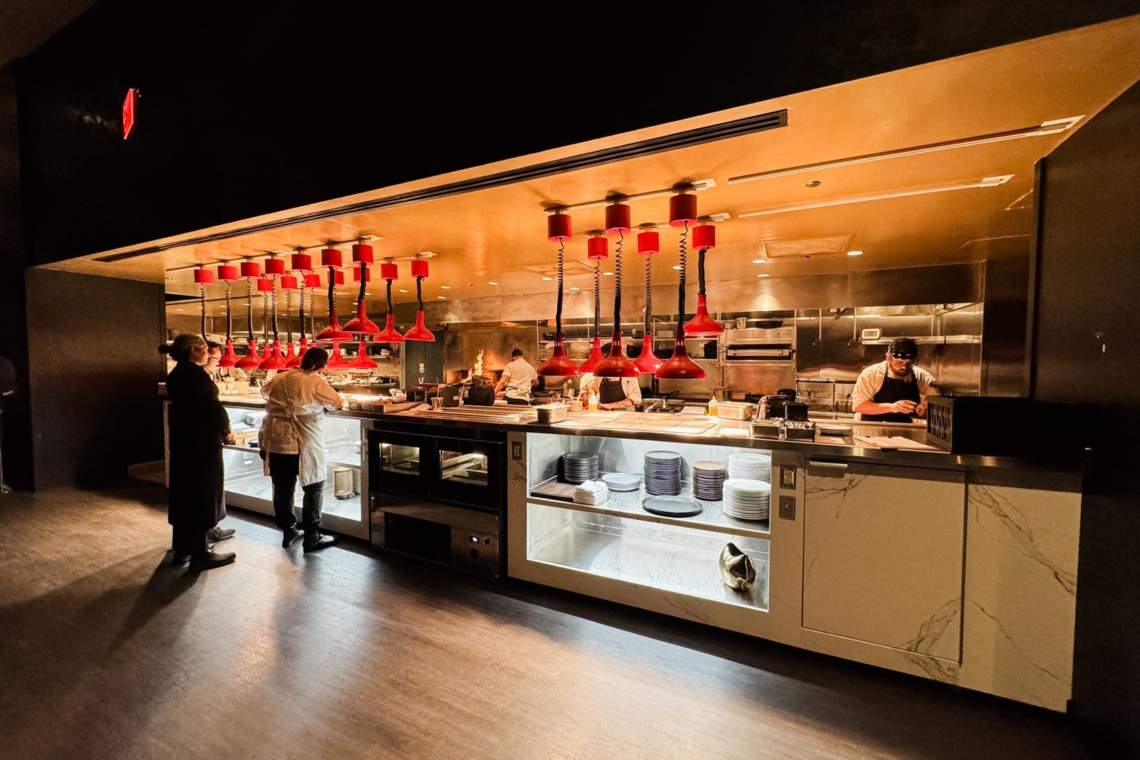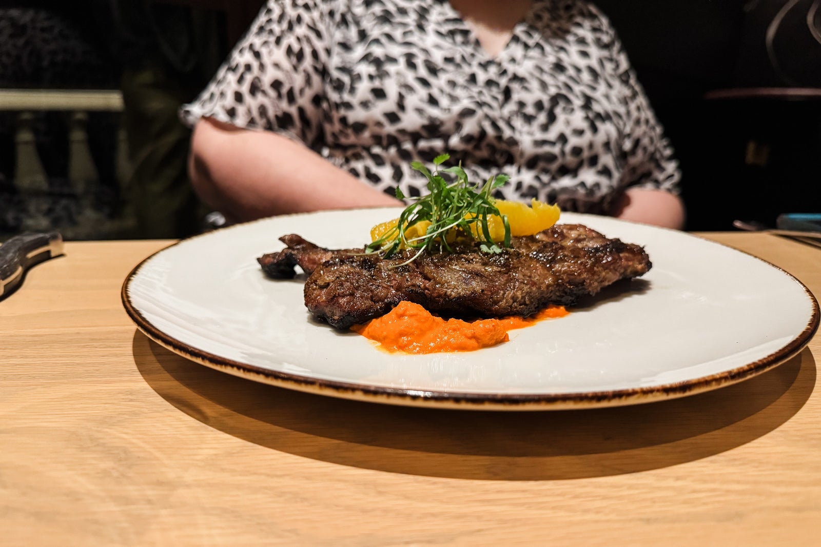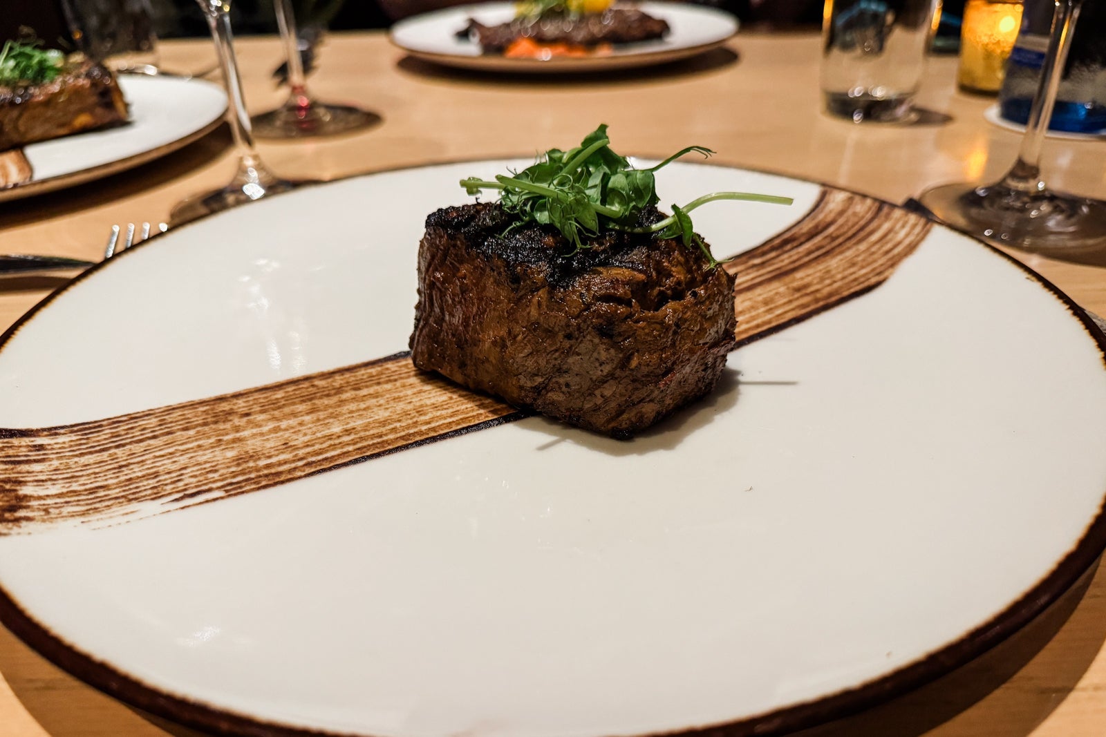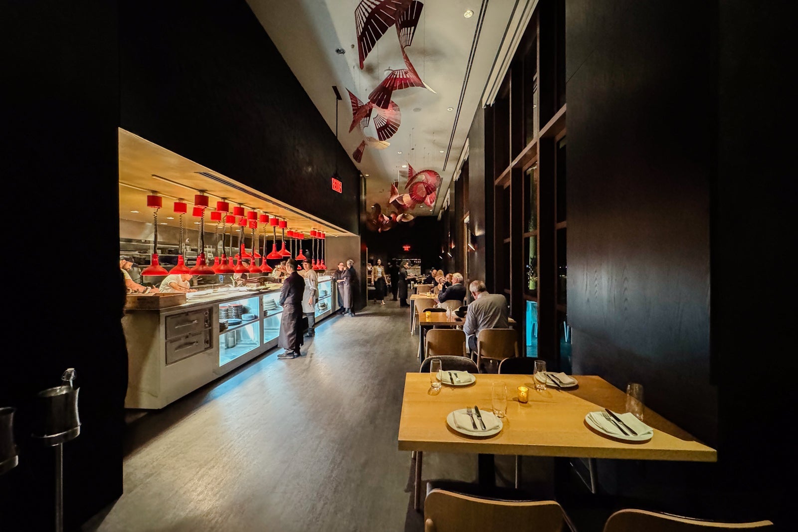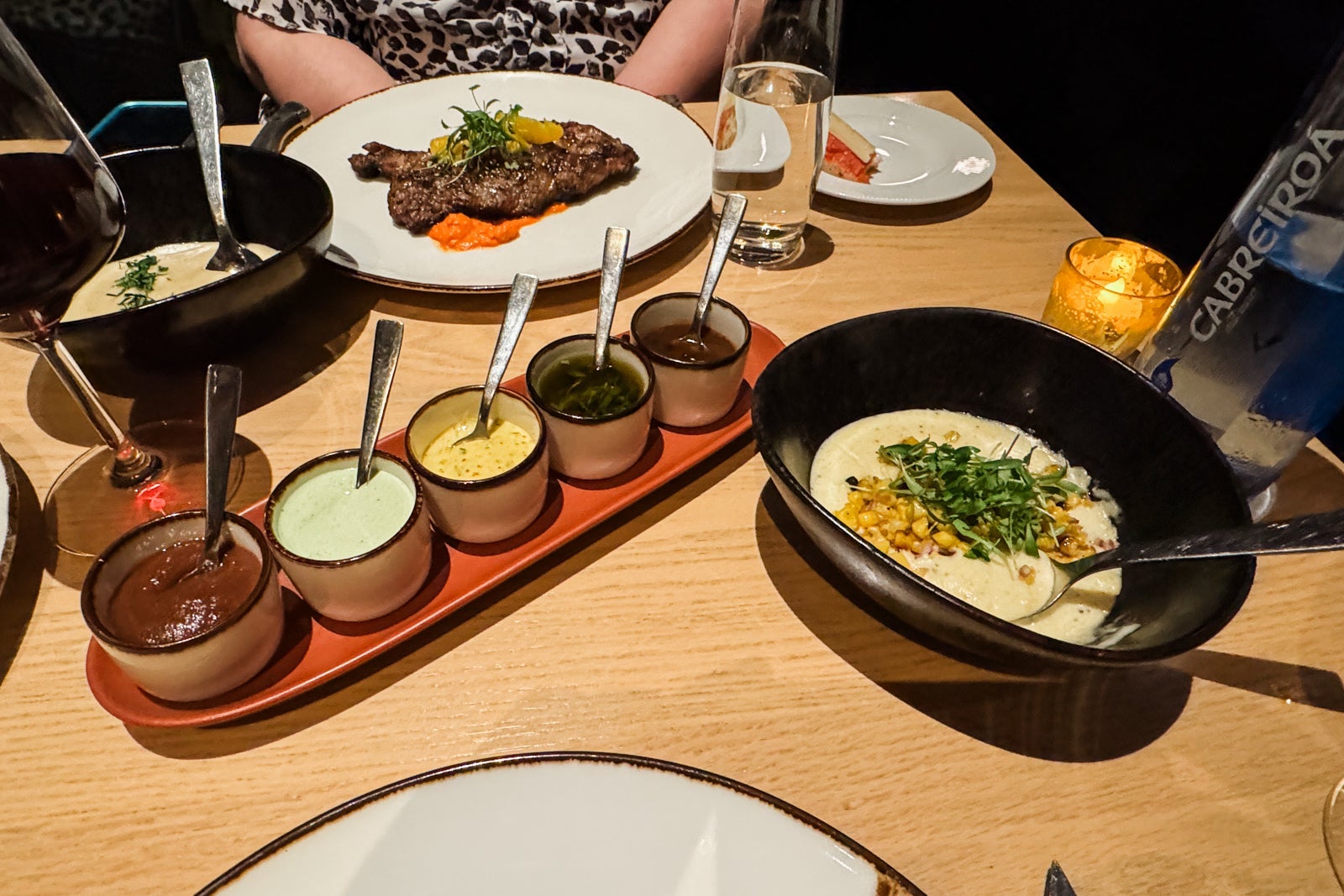 The grilled mains are mostly pricey cuts of steak, including a melt-in-your-mouth prime fillet from Arkansas-based Creekstone Farms ($68) and a 40-day, wet-aged, bone-in ribeye ($91) served with your choice of sauces like chimichurri, bearnaise, and peppercorn ($5 each) plus an intriguing array of unusual sides like fried eggplant with molasses ($14) and unctuous corn polenta with goat cheese and sherry vinegar ($14).