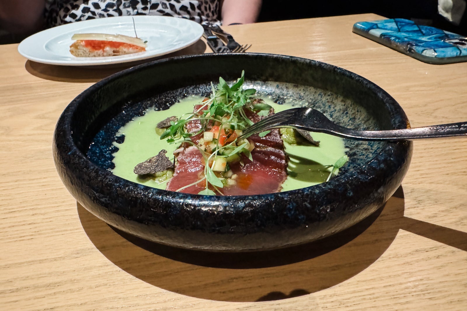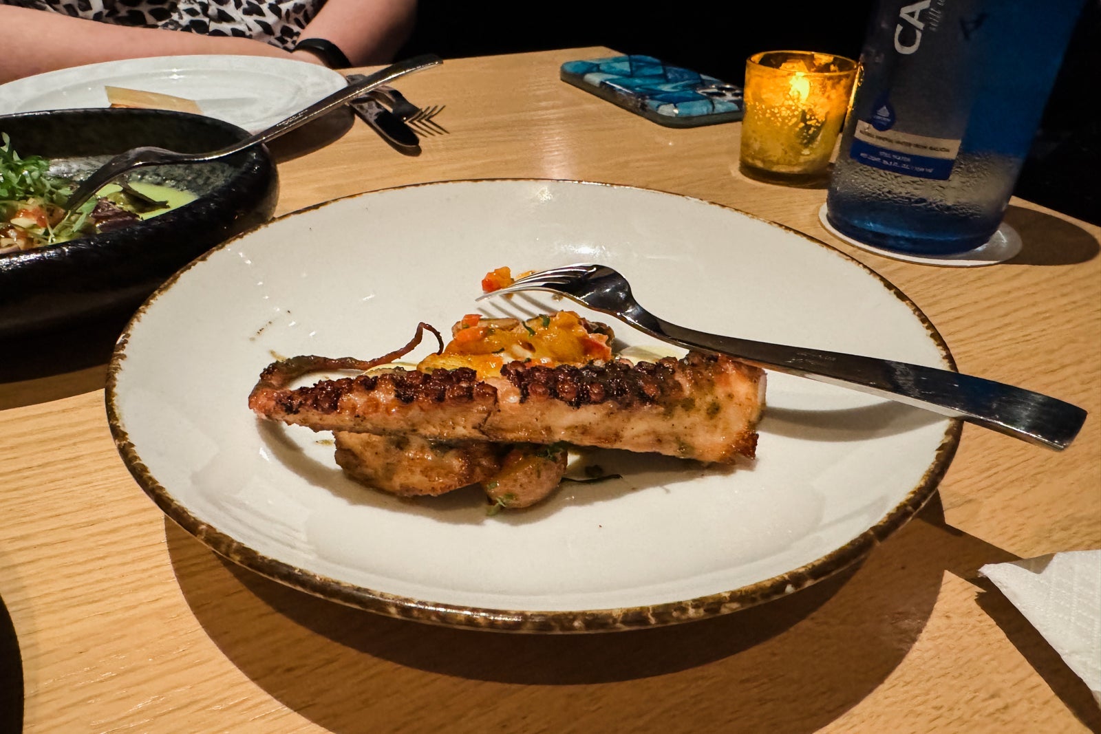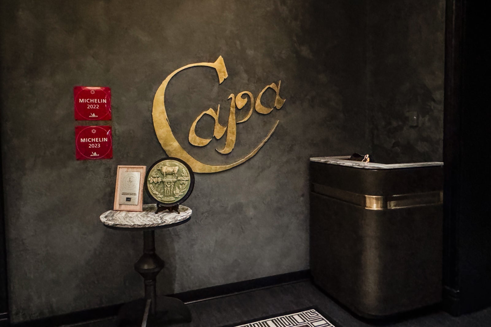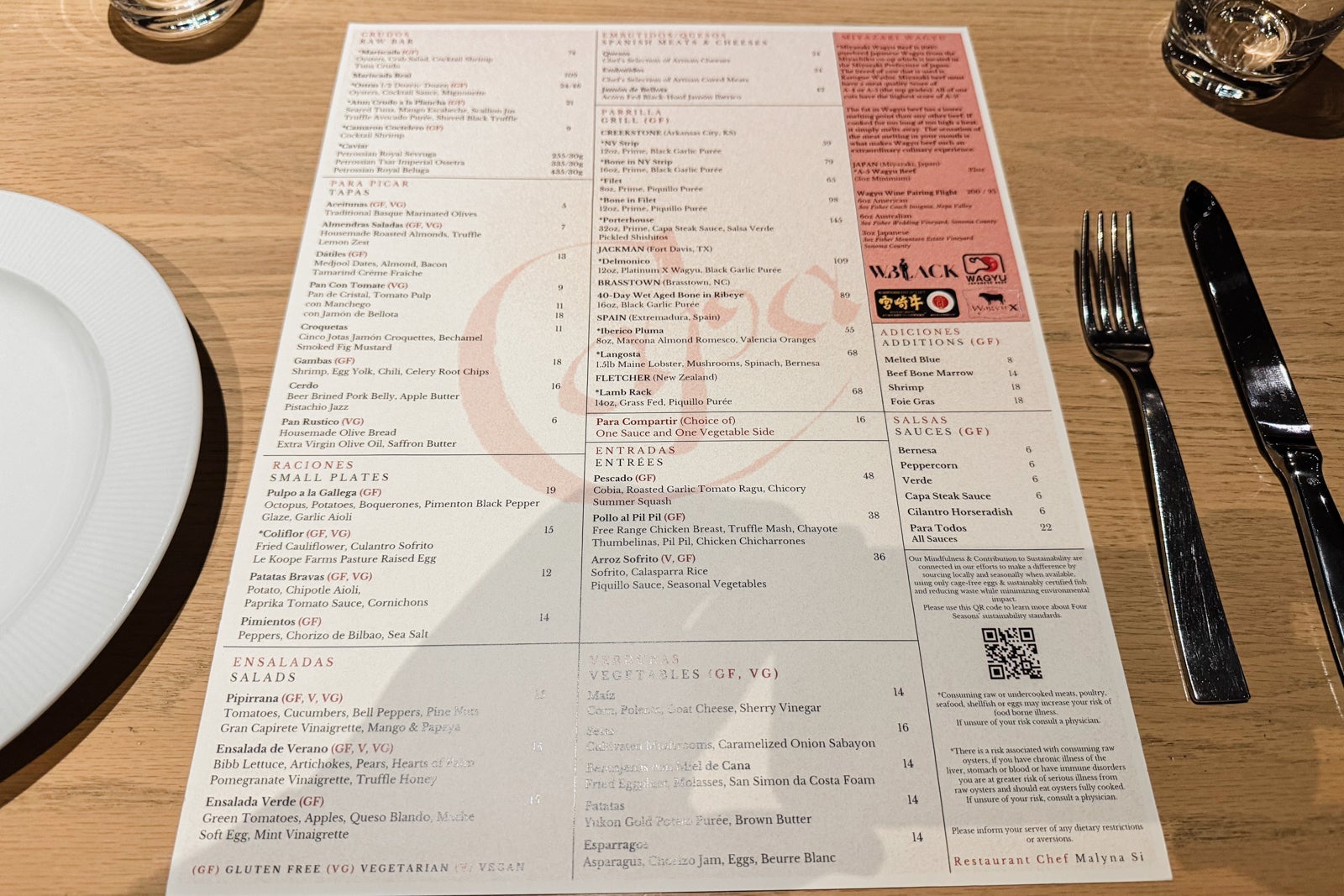 Finally, there's the hotel's top-floor fine-dining Spanish steakhouse and cocktail lounge called Capa, which has garnered a Michelin star. It is only open for dinner from 5 to 10 p.m. daily and features live music from a Spanish guitarist on Wednesday and Saturday evenings. Like the luscious cuts of meat cooking in the open kitchen, the ambience is sizzling. The menu starts with small plates and crudo, including silky seared tuna with mango escabeche, truffle-avocado puree and shaved black truffle ($21); house-roasted almonds ($7); and tender octopus with potatoes, spicy pimento, black garlic glaze and garlic aioli ($19).