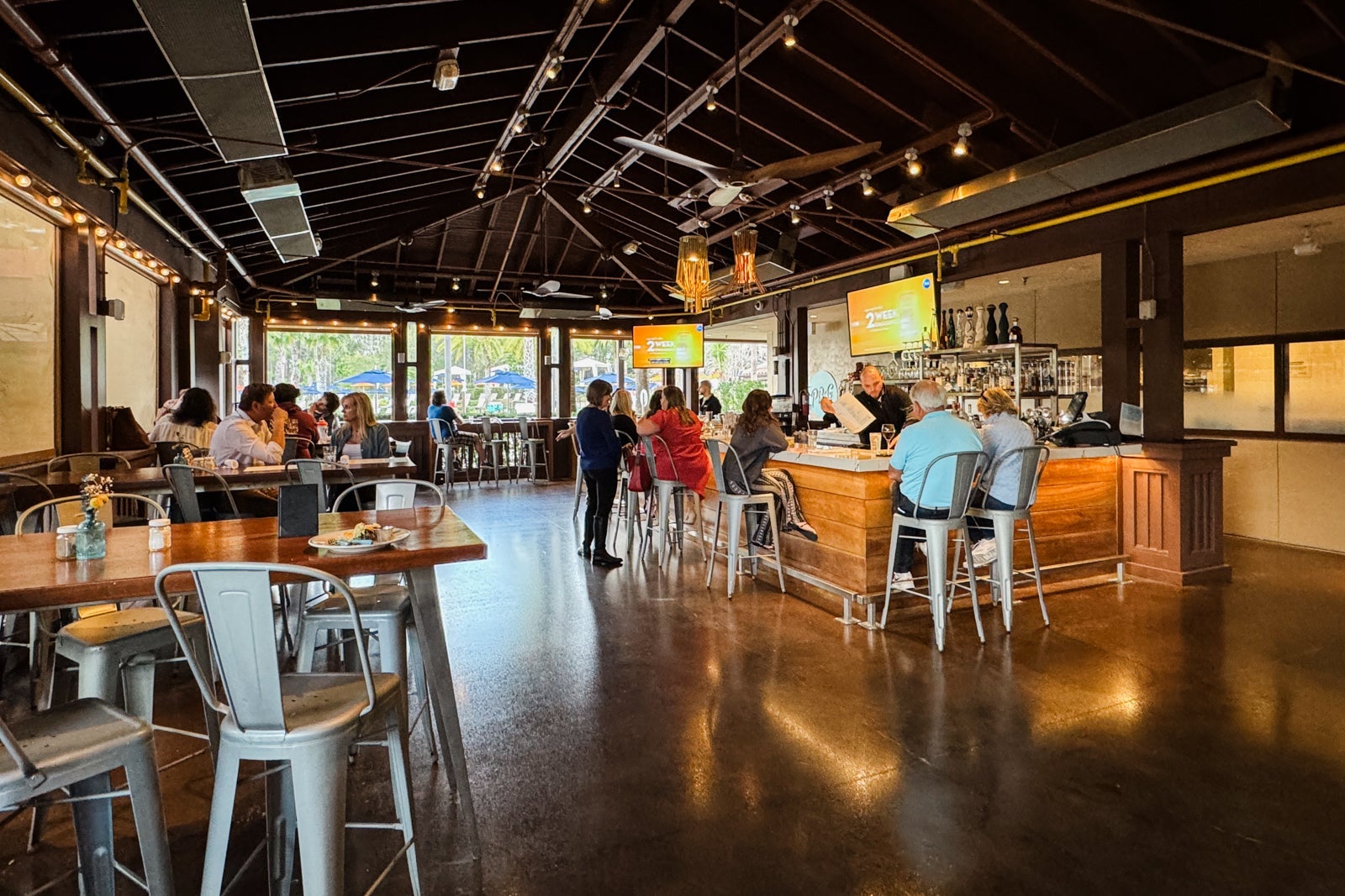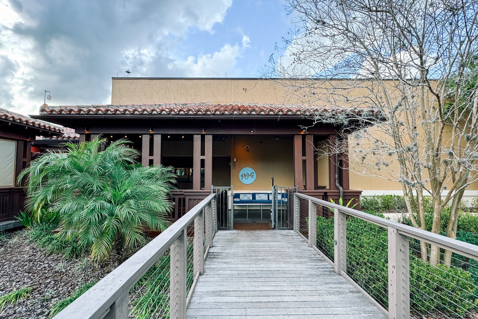 Sitting on a spit of land out in the lake, just across a bridge from the adult pool, PB&G is a breezy grill open from 11 a.m. to 6 p.m. It serves signatures like tortilla chips with fire-roasted salsa and guacamole ($13), popcorn shrimp with spicy boom boom sauce ($18), a Cobb salad ($22), a blackened chicken sandwich ($22), pan-seared crabcakes ($23) and citrus-marinated steak tacos ($28), among other options.
