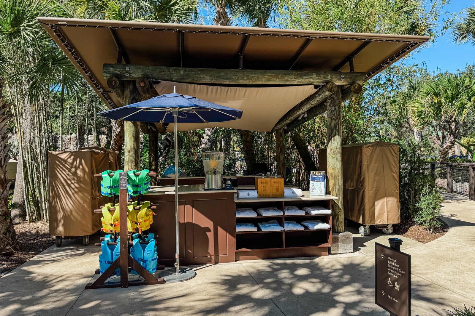 Each pool has a helpful stand where guests can get towels, sunblock, water and even life vests for kids who might not be confident swimmers.