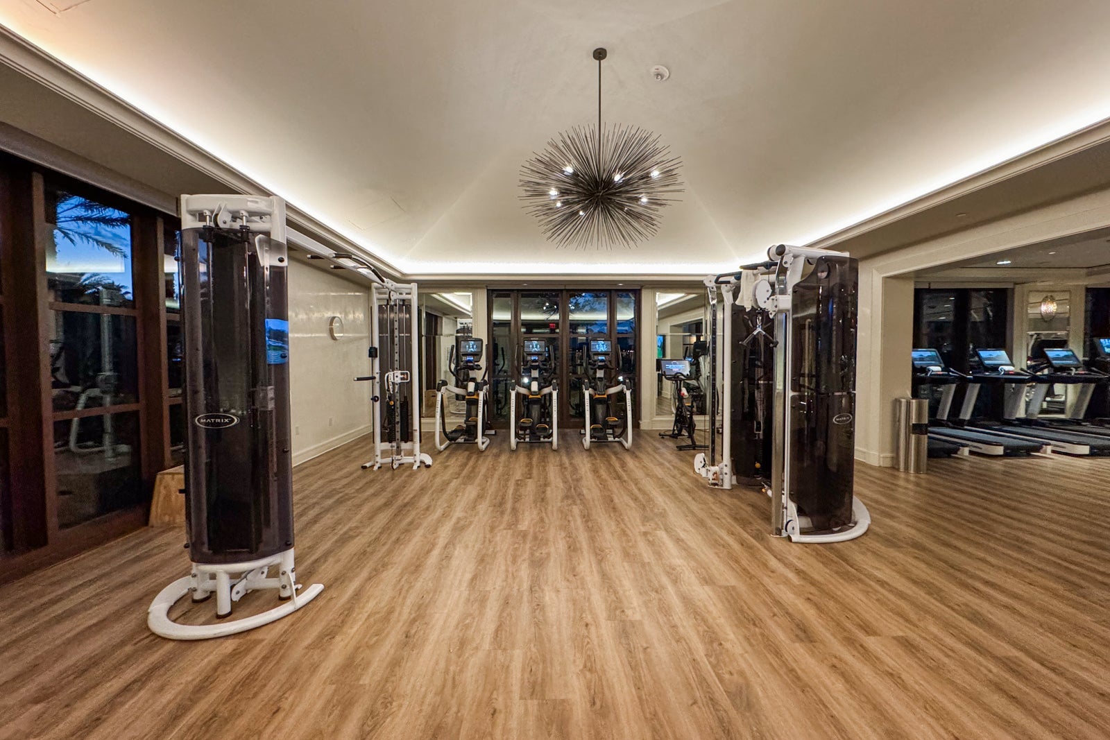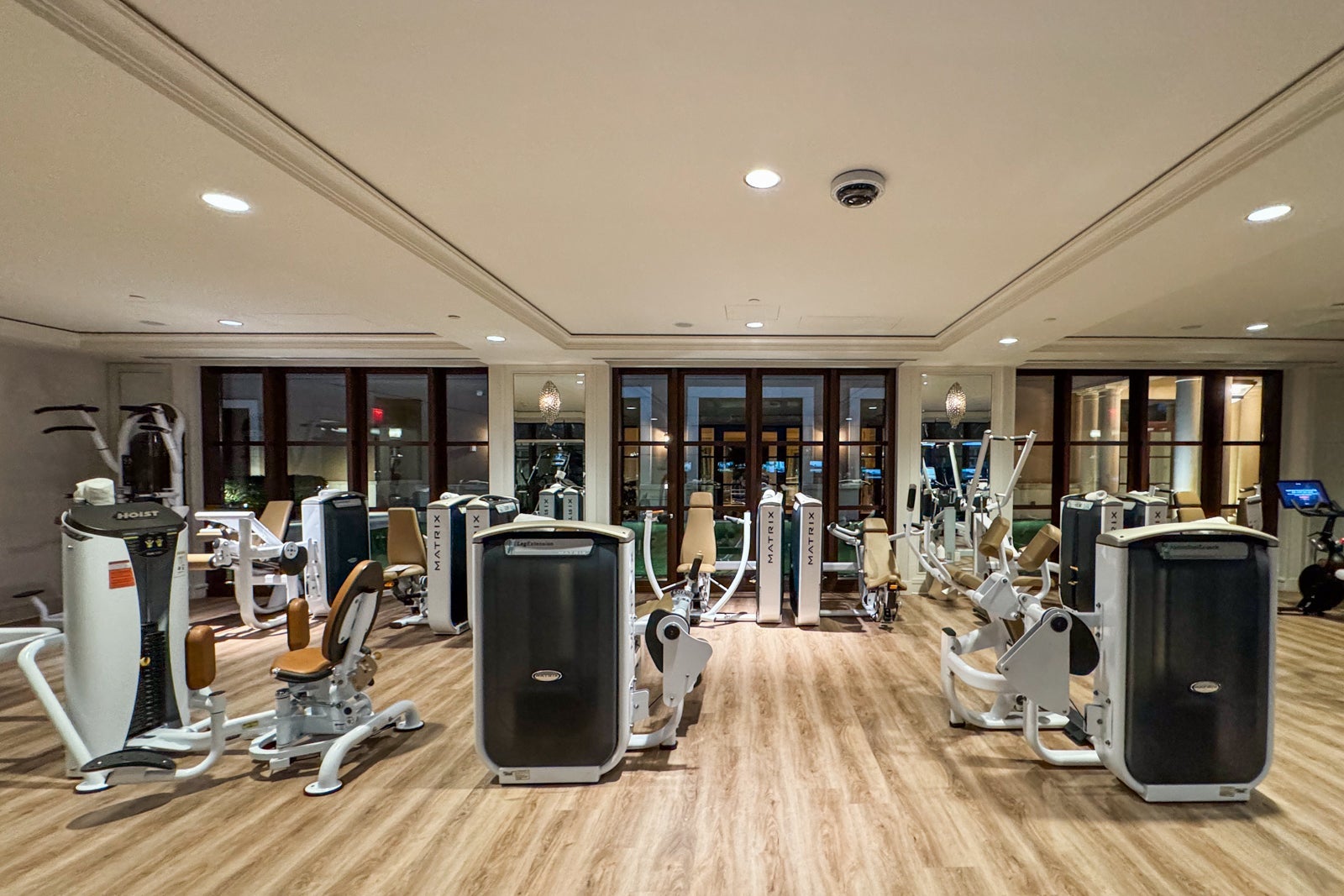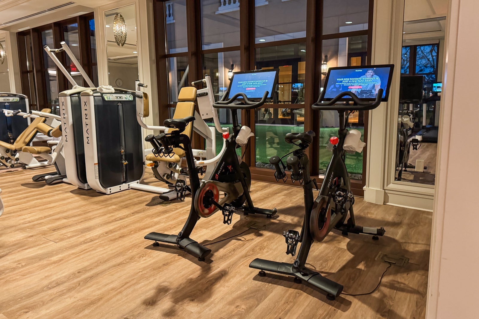 The hotel also has a large gym near the adults-only pool and the spa with LifeFitness cardio machines, including treadmills and ellipticals, Peloton bikes, Matrix weight machines, free weights and a studio for stretching, yoga and private training.