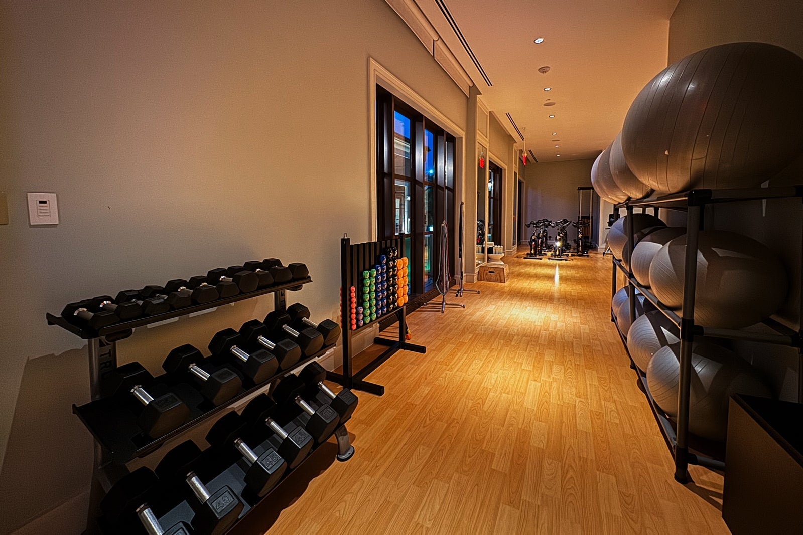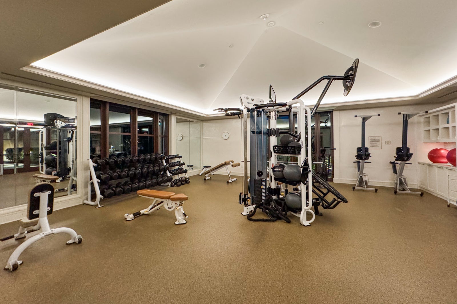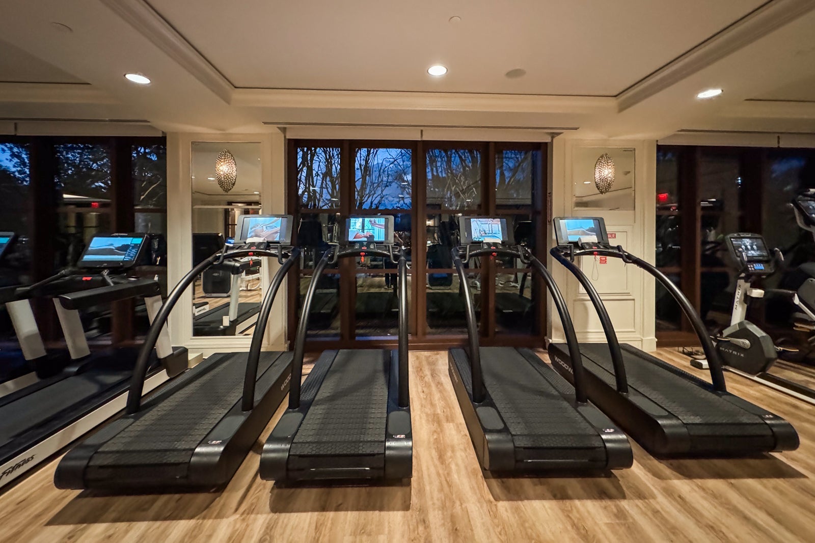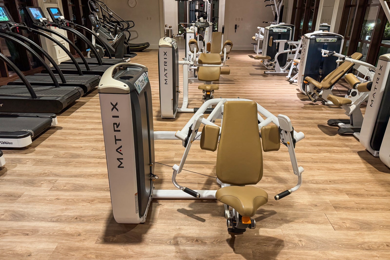 The hotel also has a large gym near the adults-only pool and the spa with LifeFitness cardio machines, including treadmills and ellipticals, Peloton bikes, Matrix weight machines, free weights and a studio for stretching, yoga and private training.