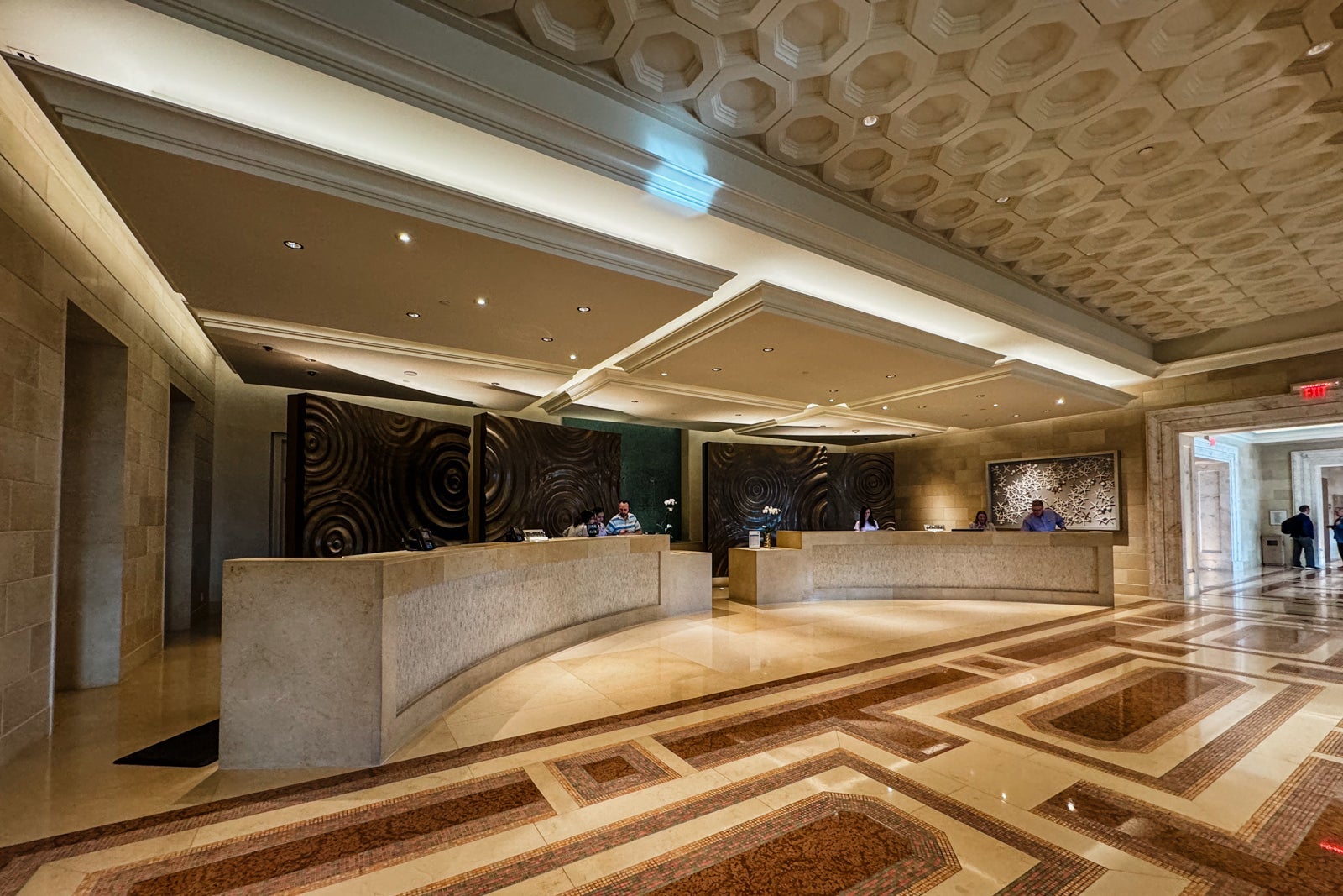The hotel entrance is wheelchair-accessible with gradual inclines from the driveway and accessible doors, plus wide hallways in the public areas and sets of elevator buttons within reach of wheelchair height. The reception and concierge desks are Americans with Disabilities Act-compliant, and guests can also request in-room registration as an alternative.
