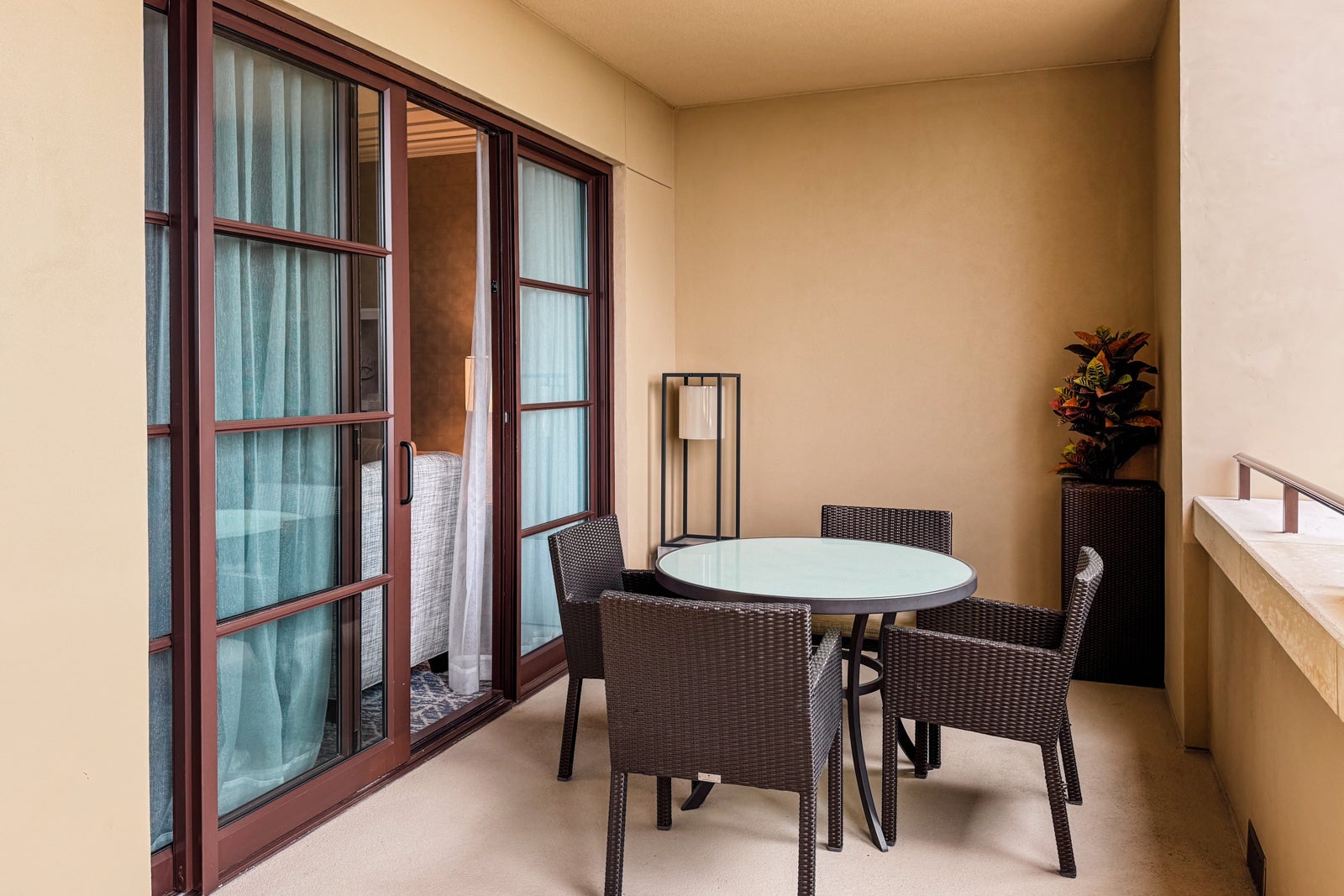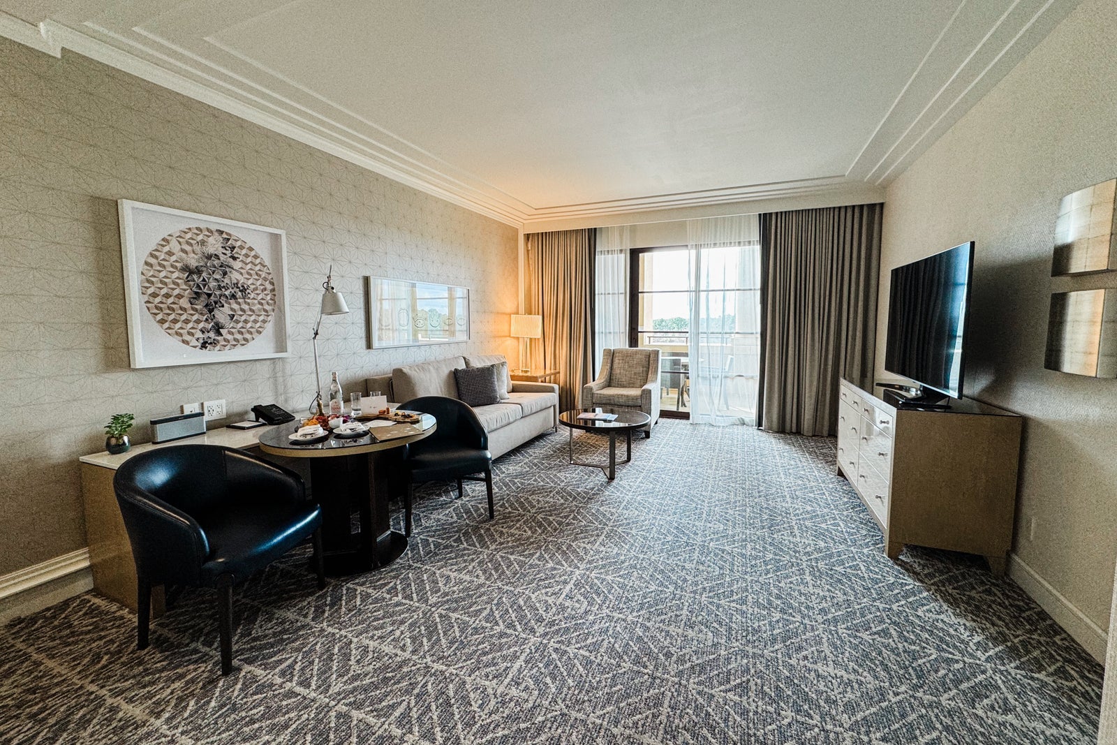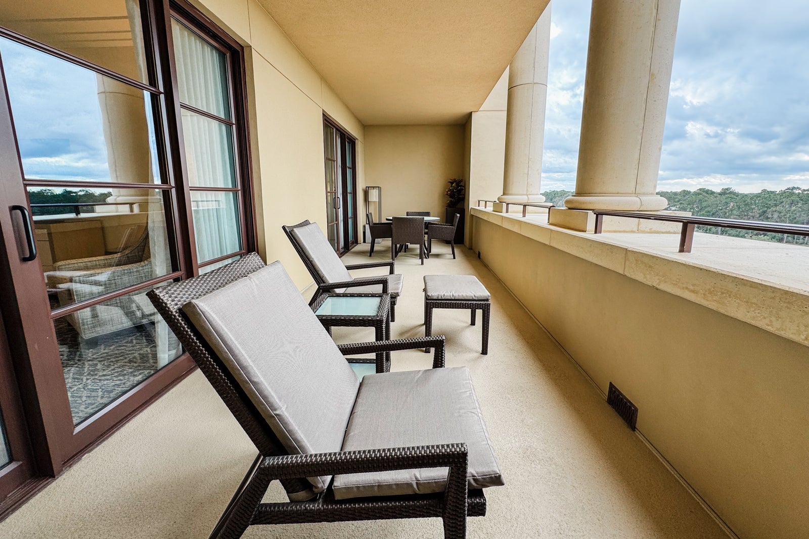 A large glass sliding door took up most of the far wall and led out to the expansive balcony, which ran the length of the suite and had a table and four chairs for alfresco meals, as well as two loungers. It could be accessed via either the living room or bedroom and looked out toward the Magic Kingdom.