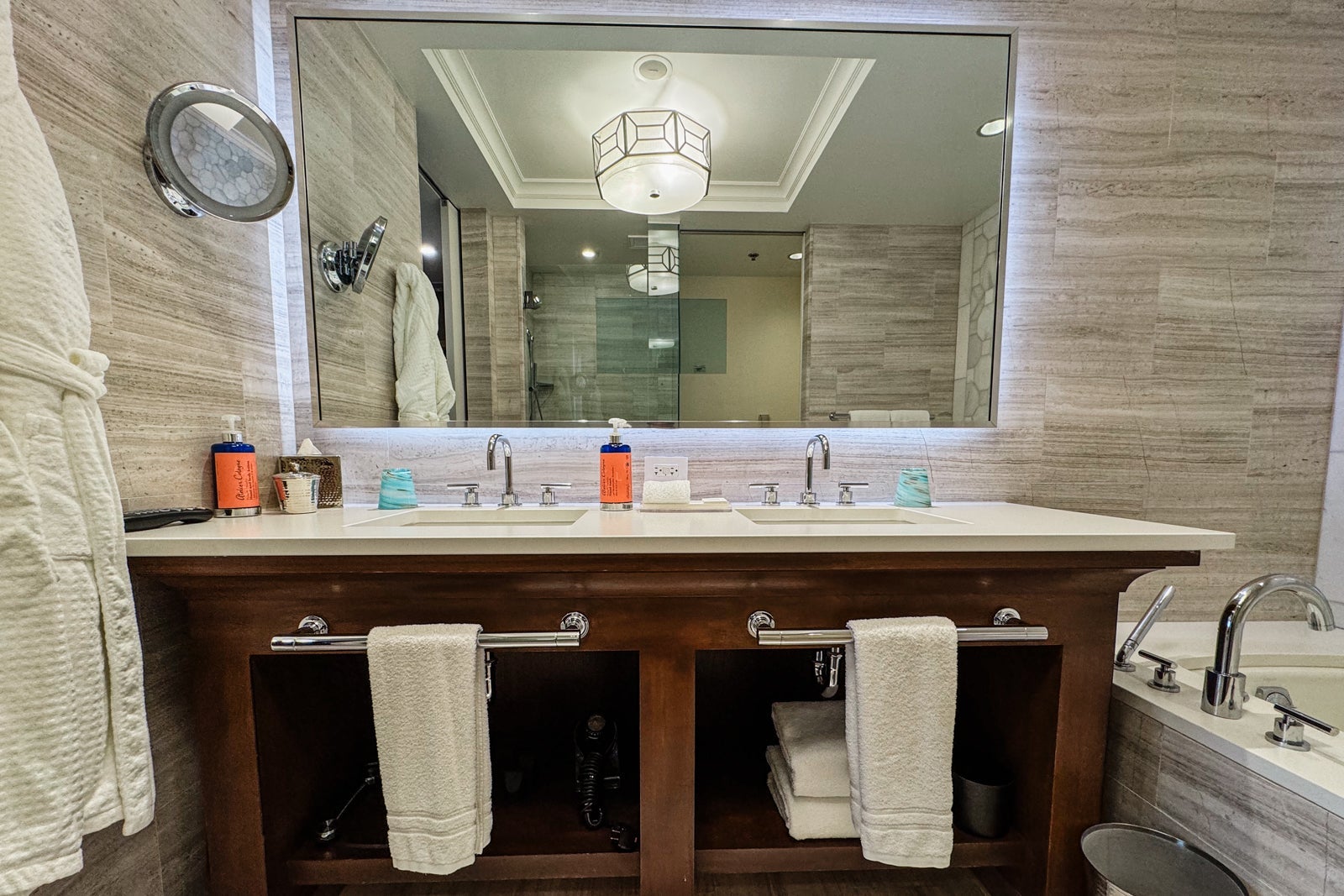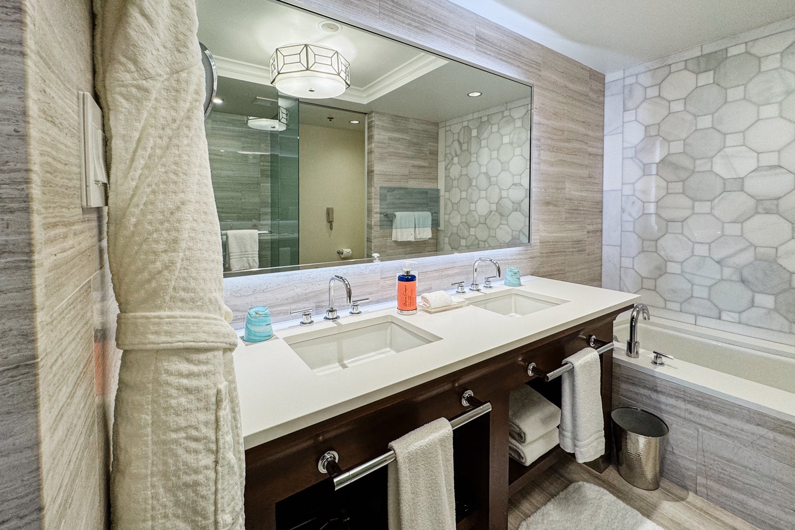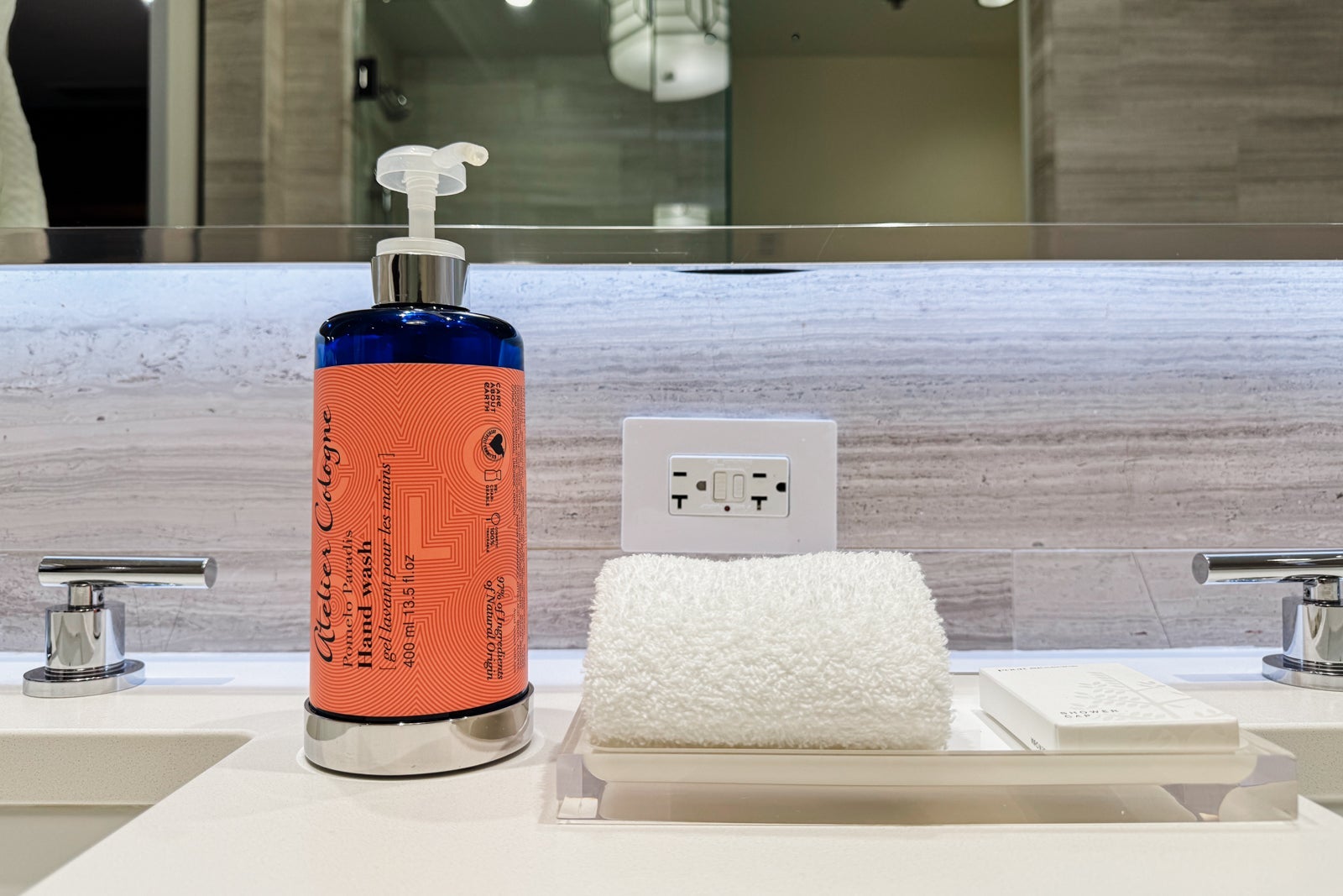 The bathroom had gleaming, gray-and-white marble tiling on the walls, floors and bath backsplash. The vanity held two sinks and a range of citrus-scented Atelier Cologne Pomelo Paradis products. There were also some amenities and toiletries available if you had left any essentials at home.