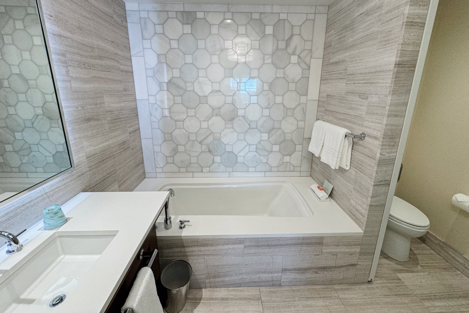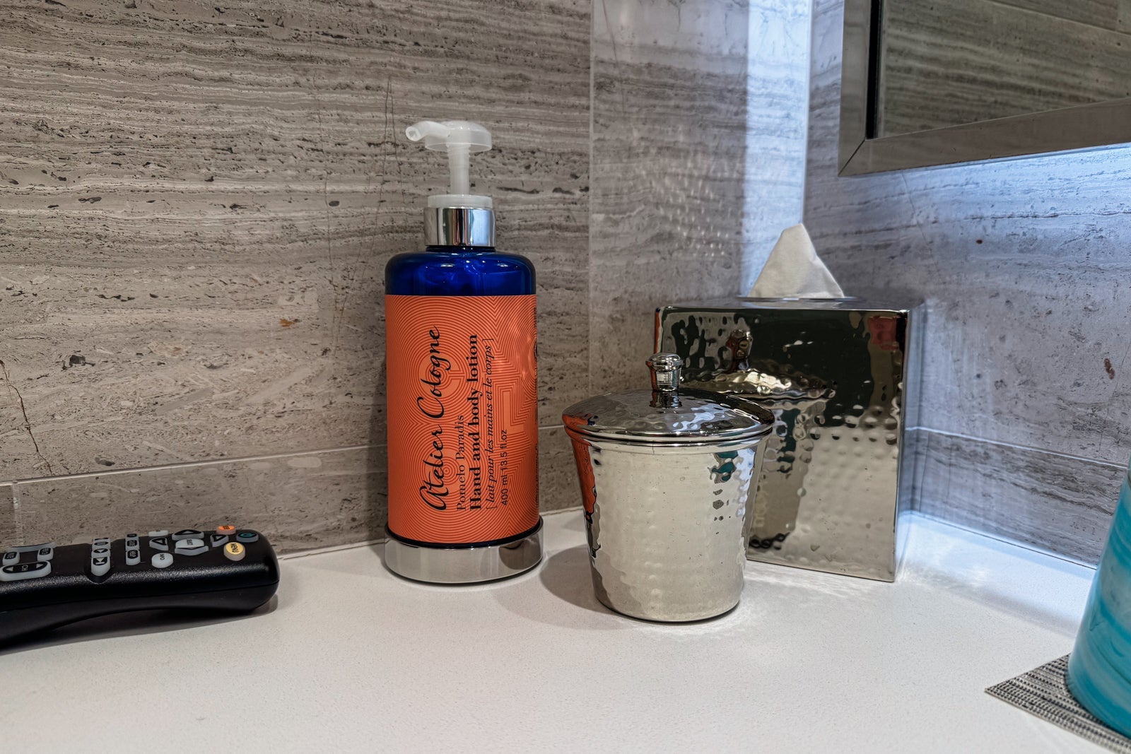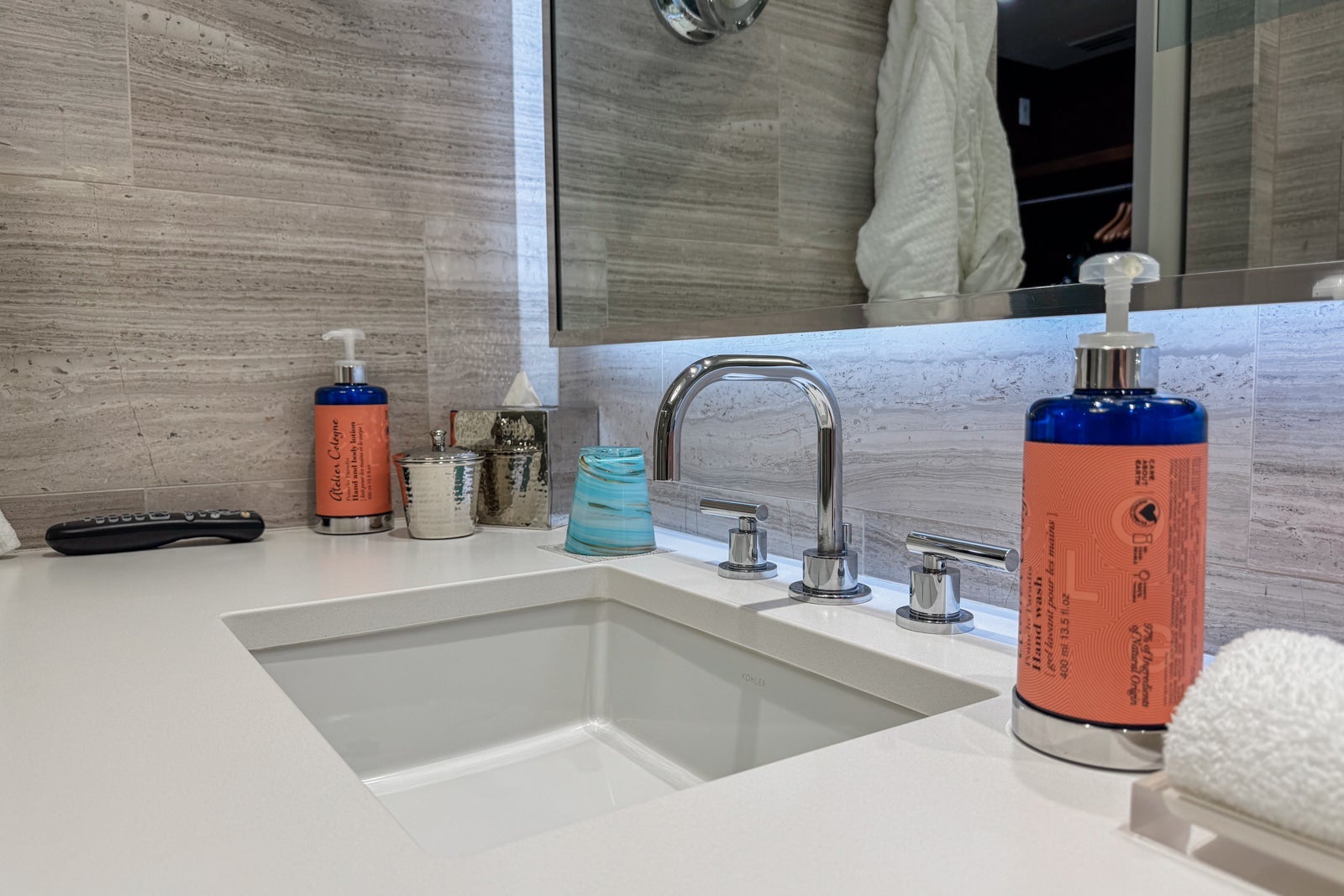 The bathroom had gleaming, gray-and-white marble tiling on the walls, floors and bath backsplash. The vanity held two sinks and a range of citrus-scented Atelier Cologne Pomelo Paradis products. There were also some amenities and toiletries available if you had left any essentials at home.