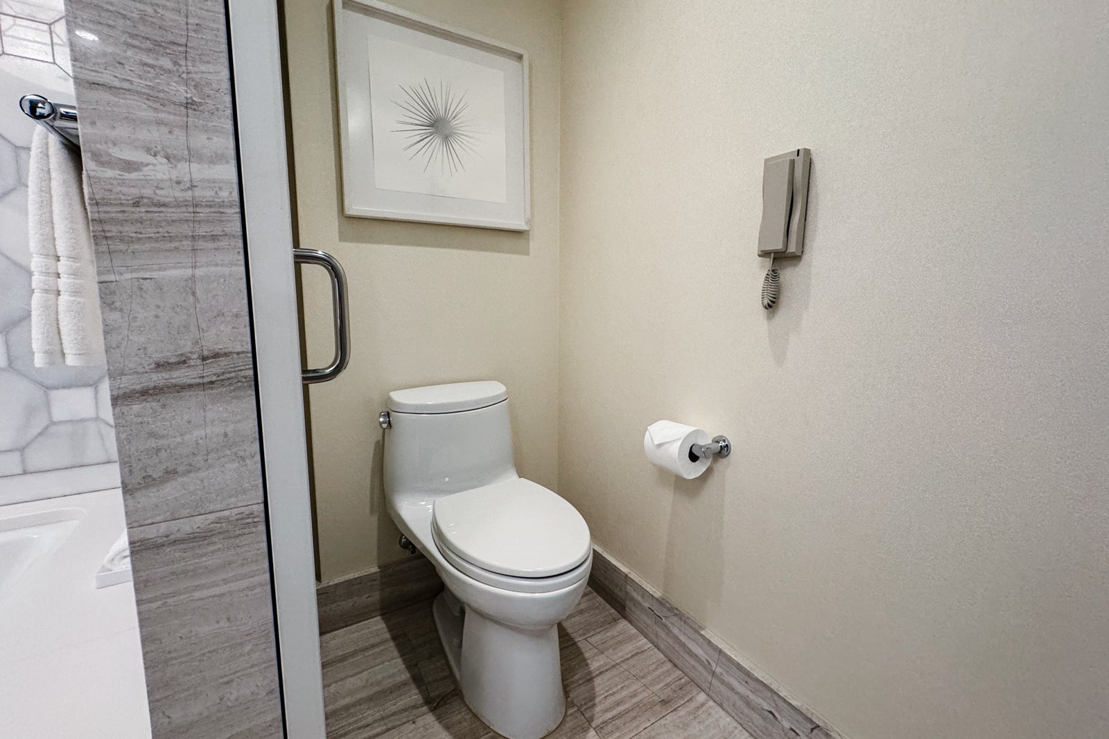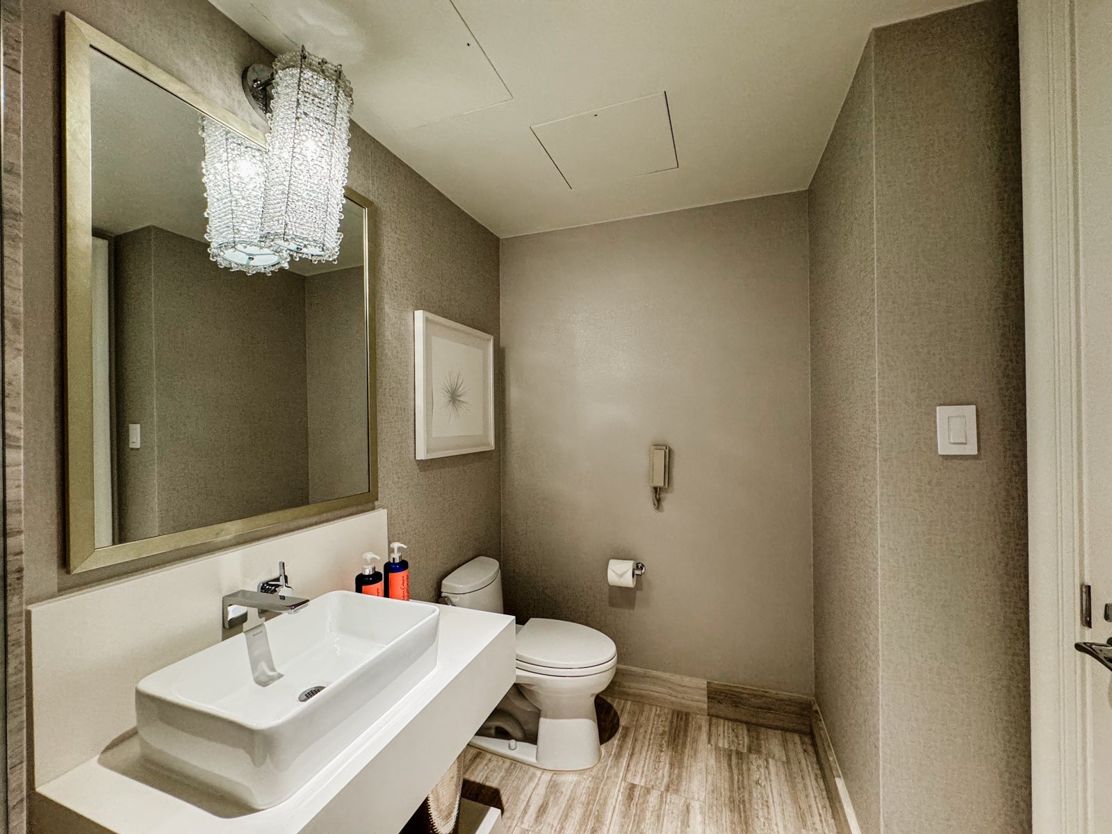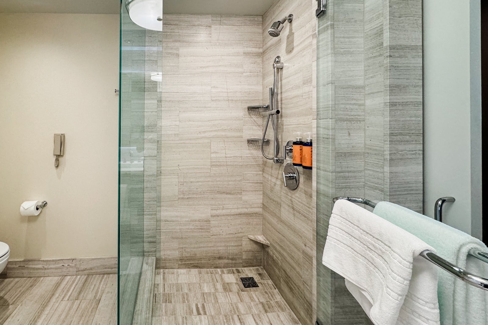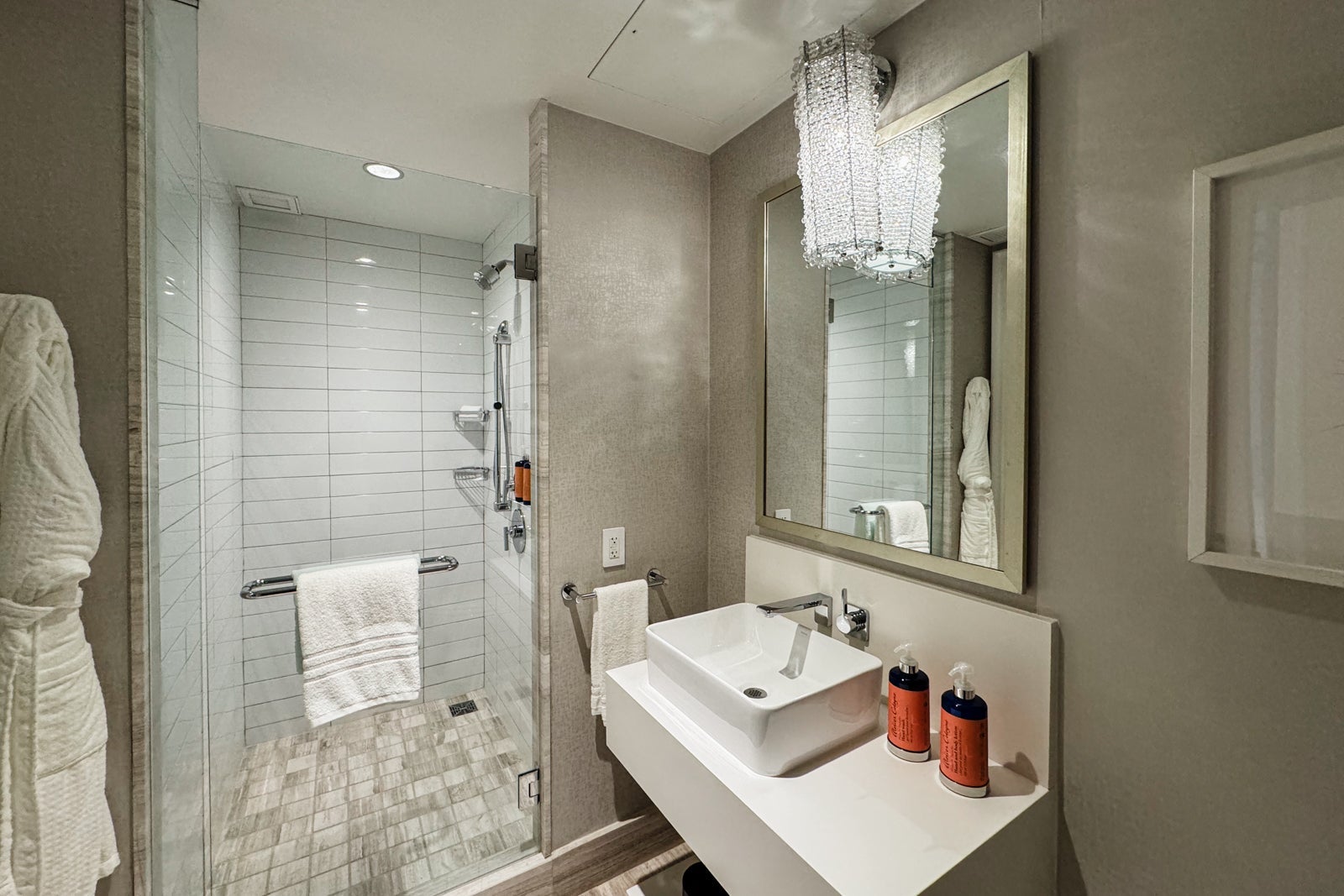 There was also a separate walk-in shower with a glass door and more Atelier Cologne products, and next to this was a private water closet holding the toilet.