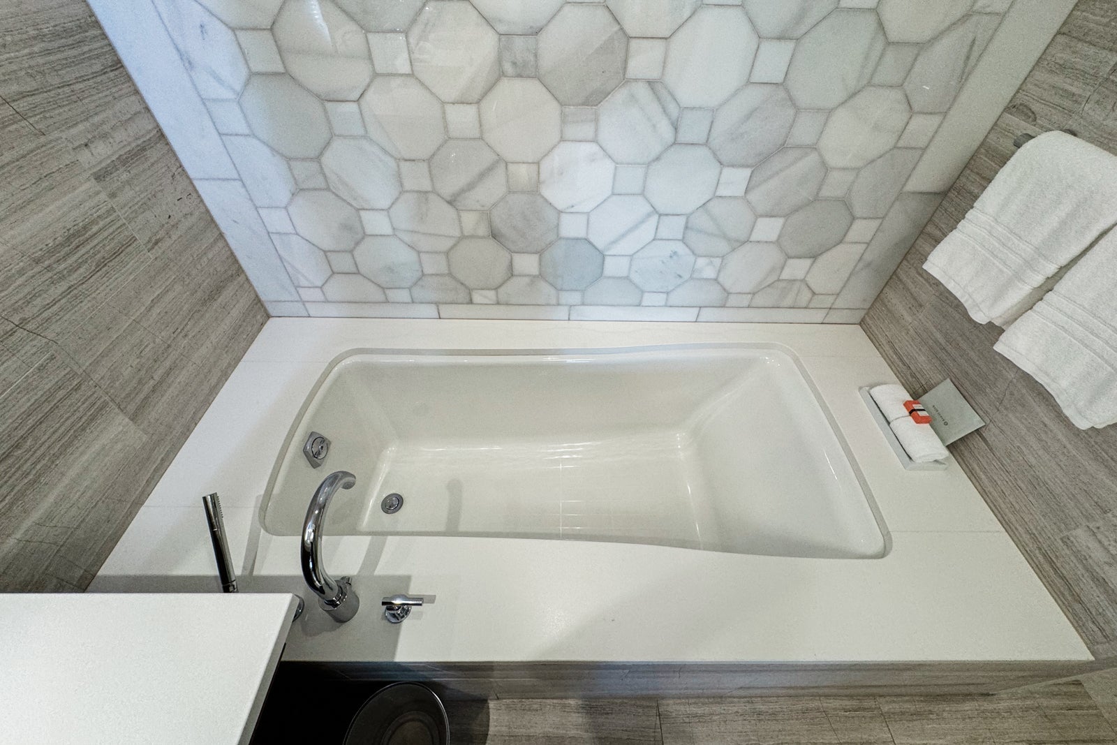 Beyond the sinks was a standard soaking tub with both a regular faucet and a hand-held showerhead.