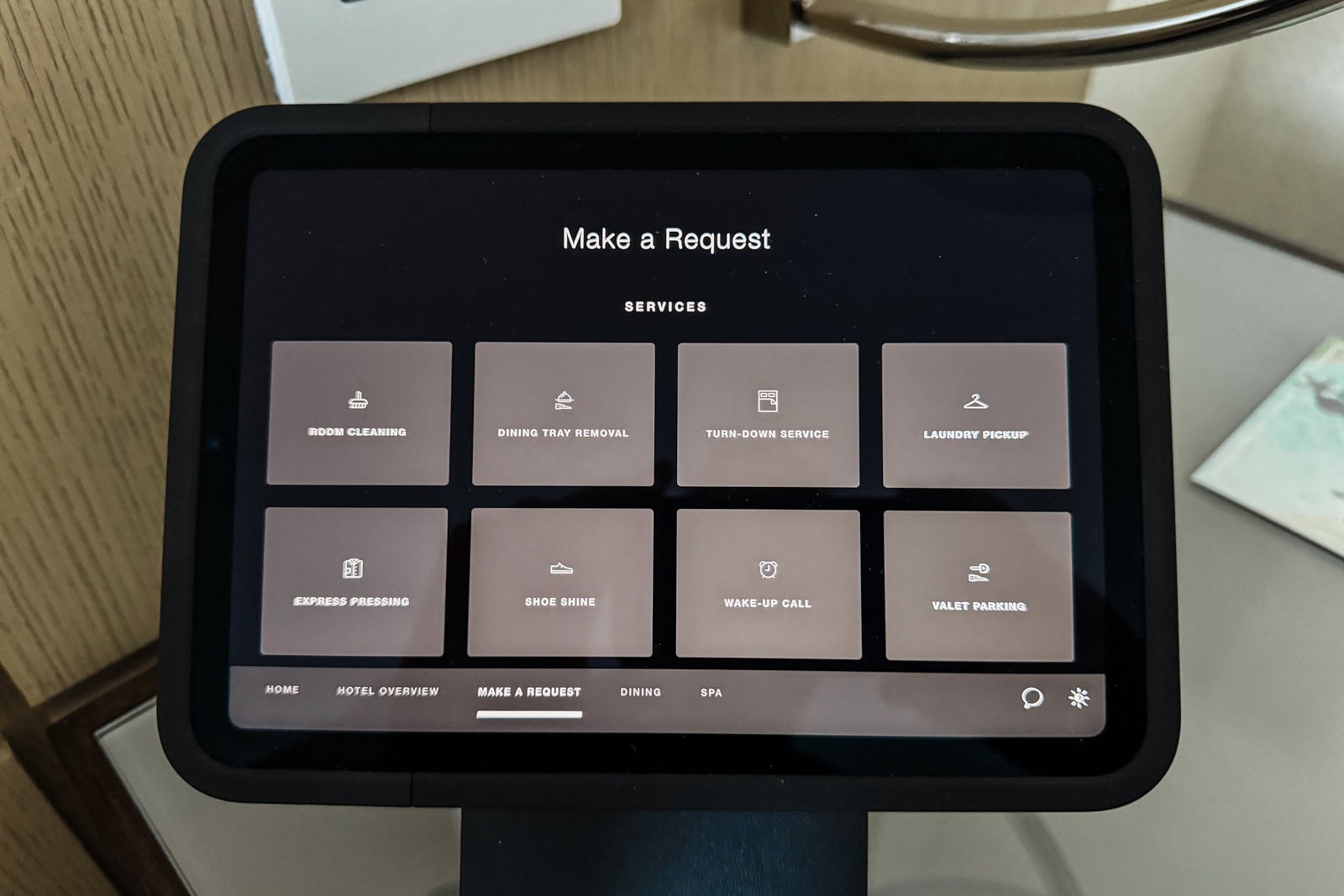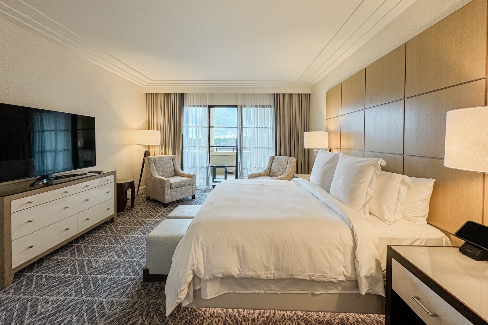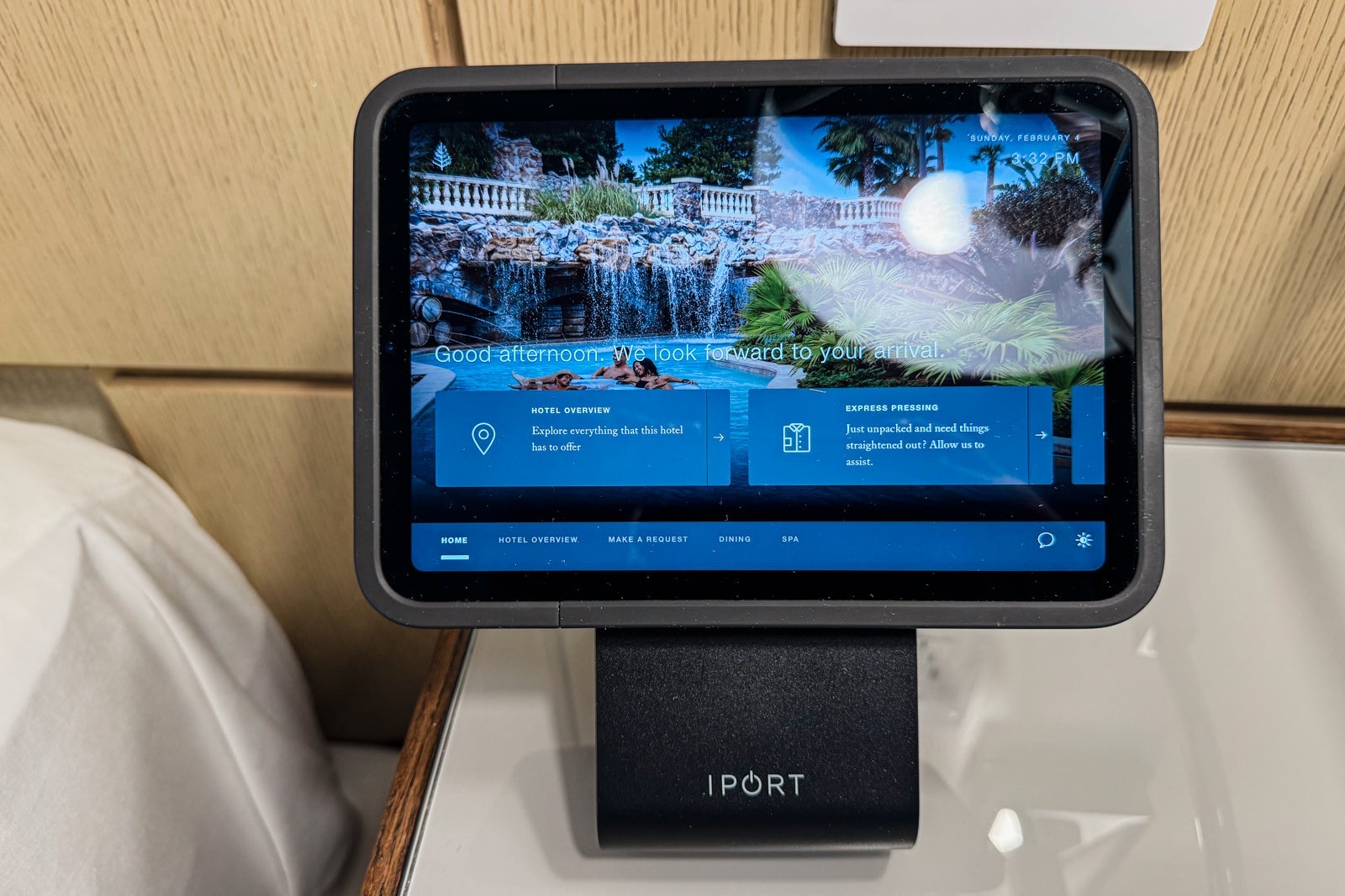 To either side of the bed were panels with light switches, power plugs and USB ports, as well as simple nightstands with reading lights. On one, I found a tablet through which I could peruse the resort's amenities and request services like housekeeping or for the valet to bring my car around.