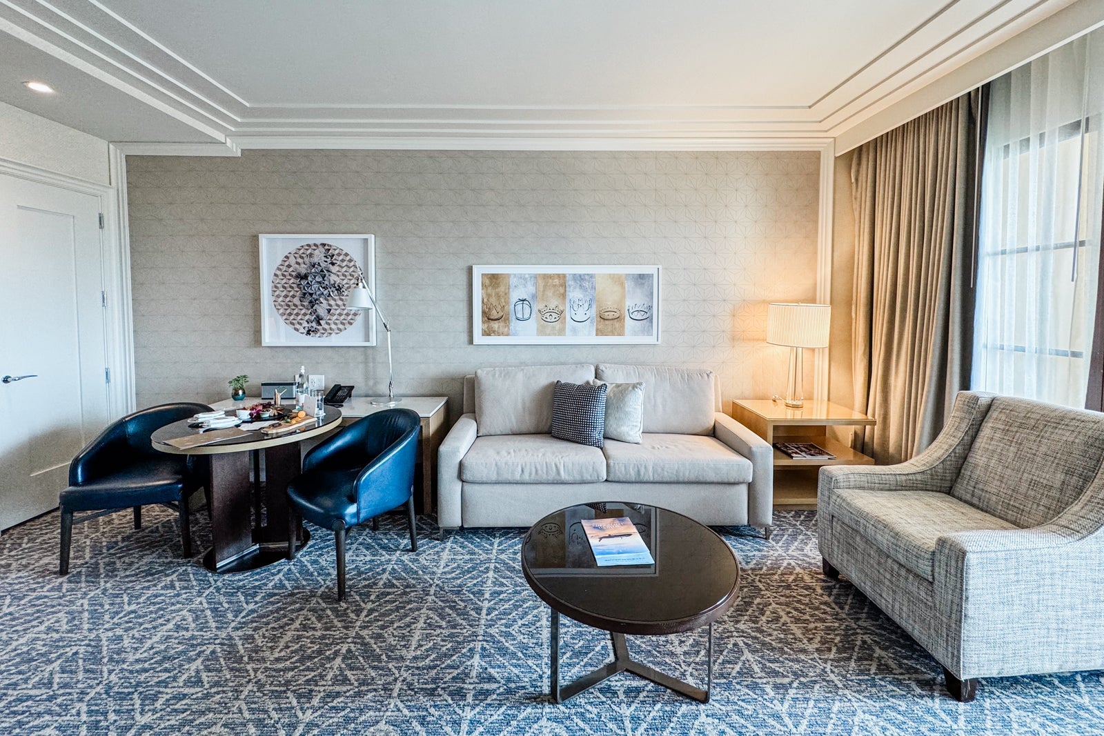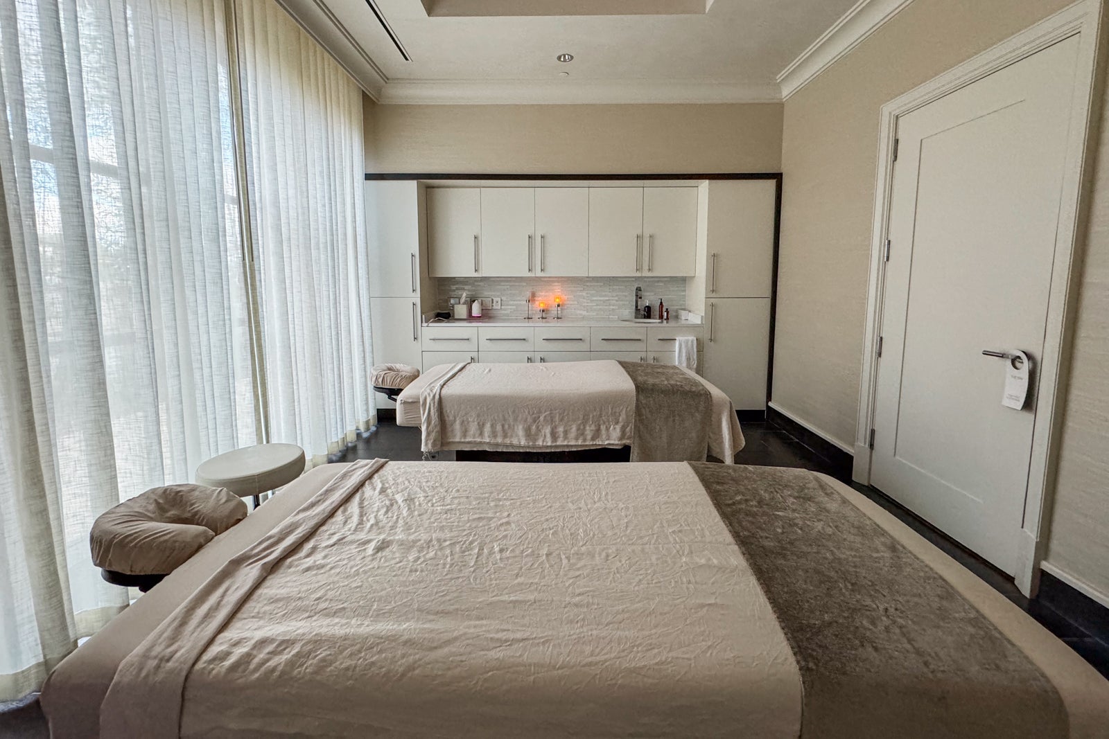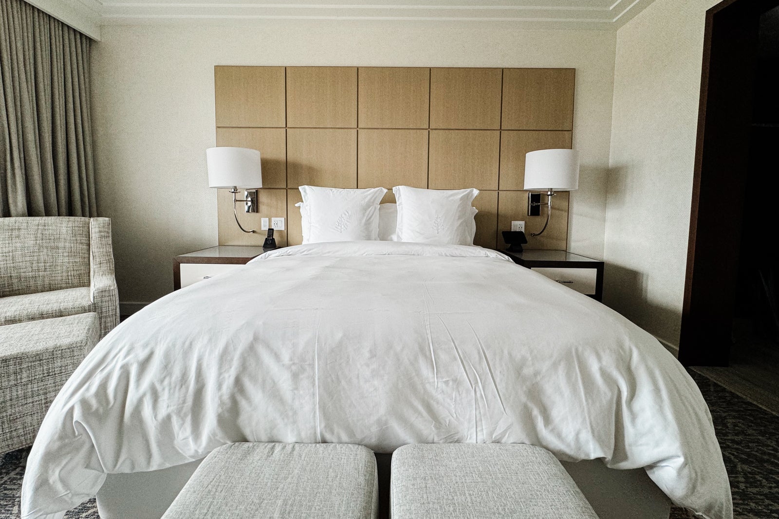 The bedroom was separated from the living room by a privacy door. Inside, I found a king-size bed dressed in the brand's signature white-on-white linens with the Four Seasons logo embroidered on the large shams. There were two convenient ottomans serving as a casual bench at the foot of the bed and, along the windows, another seating area composed of two armchairs and an additional ottoman. All the furnishings were in a tranquil palette of mainly cream and taupe tones with some silvery elements and blond wood thrown in.