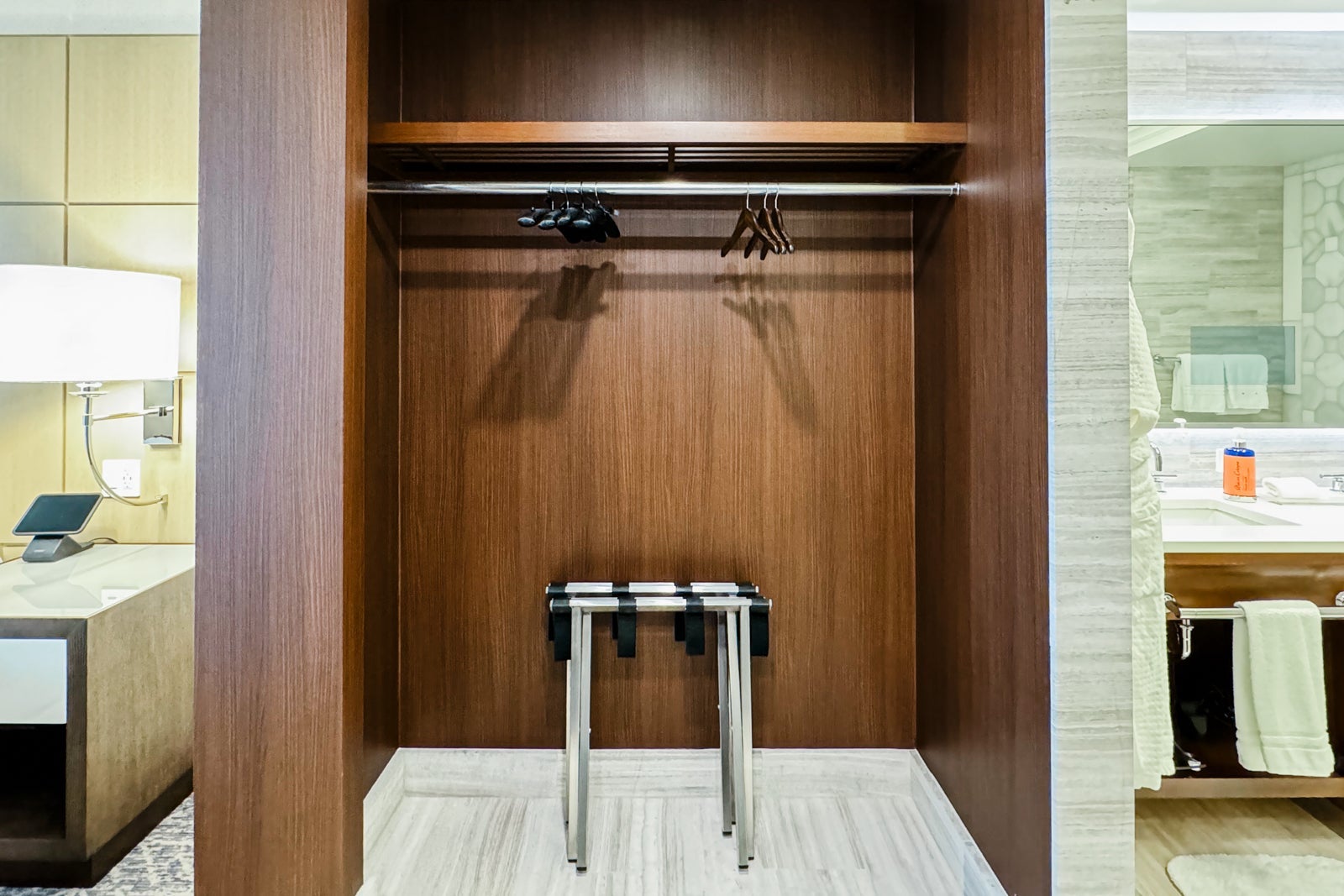 The closet lay between the bedroom and master bath, with plenty of space for luggage and both hanging and folded clothes.