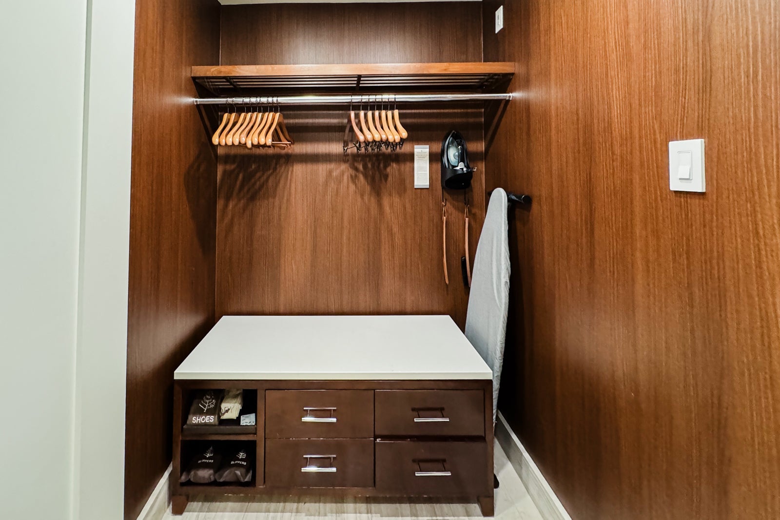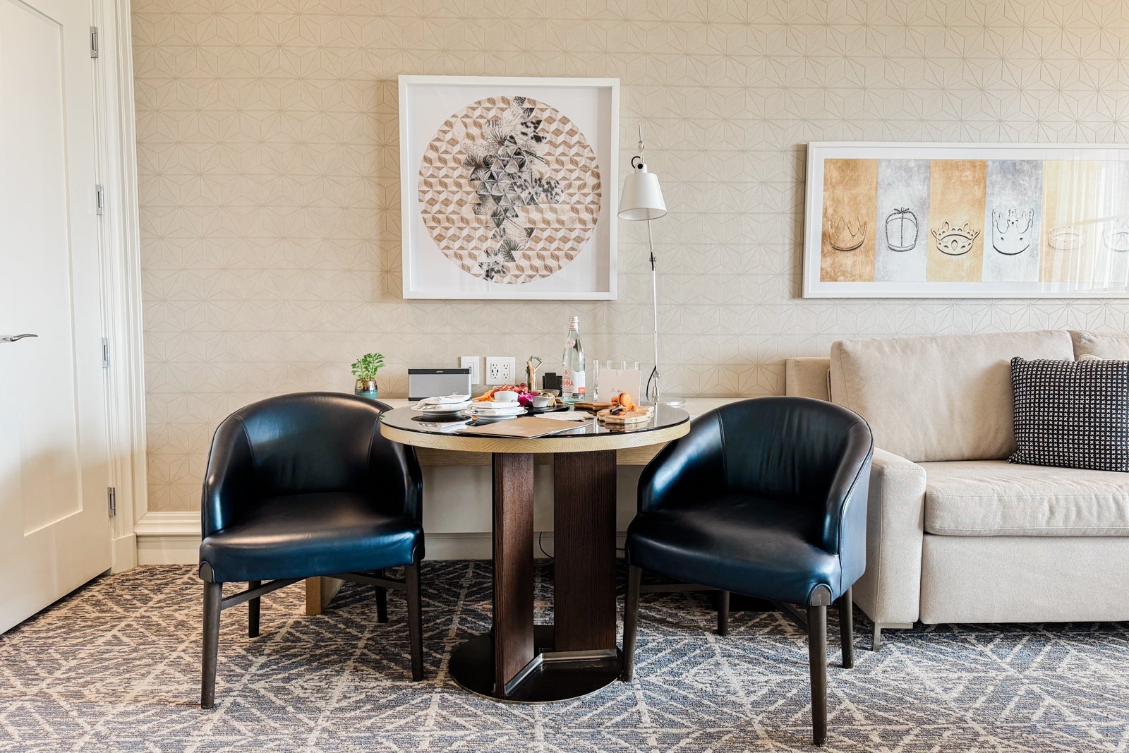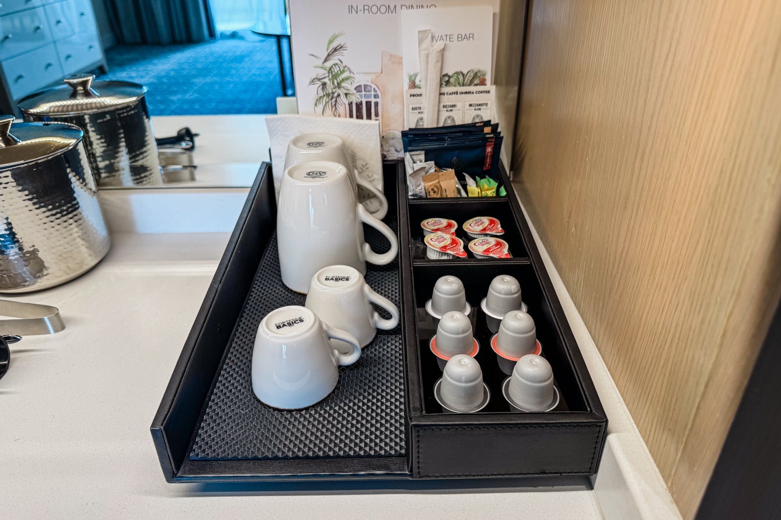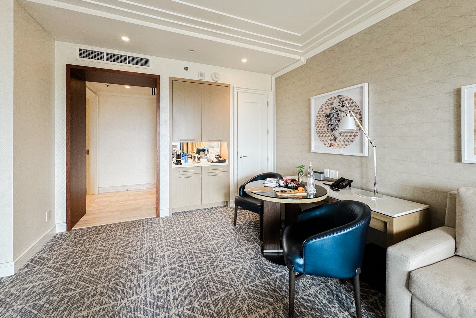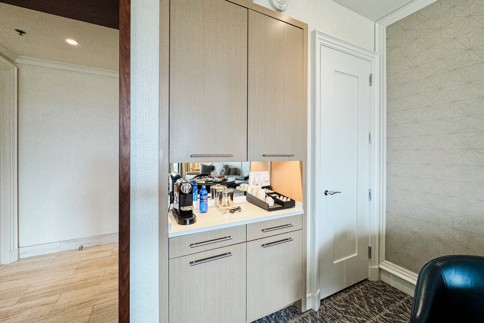 Near the little dining area, the minibar had a Nespresso machine and all the fixings so I could make myself coffee or tea in the morning. There was also a minifridge with two complimentary bottles of water. Other snacks and beverages were available upon request.