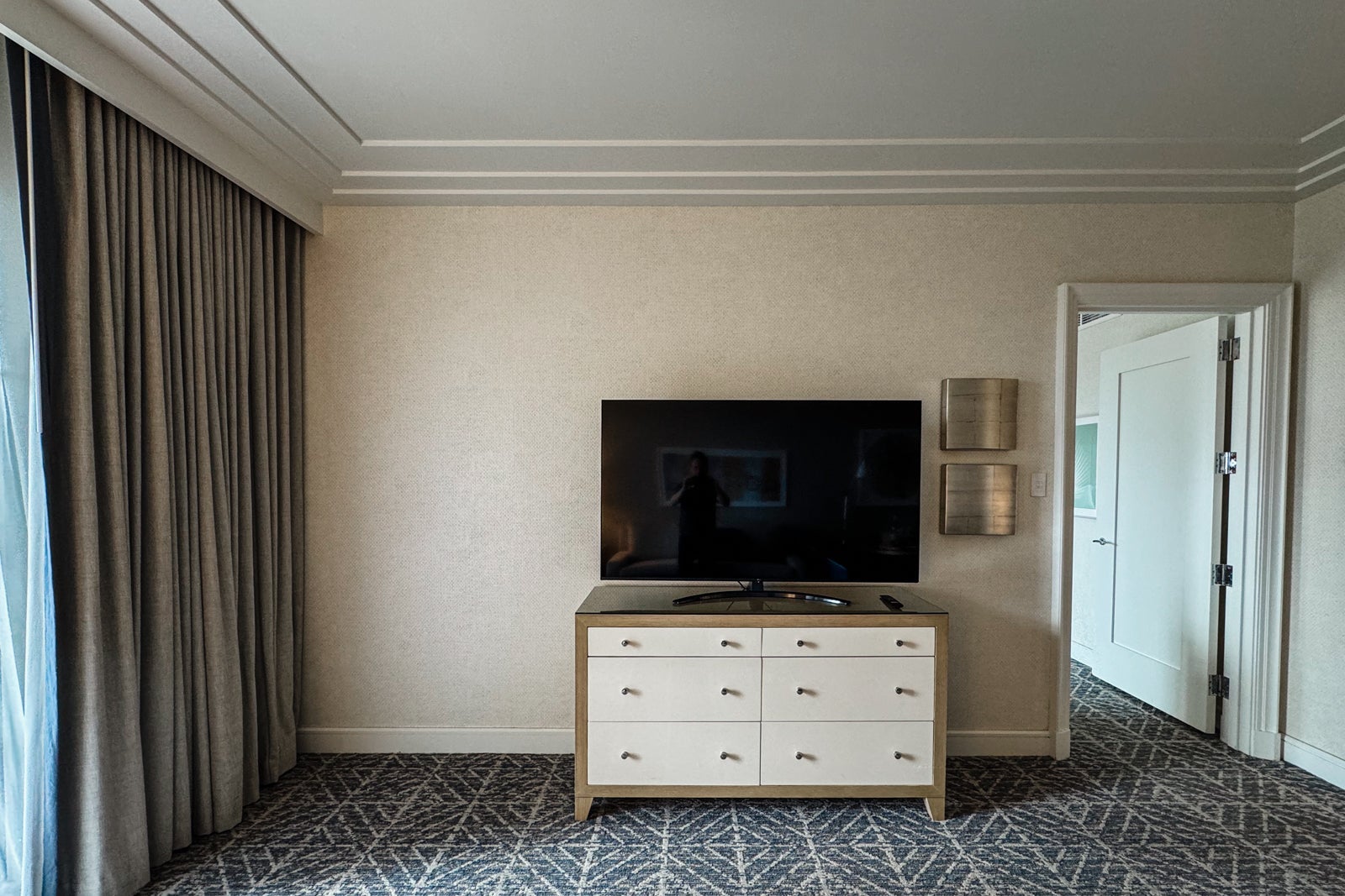 Turning left brought me into the main living room, which was a large space. On the near side, a table and two chairs were set along a credenza that also held a Bluetooth speaker and a notepad, basically doubling as a work desk. Beyond that, a sofa bed and an armchair comprised a cozy vignette and faced a chest of drawers with a large flat-screen TV perched atop it.