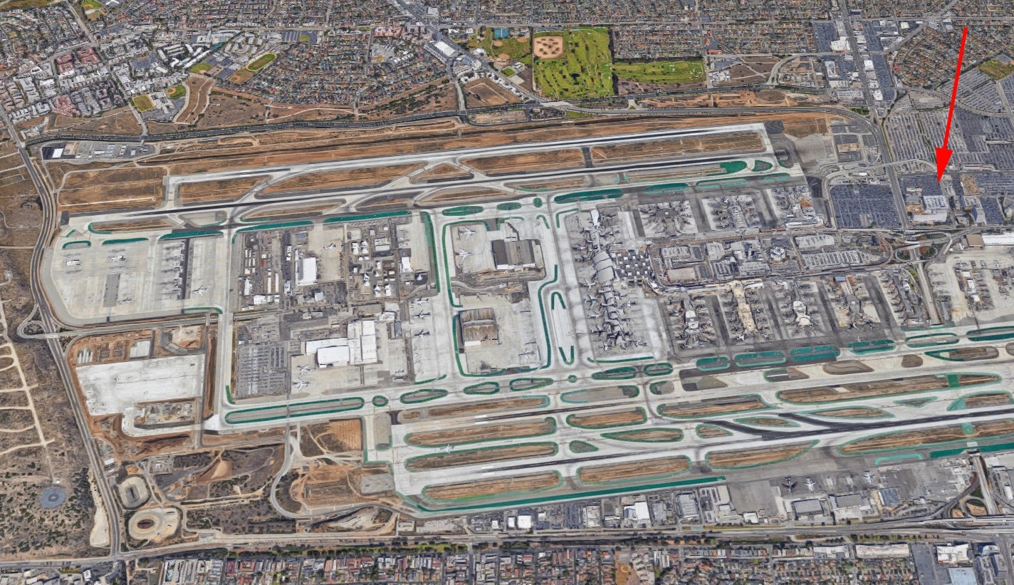 Landing at LAX, you'll easily see the building out of your airplane's window, seconds before touchdown. The blue lightning patterns on all sides of the building are unmistakable.