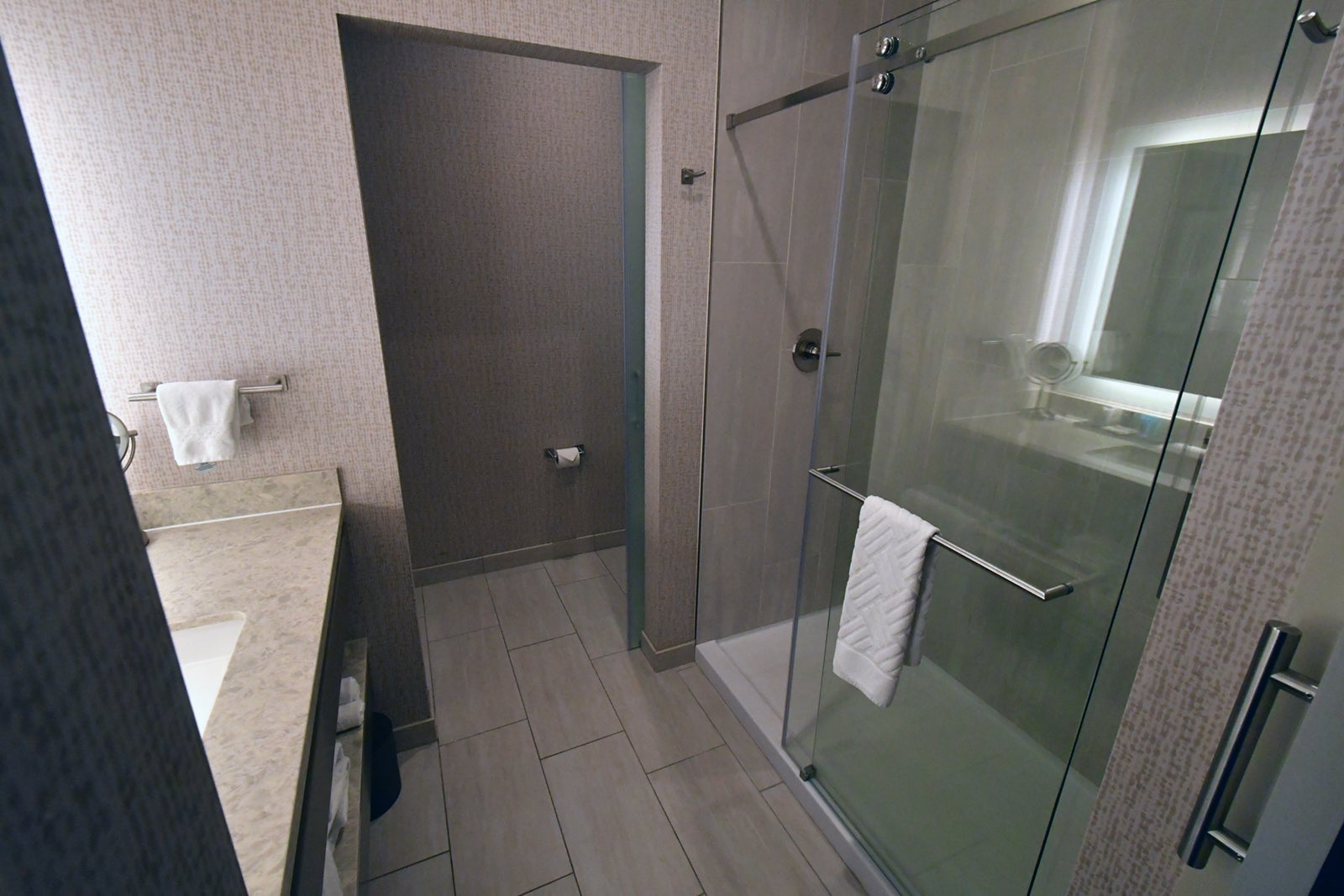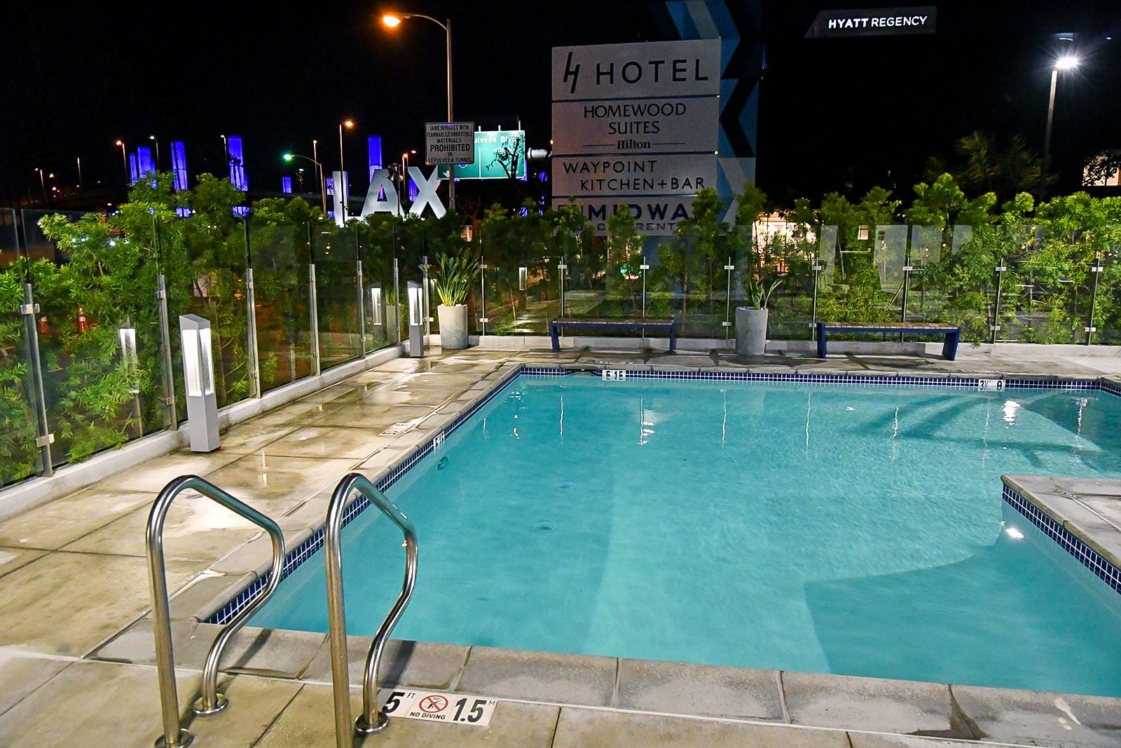 The small gym on the 12th floor looked out to the north as well, and you could work out in full view of landing planes. You could swim, too, at a small pool the H and Homewood Suites share on the ground level. It was heated but open-air.