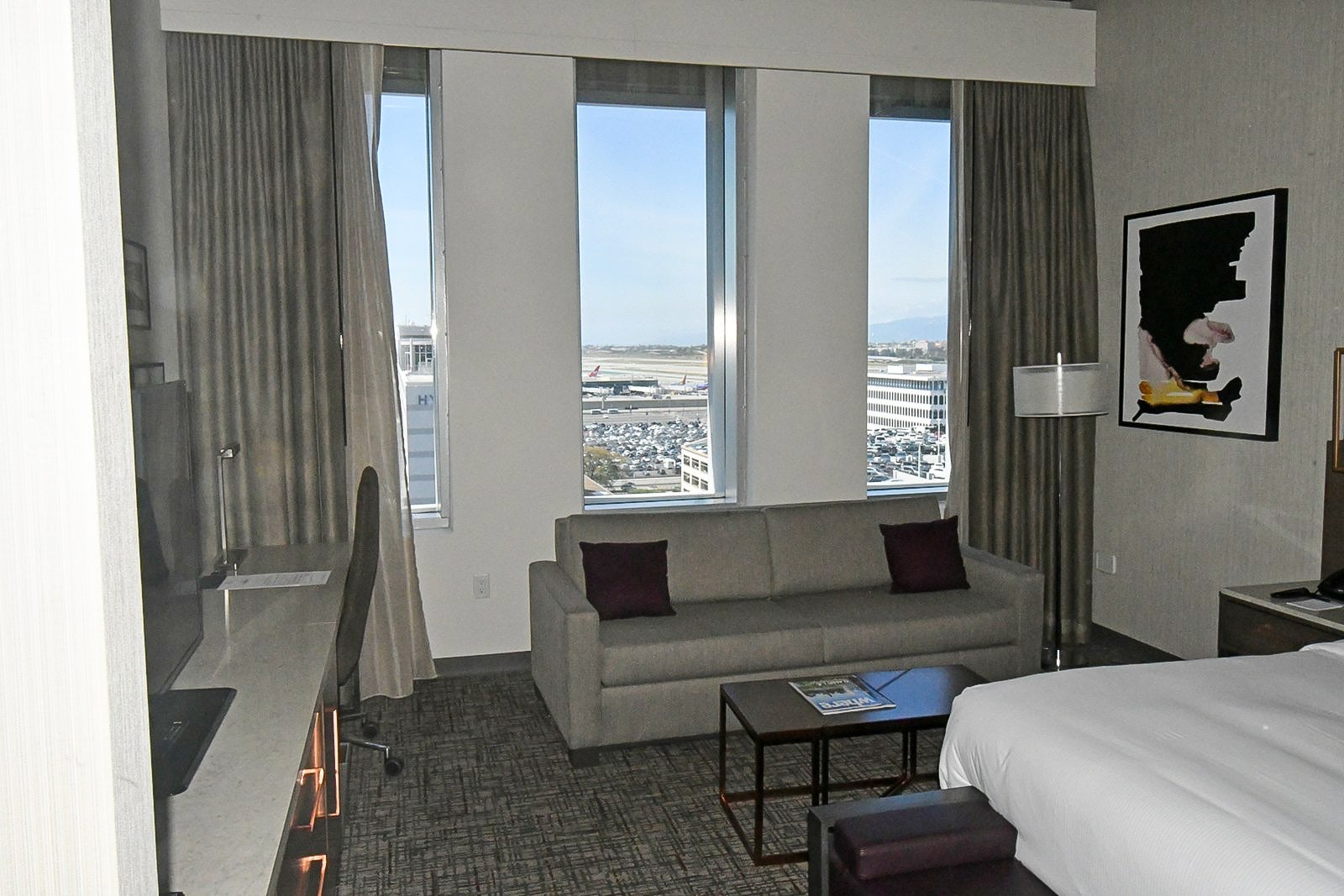 I had asked to confirm that I would get a top floor facing the airport, and was accommodated easily. I got Room 1227, a deluxe king room, airport view, on the top floor, the 12th. The decor and furniture were streamlined, no-frills contemporary, but pretty bland overall. I'd expected something more unique from a hotel describing itself as "an elevated LA experience for sophisticated travelers."