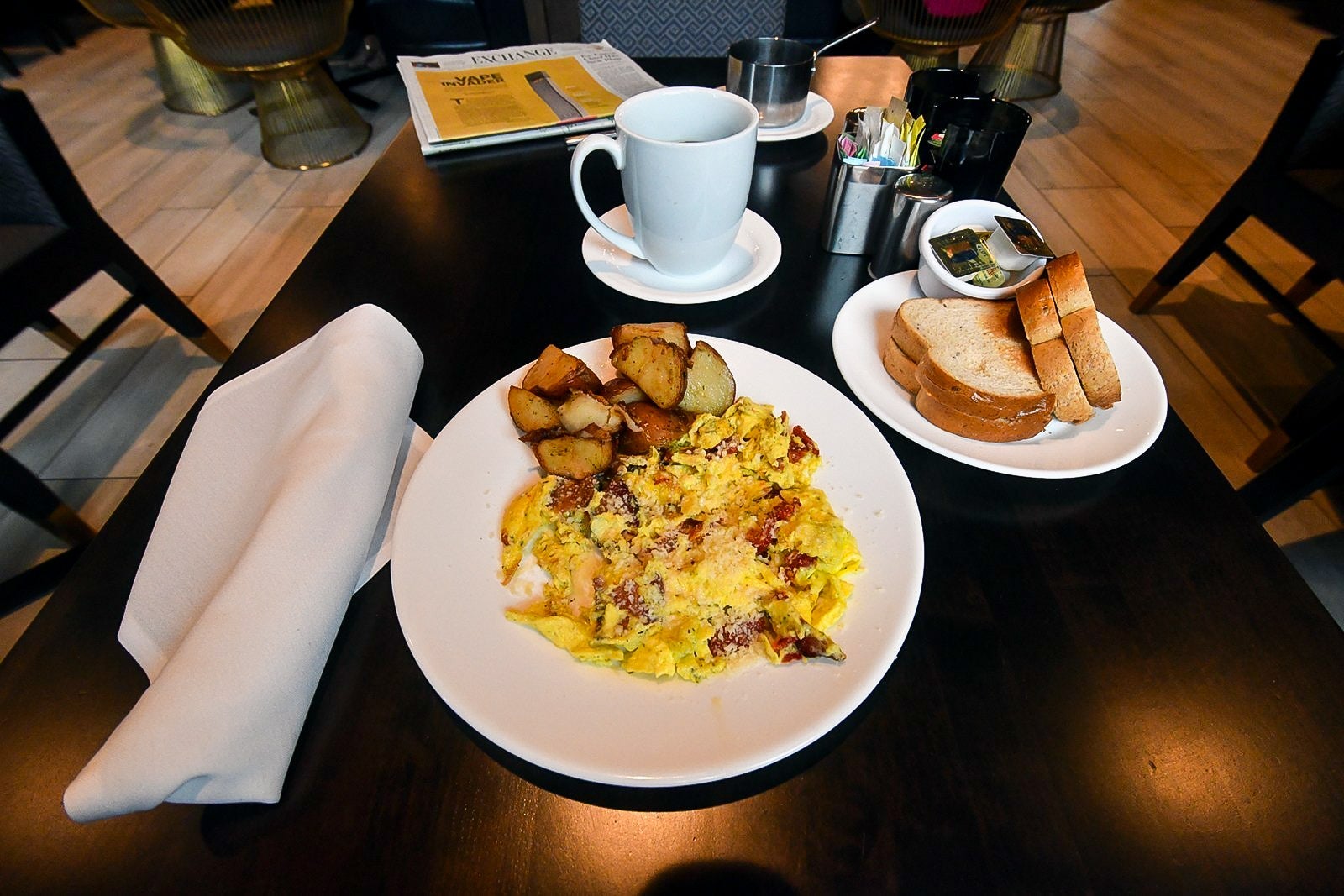 You could either eat at the Waypoint restaurant on the ground floor or have room service, with the exact same menu. (Room service isn't 24 hours; a self-serve mini-market in the lobby is.) At 7:30pm on Friday, I walked into a very loud Waypoint, waited a long time to be seated despite several open tables, ordered a hamburger with a side of sauteed spinach, and found it barely worthy of a passing grade: a home cook's hurried weeknight burger. The next day, a rosemary roast chicken with bacon mashed potatoes was just as mediocre. The Tuscan scrambled eggs I had at breakfast, with sundried tomatoes and pesto olive oil, were unaccountably sweet. But without wheels and with a Subway sandwich shop the only other option on the premises, I was pretty much stuck with the Waypoint.