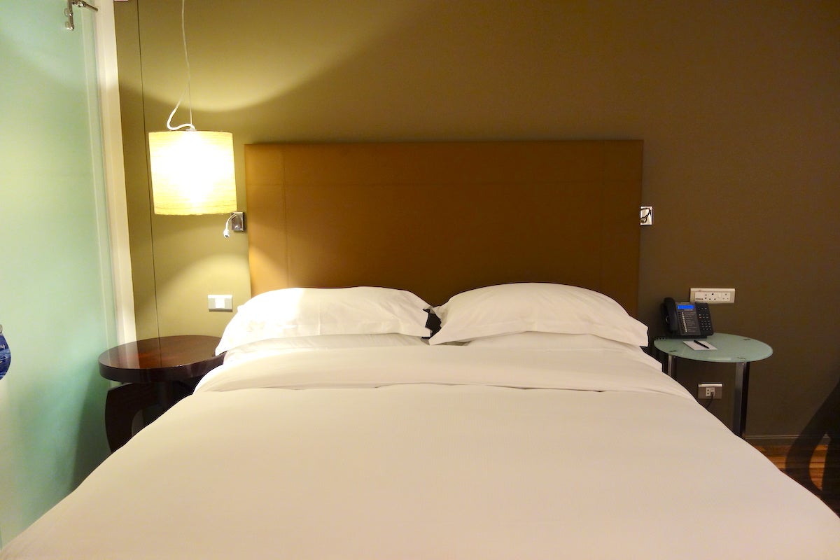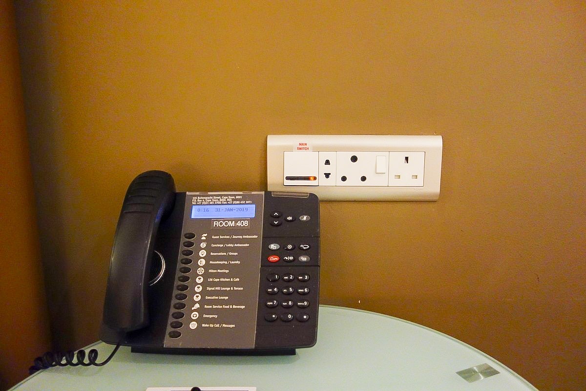 The nightstand on one side held the room phone, with 11 buttons for various services, and the wall behind it had a panel of electrical outlets in various shapes for different countries.