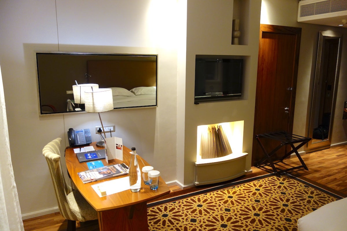 Next to that was a wooden work desk with its own phone and the room compendium. It also held a note from the hotel manager suggesting I store all valuables and electronics in the safe at all times and not leave them out in the open or my suitcase "at any time." I thought the complimentary bottle of water and a box containing two Tomes chocolate truffles were nice touches.