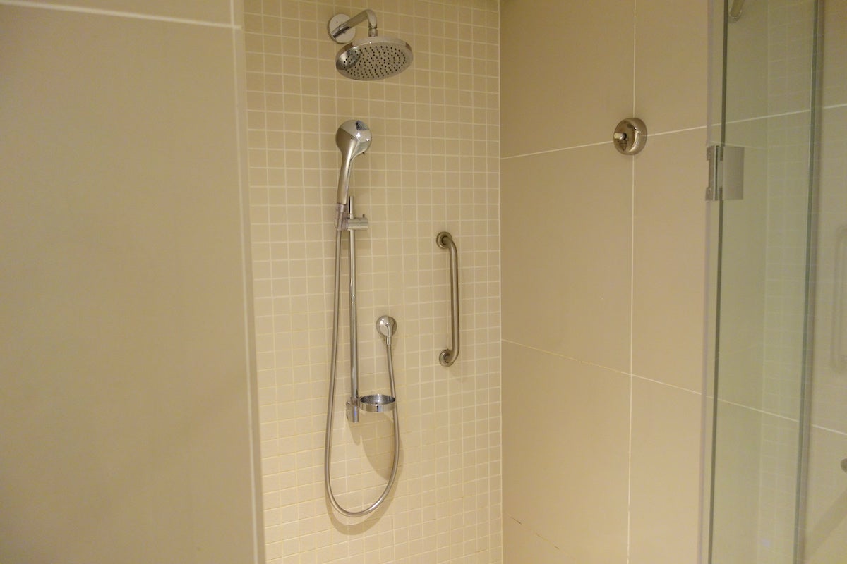The shower had plain, grayish tiling and both wall-mounted and handheld shower heads.
