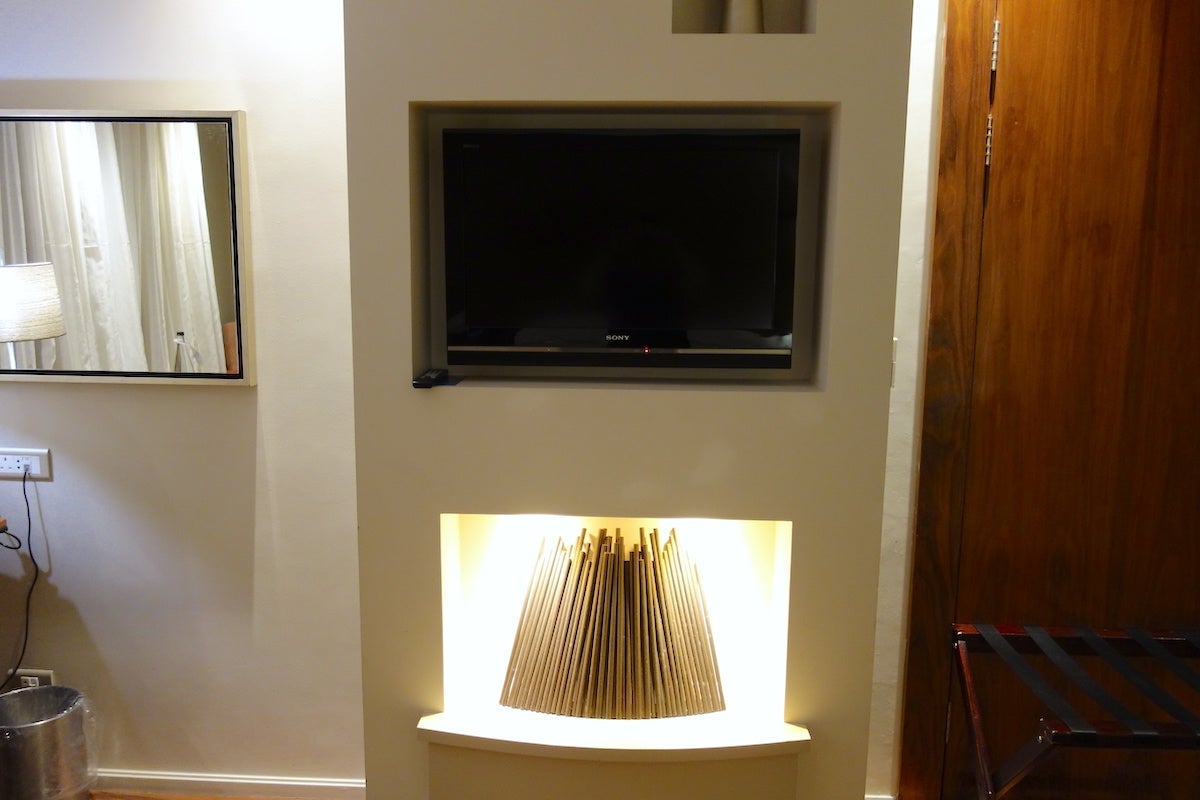 Across from the bed was a fixture that looked like it was supposed to resemble a fireplace, though it just had metal rods and accent lighting.