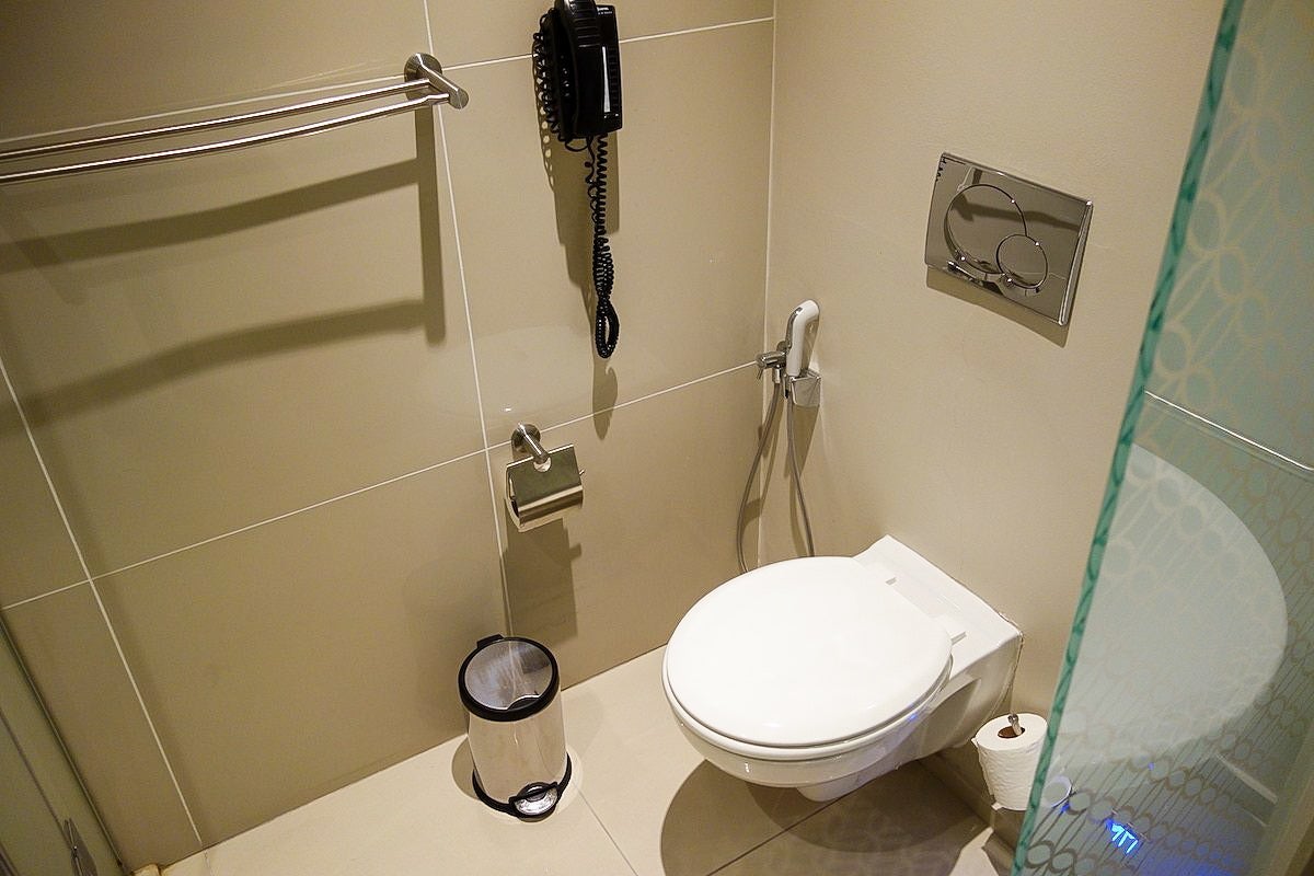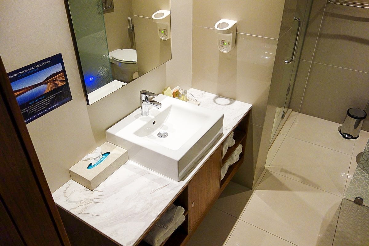 On the side of the room opposite the sink was a full-size bathtub, though there was also a note asking guests to consider not using it because of the city's water shortage.