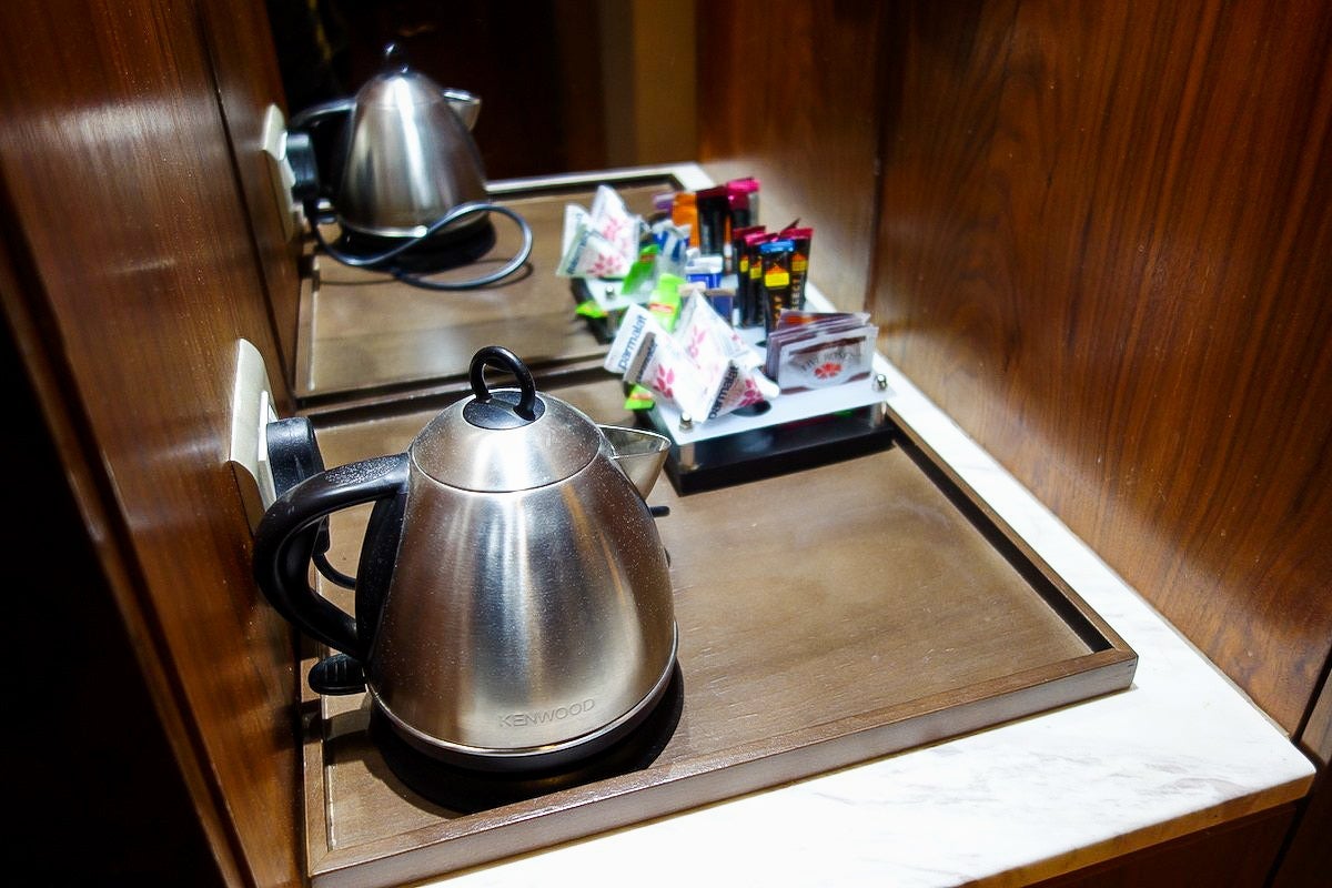 Just past this, the minibar consisted of a shelf with coffee- and tea-making supplies.