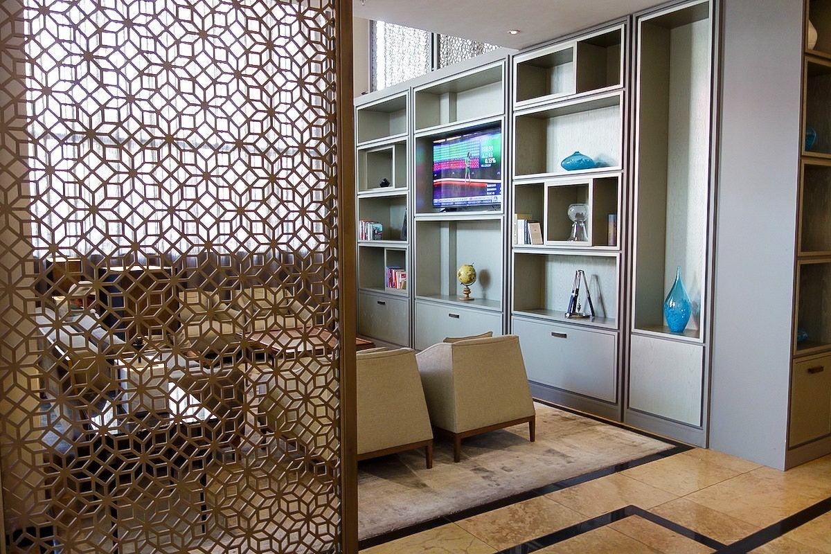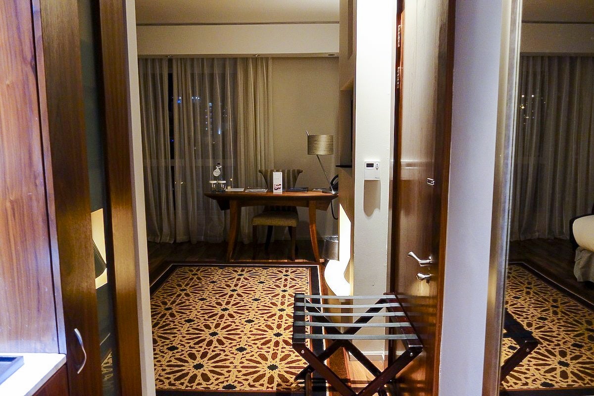 I liked the wooden flooring, which gave the room an elegant look, and the Middle Eastern-inspired carpeting with geometric patterning.