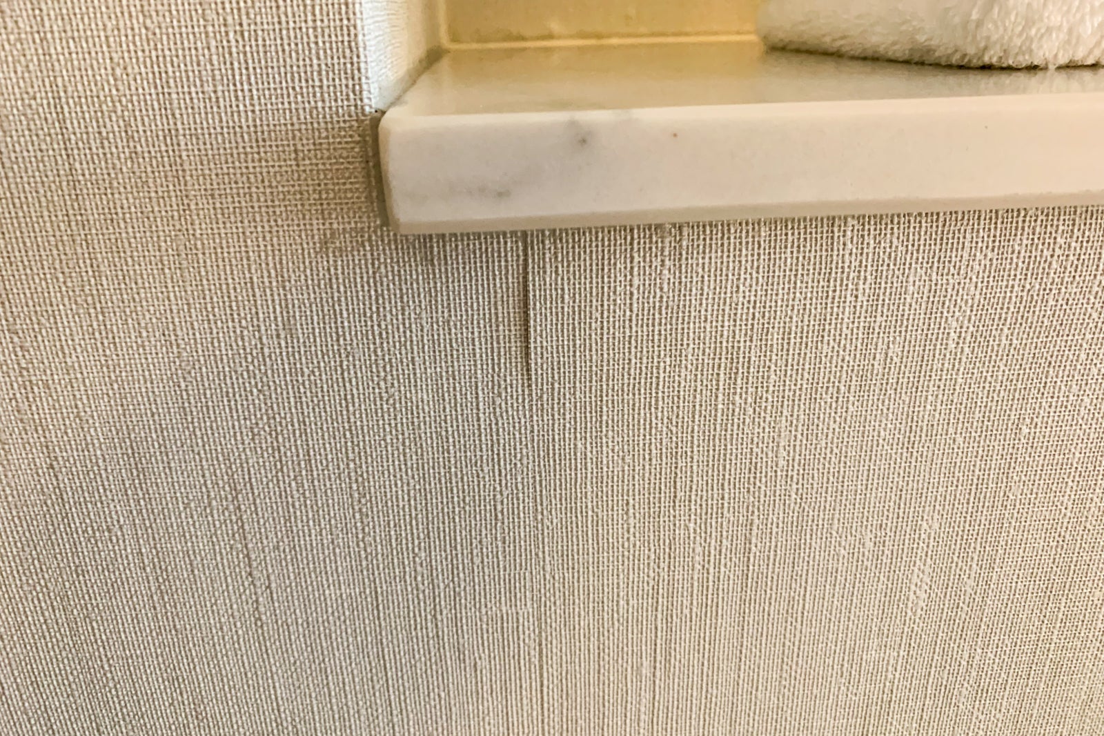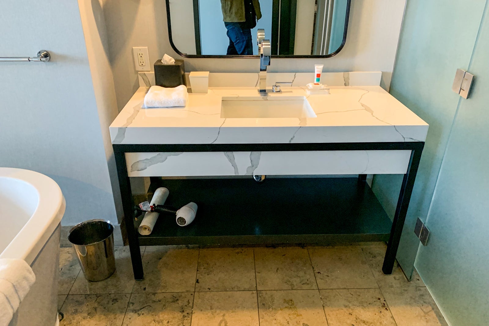 The rooms at the 1000 are spacious and modern with white walls with gray accents. There is marble on the table tops and in the bathroom sink and shower.