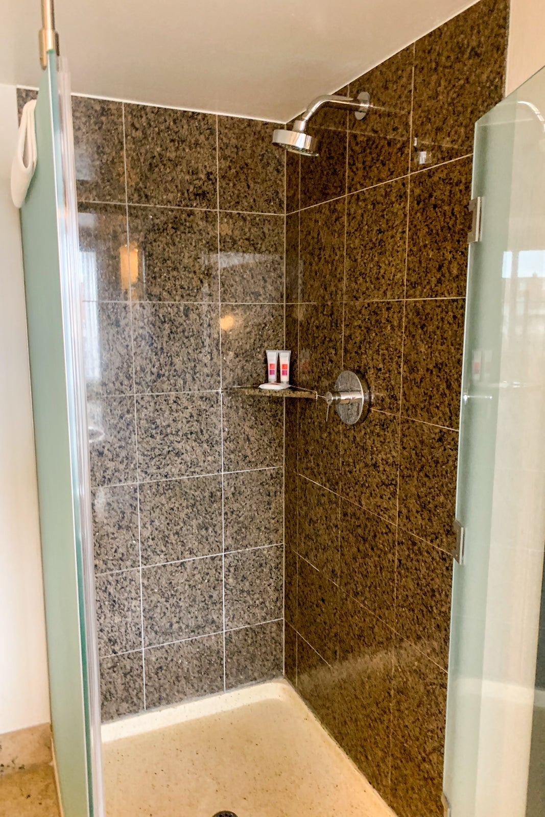 The shower was nice. The water pressure was good (not great), but it was plenty tall and the shower door opened out with no major leakage.