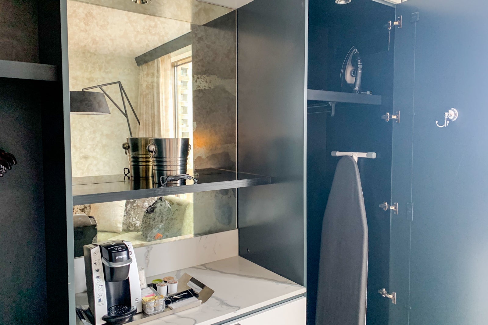 The two closets were connected by a marble-topped cabinet with a Keurig machine to make coffee or tea.