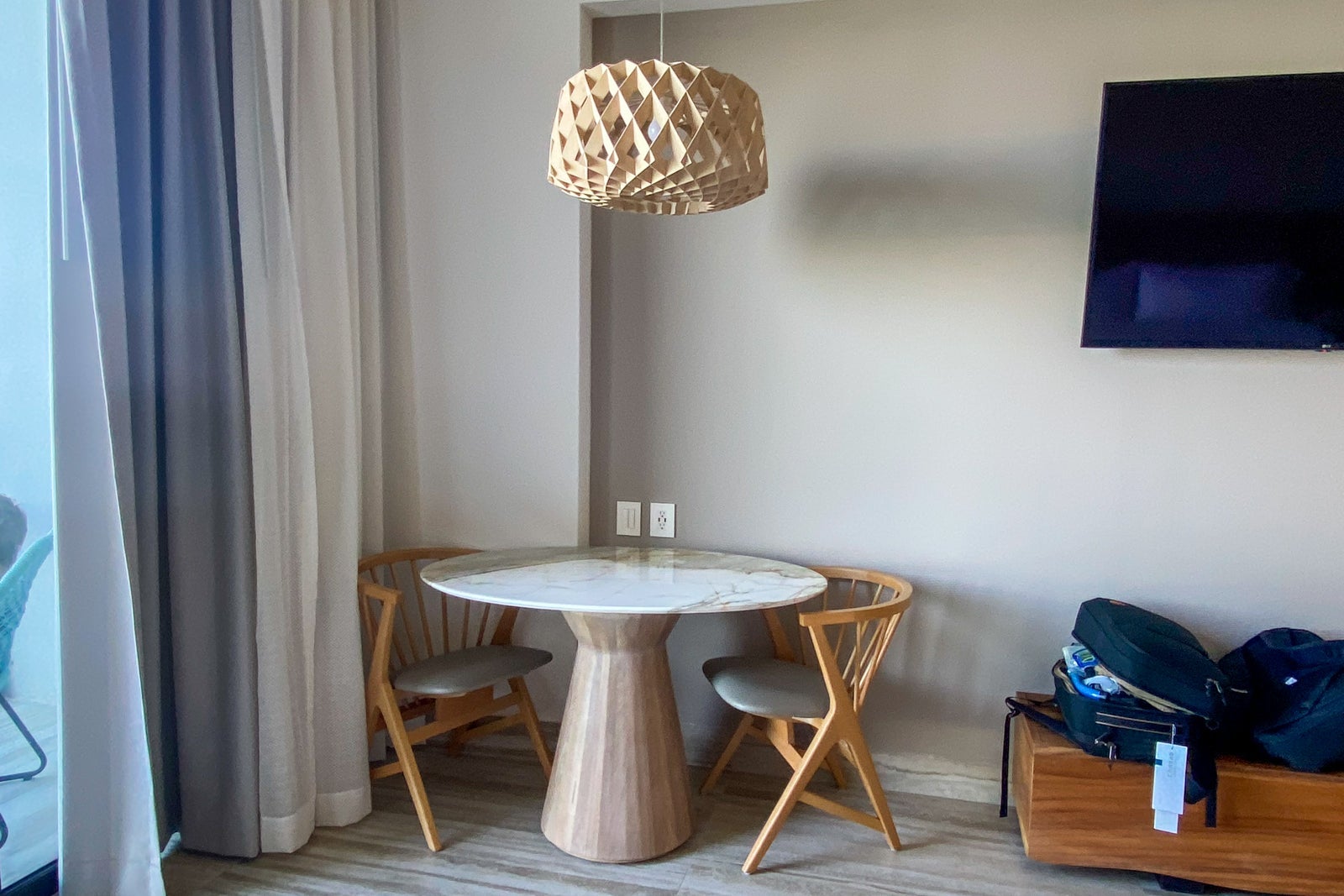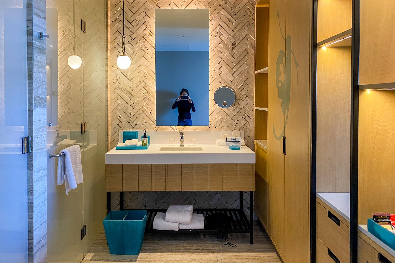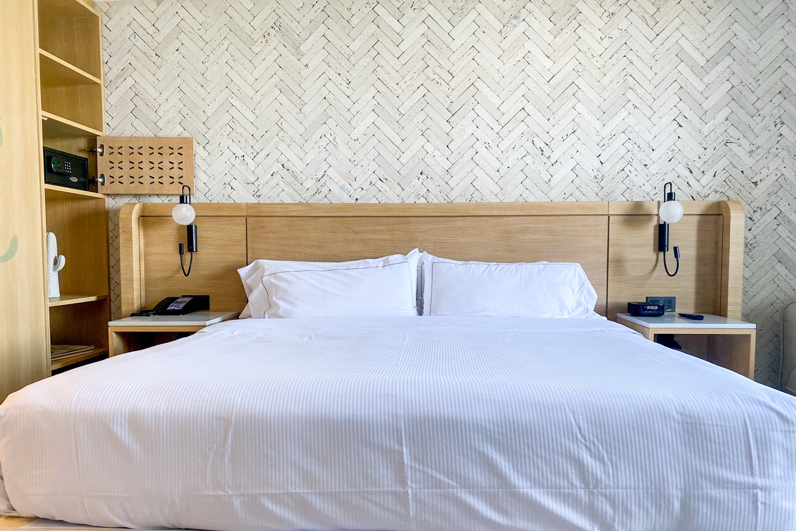 In the corner, a beige chaise and table with two chairs created a separate seating area and the workspace and outlets were well-positioned to charge devices. Shelves and a closet stocked with two robes separated the bedroom from the bathroom and there was a Nespresso coffee maker, a safe and a minibar stocked (and restocked daily) with a selection of soda, juice, water, light beer and seltzer. A smattering of decorative objects and coffee table books added a dose of local color.