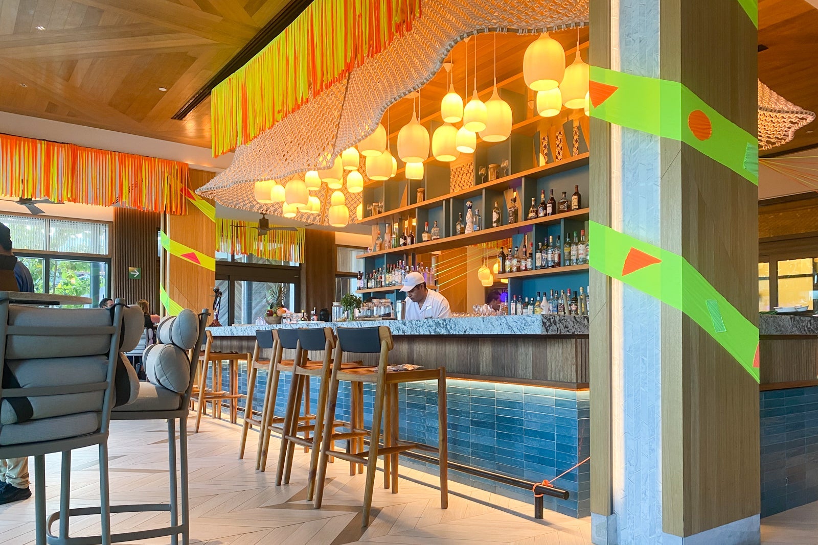The colorful Azulinda lobby bar melds a vibrant cantina ambiance with eclectic lounge decor — bean bags, tree stump tables and wicker furnishings. It's a perfect gathering spot for a pre-dinner cocktail (plump for the cucumber margarita or a caipirinha), or to pull out your laptop and catch up on work.