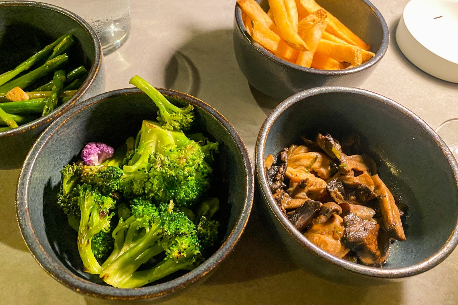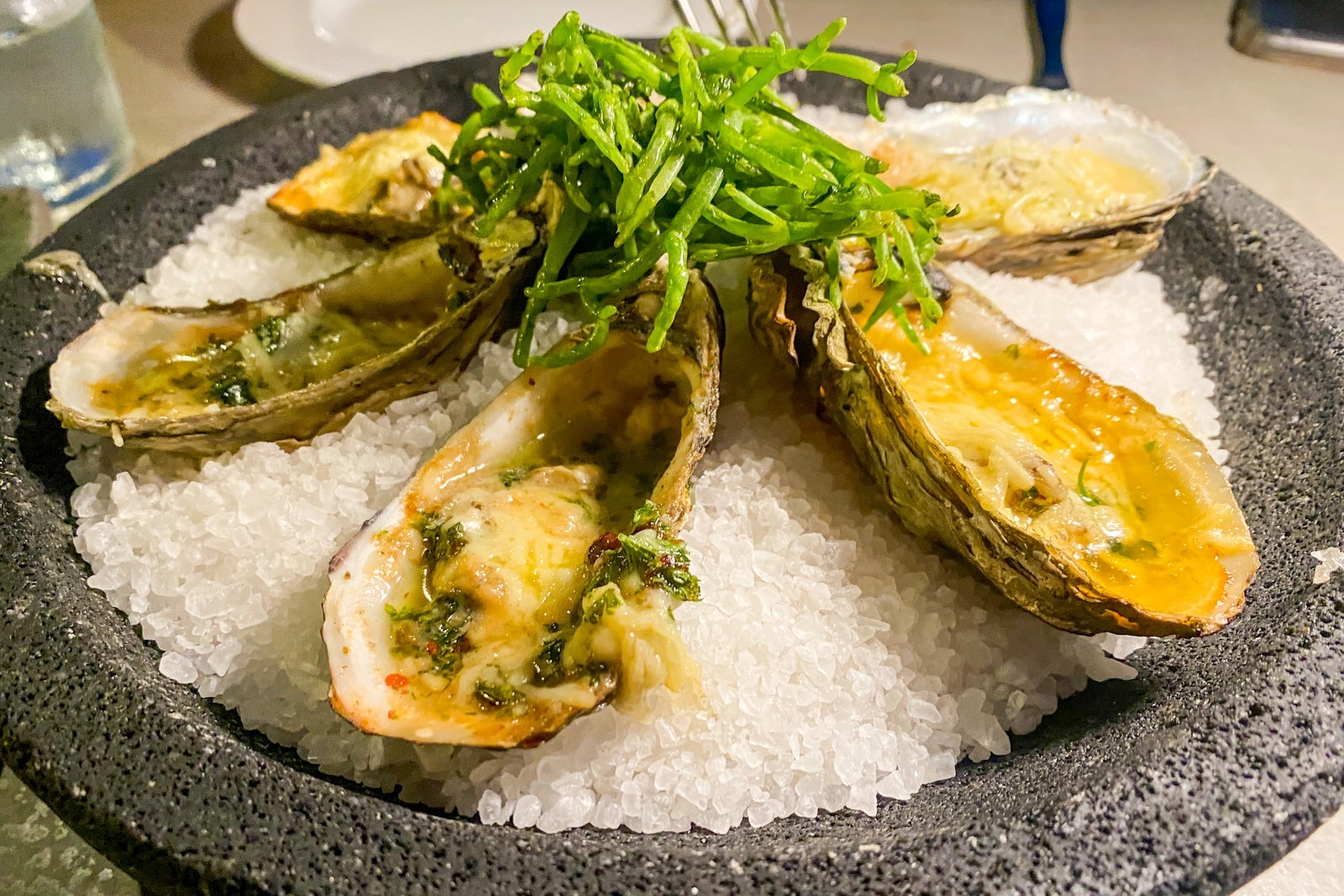 For my appetizer, I ordered the oysters topped with chaya, garlic cream and panko, followed by grilled fish of the day (local sea bass) served with sides of roasted broccoli, seasonal mushrooms and fries. It was fresh and artfully presented, and there were a few surprising twists along with the familiar Mexican tropes.