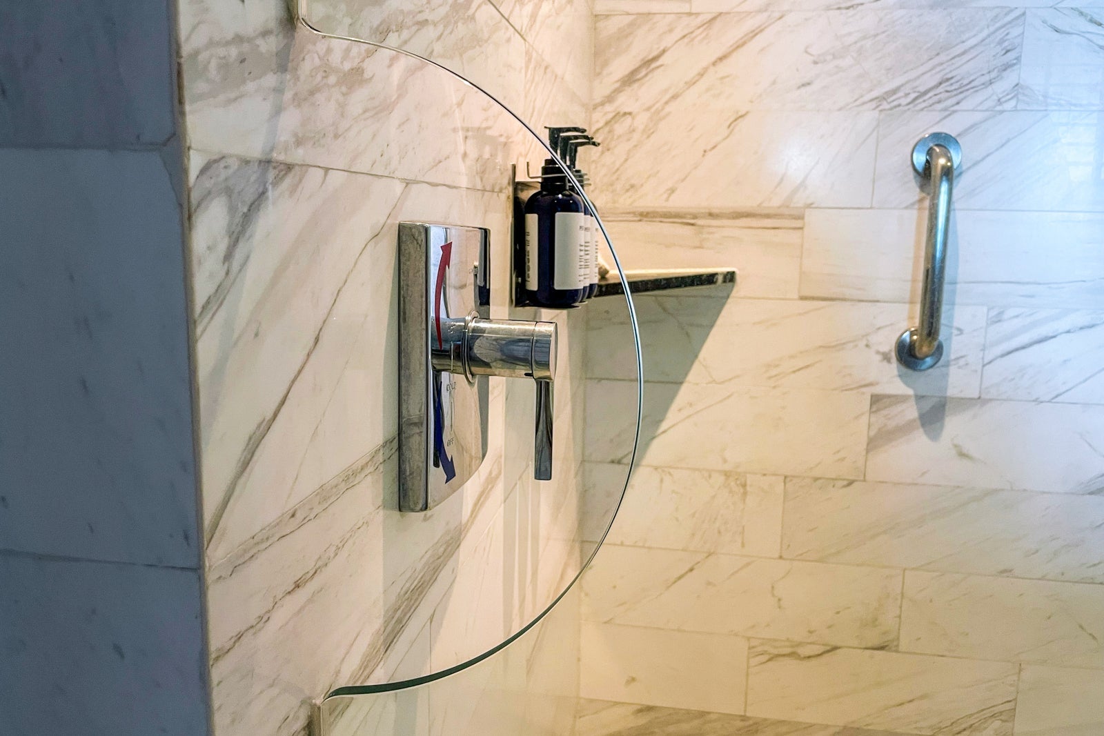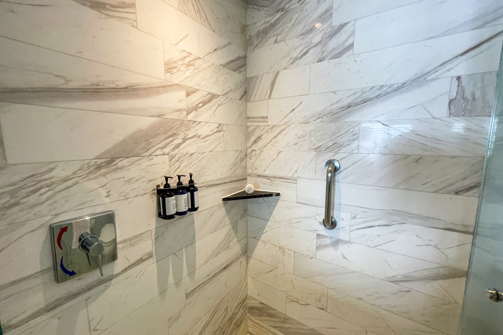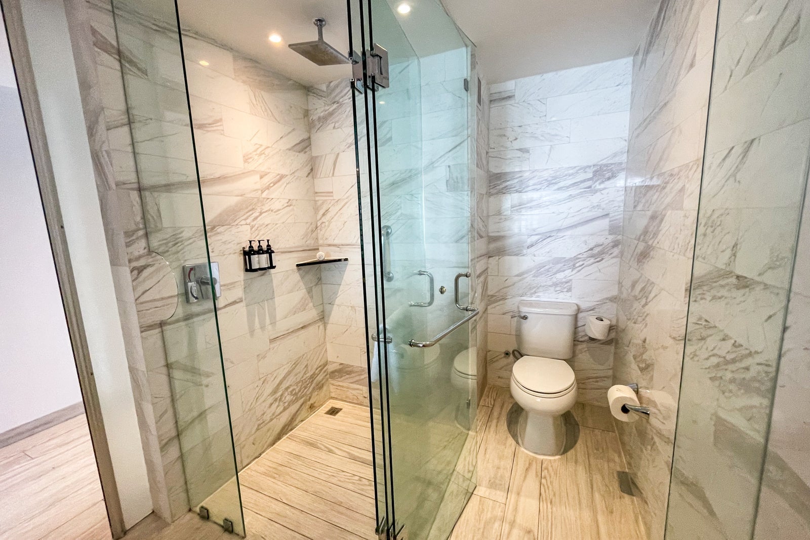 Moving into the bathroom, I appreciated that the shower had a small gap in the glass door to reach in and start the shower without getting the floor outside wet. Unfortunately, the water temperature was inconsistent during my stay, with hot water half the time and tepid water the other half.
