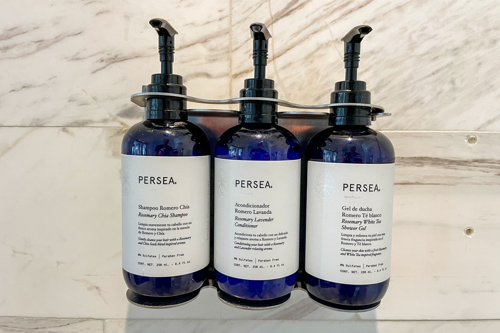 The hotel notified guests, with a piece of paper left at each guest's door, that the water would be completely shut off for three hours overnight. Refillable bath products are provided by Mexican apothecary Persea, which retails these bottles for about $15 each.