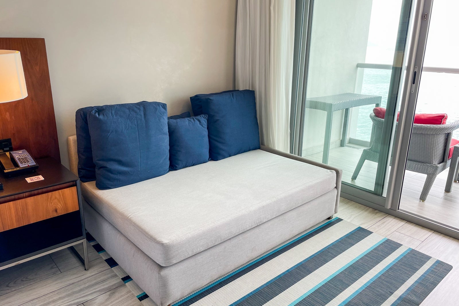 With my Diamond status, I was upgraded from a base-level room with a partial ocean view to a superior ocean view room. The rooms are long and narrow and feature a balcony with two comfortable outdoor chairs.