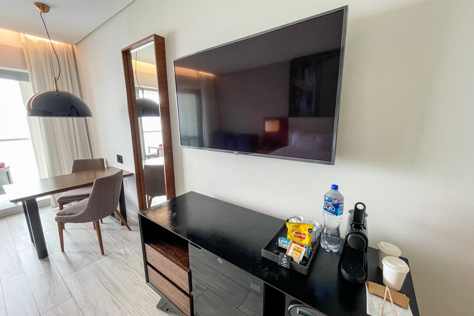 As for amenities, you'll enjoy a 55-inch television, a Nespresso machine and a selection of Coca-Cola drinks, beers and waters in the minifridge. This room lacks storage space — I ended up sprawling my suitcase out in the main hallway directly next to the front door. A mesh tote bag is provided, which is useful for carrying items to and from the pools.