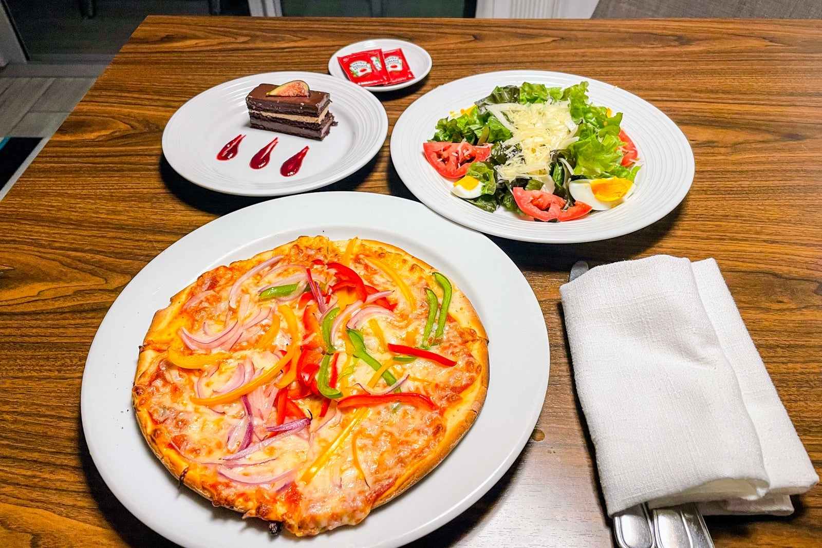 I was exhausted on my first night, so I tried the room service. While the menu is available on the online resort guide, there is no online ordering option, so that's done over the phone. I was quoted 35 minutes, and my food arrived in 40. The mixed salad, vegetarian pizza and chocolate cake all tasted as basic and flavorless as they appear in the photo.