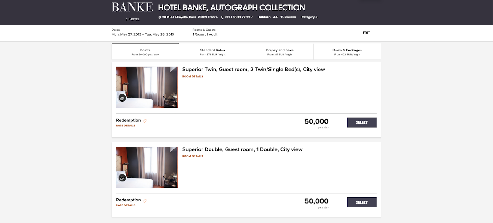 Rates at the Hotel Banke tend to range from around $200 to $700, depending on dates and the room type you book. Instead of a starter room, dubbed a "Single, Smaller Guest Room," I opted for one in the next category level, a "Superior Double," which tends to be 20 euros ($22) more per night. If you want a room with a queen bed, expect to pay about $50 more. This is a Marriott Category 6 hotel, where award nights cost 50,000 points and, so far, are readily available.