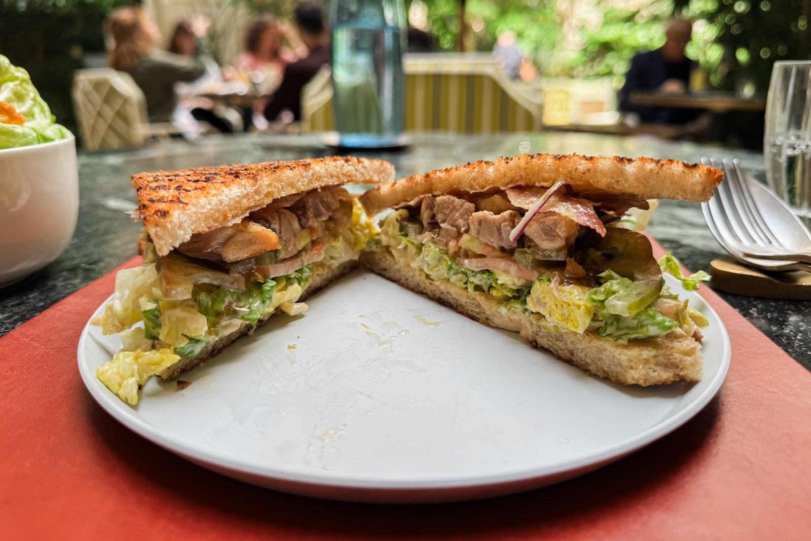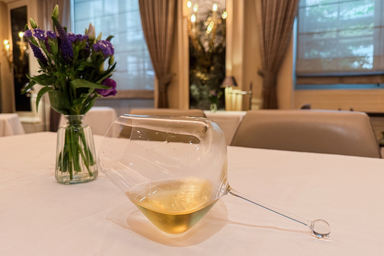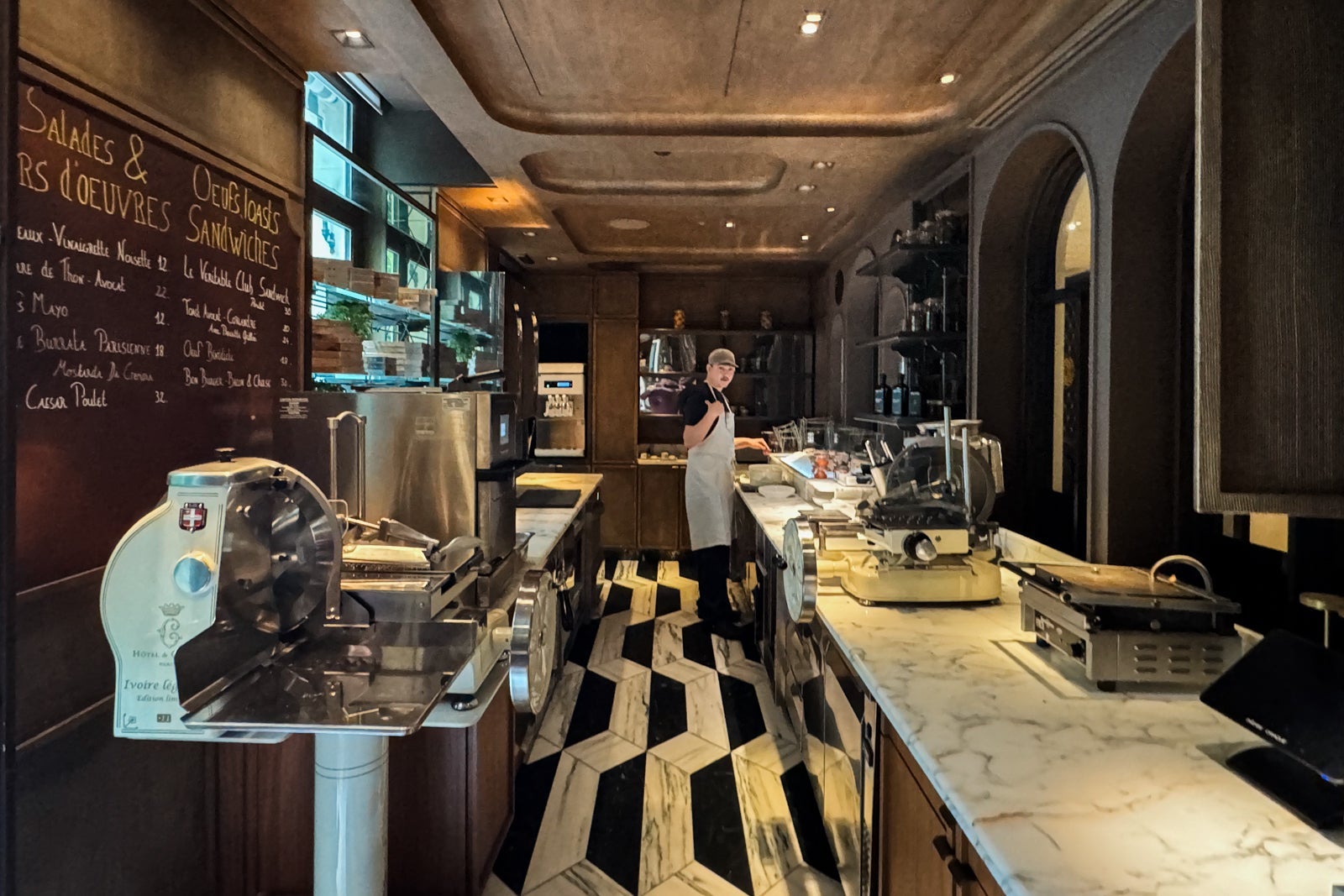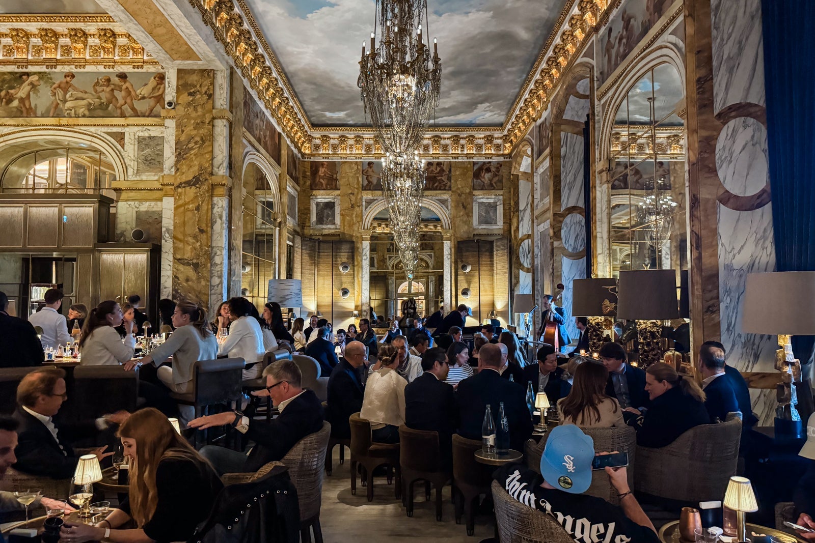 After freshening up, it's time for cocktails at Bar Les Ambassadeurs. Located in a lavish salon near the hotel's main entrance, with a ceiling frescoed like a stormy sky and crystal chandeliers cheekily draped in metal chains, this is the place to be on a weekday evening thanks to live music with a full band and botanical-inspired cocktails like the Lavender ($34) with Del Maguey mezcal, fino sherry, lavender bitters, honey, citrus and chili; and the Rhubarb ($34) with Michter's Bourbon, rhubarb bitters and fennel seed soda.