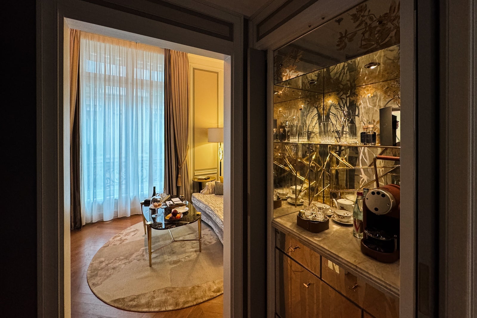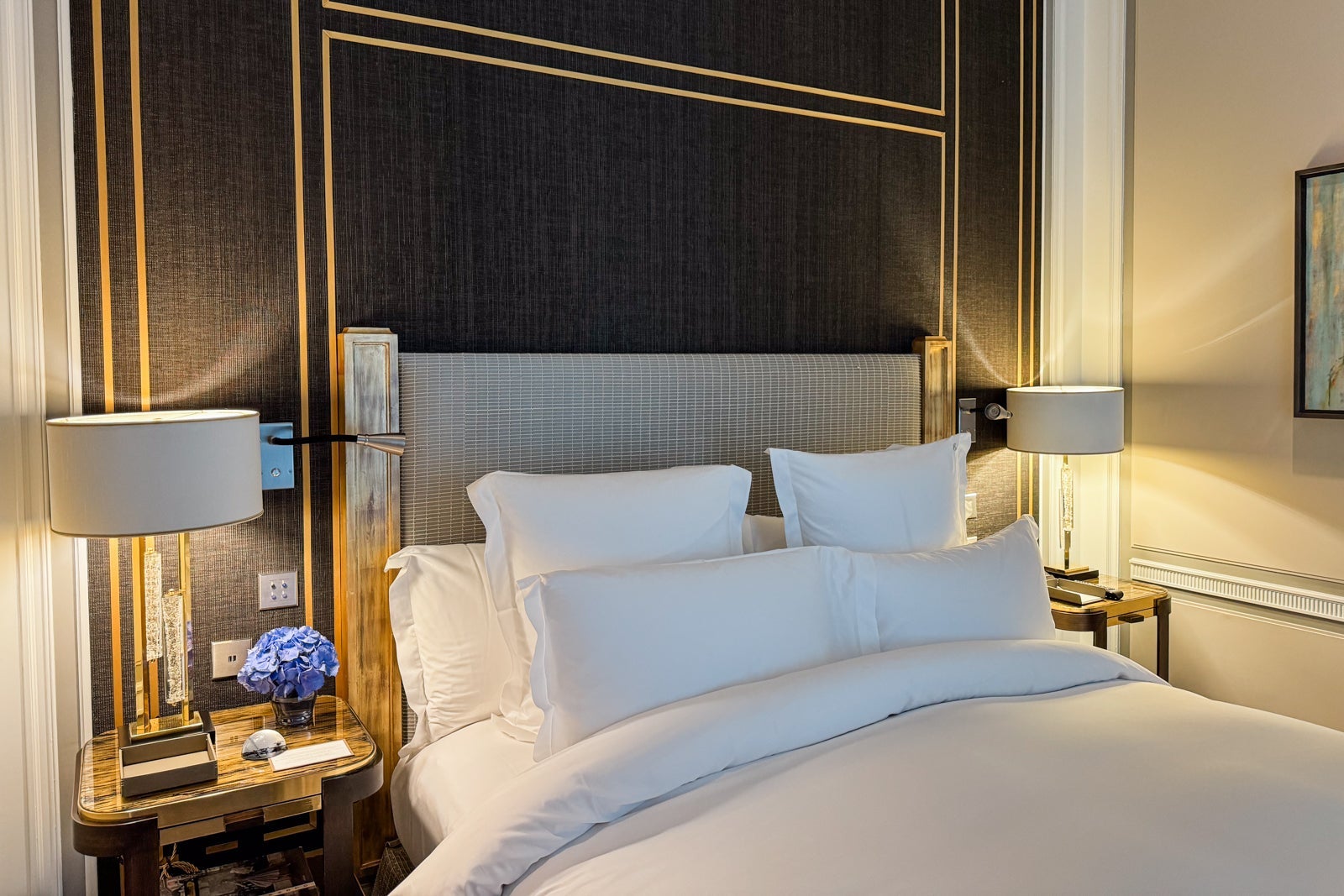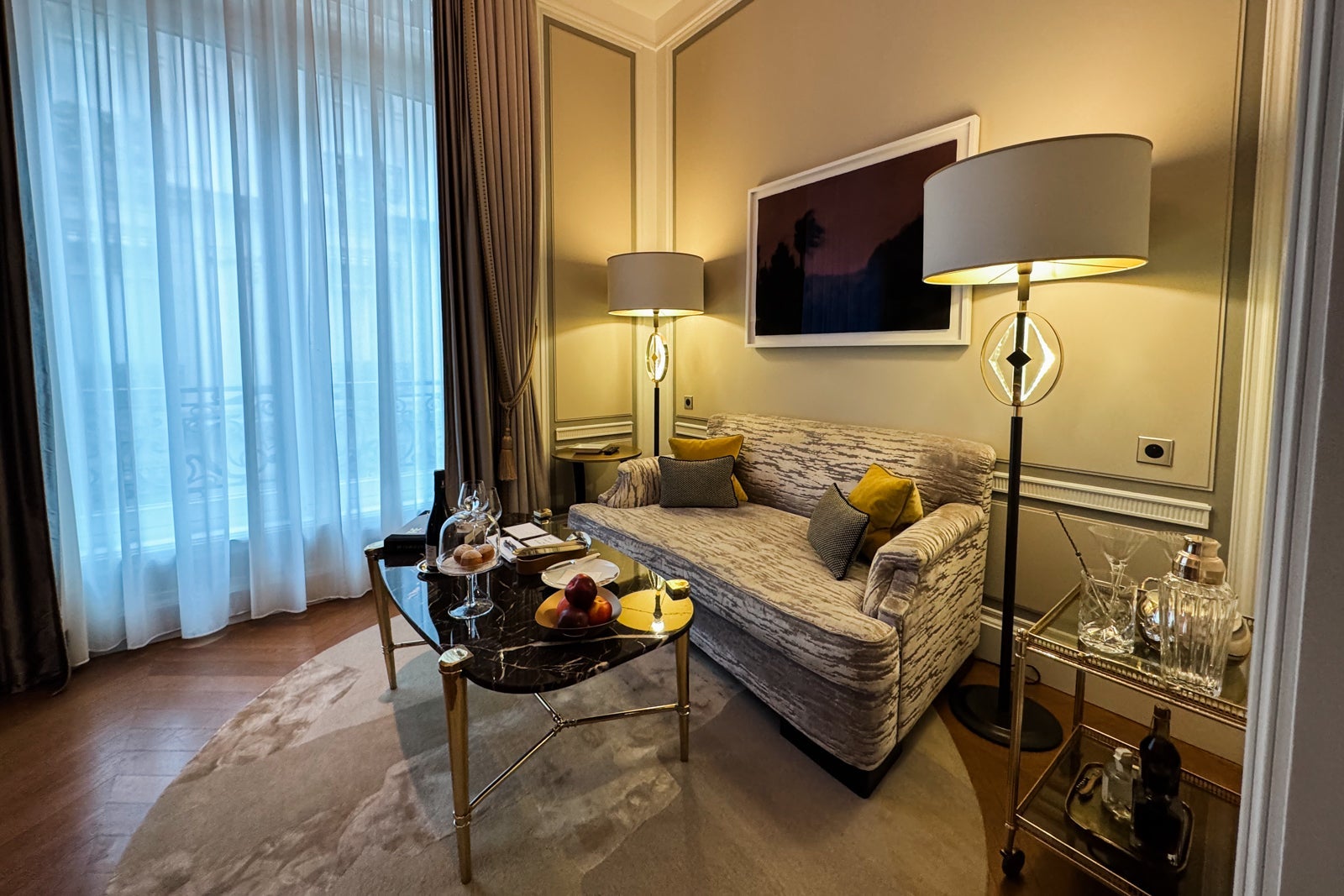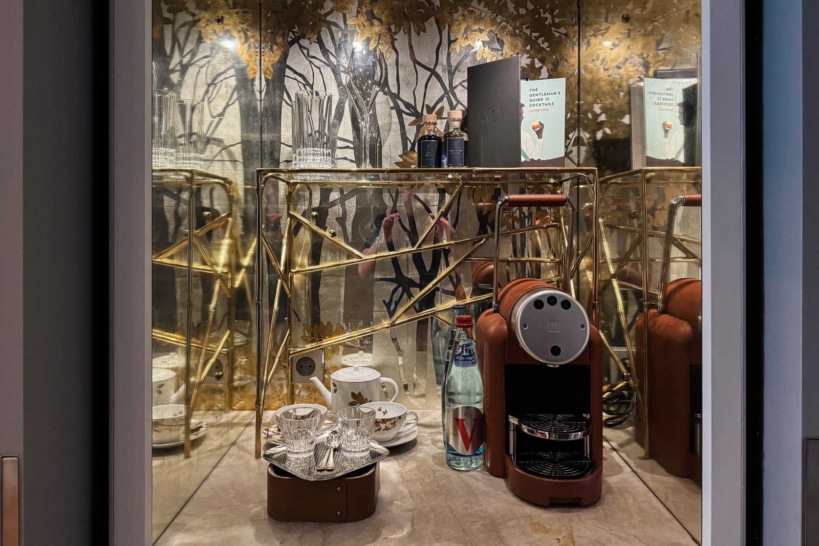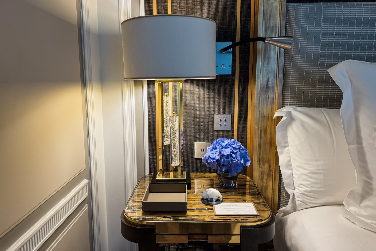 I considered mixing myself a drink from the antique-style bar cart or the minibar with its silver-and-gold sylvan wallpaper and sinking onto a velvet loveseat. Instead, I dashed off a few notes on provided postcards at the glossy wooden table (OK, yes, and nibbled on some of the pastries that came as part of a welcome amenity).