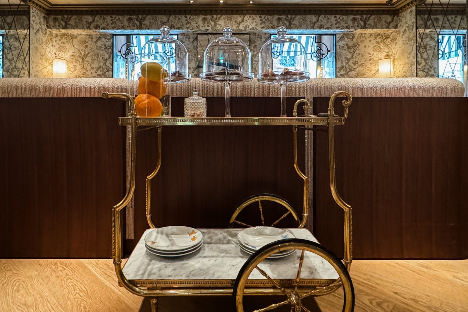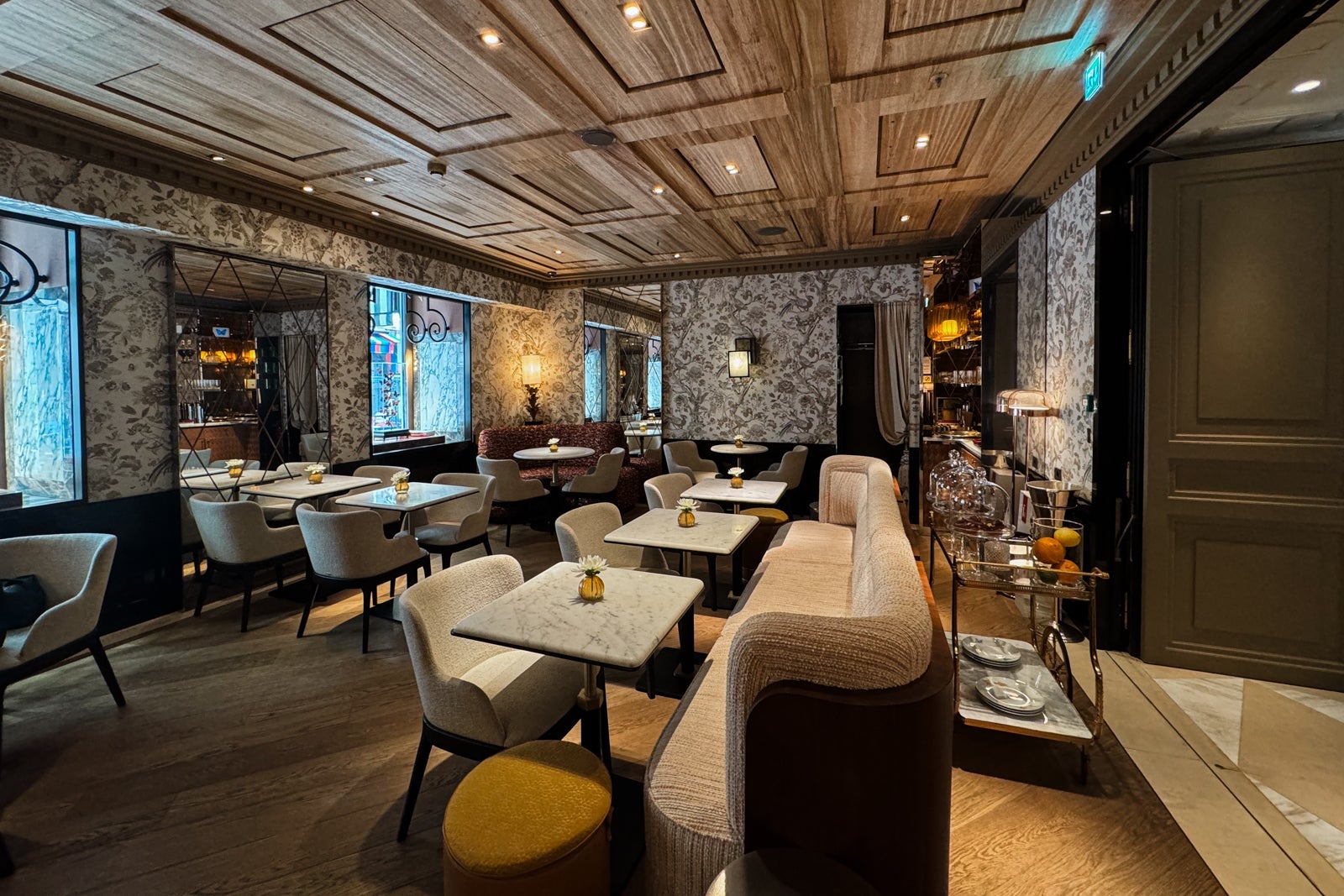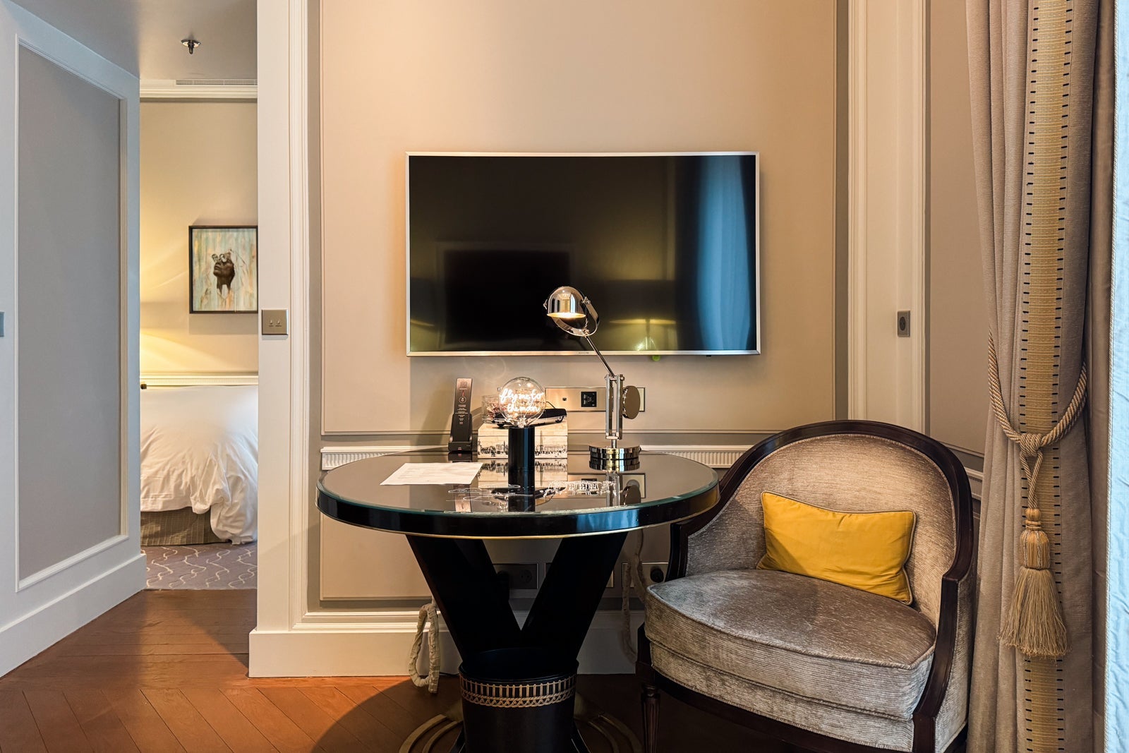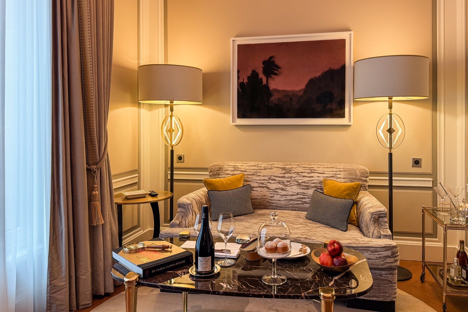 I considered mixing myself a drink from the antique-style bar cart or the minibar with its silver-and-gold sylvan wallpaper and sinking onto a velvet loveseat. Instead, I dashed off a few notes on provided postcards at the glossy wooden table (OK, yes, and nibbled on some of the pastries that came as part of a welcome amenity).