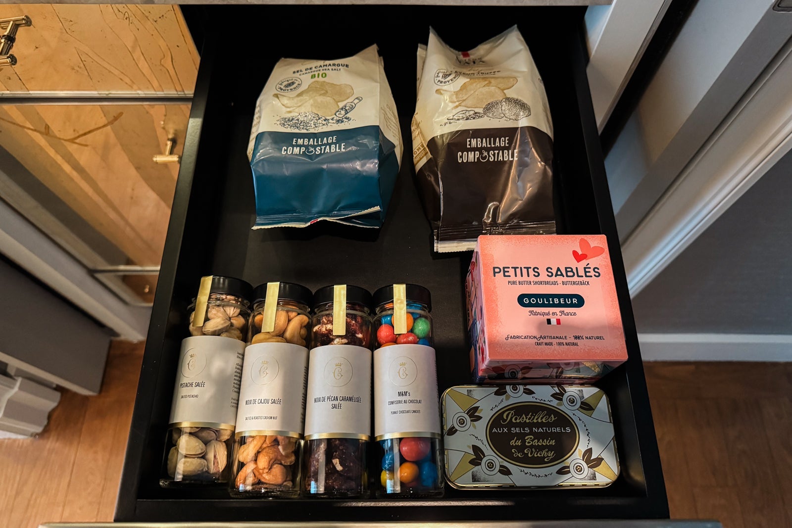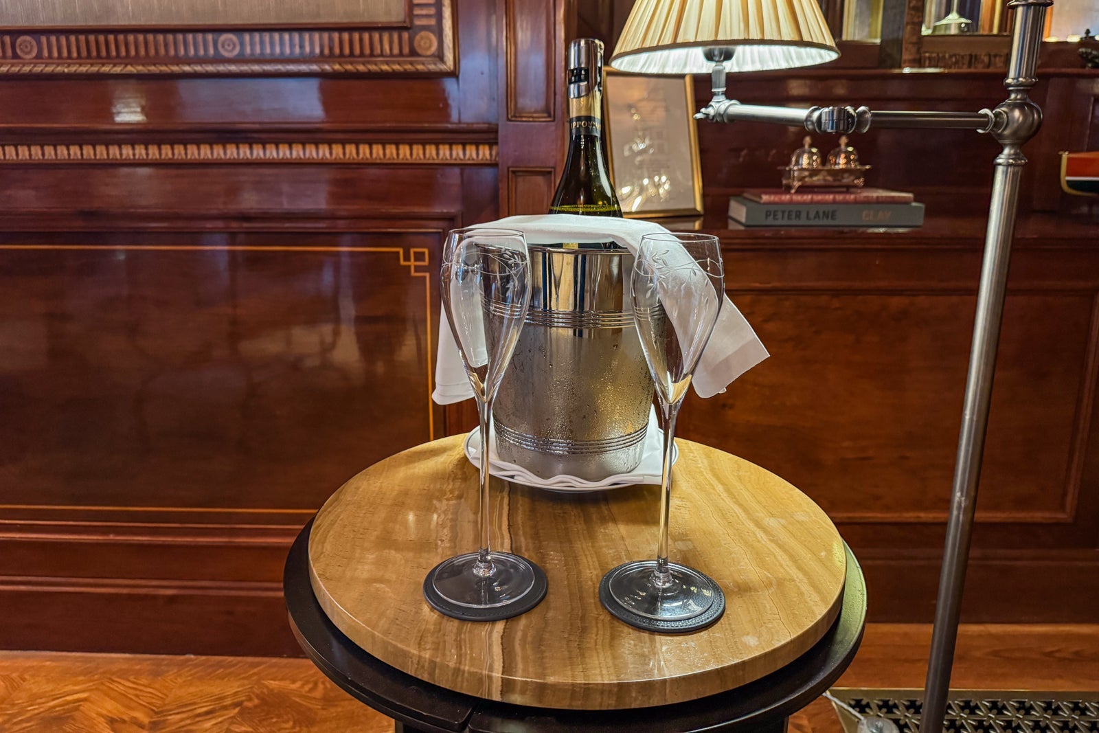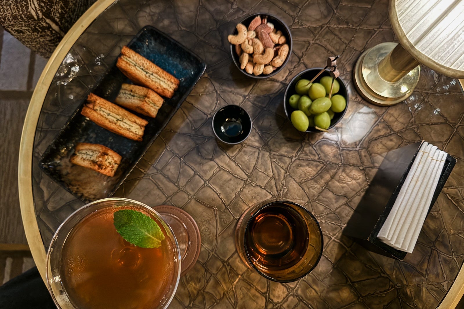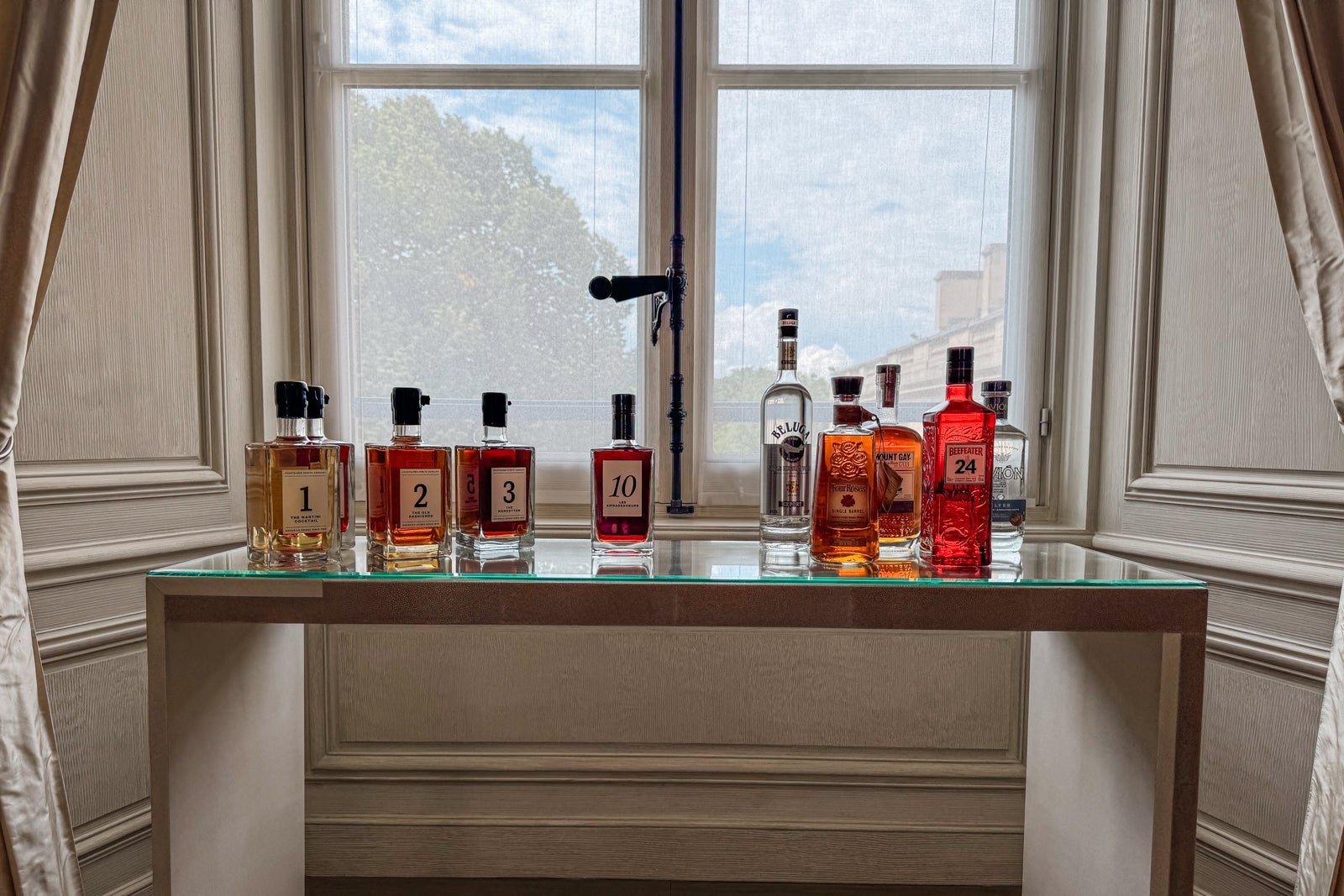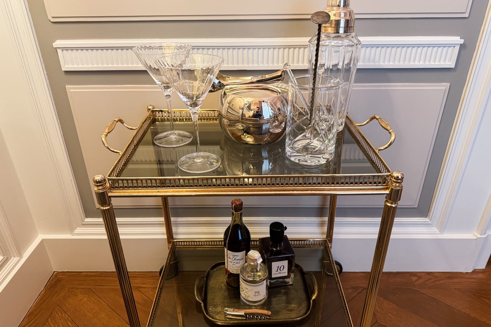 I considered mixing myself a drink from the antique-style bar cart or the minibar with its silver-and-gold sylvan wallpaper and sinking onto a velvet loveseat. Instead, I dashed off a few notes on provided postcards at the glossy wooden table (OK, yes, and nibbled on some of the pastries that came as part of a welcome amenity).