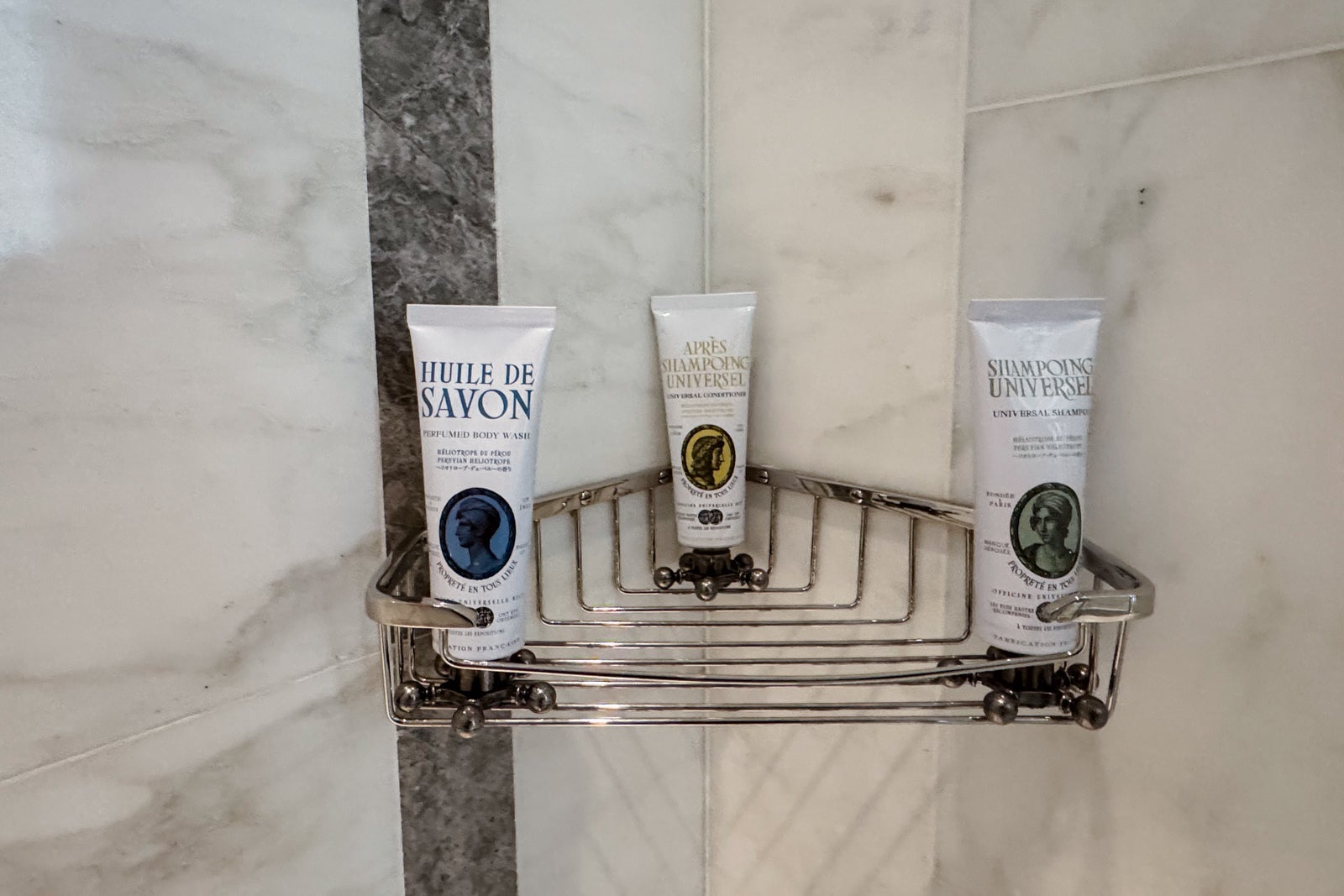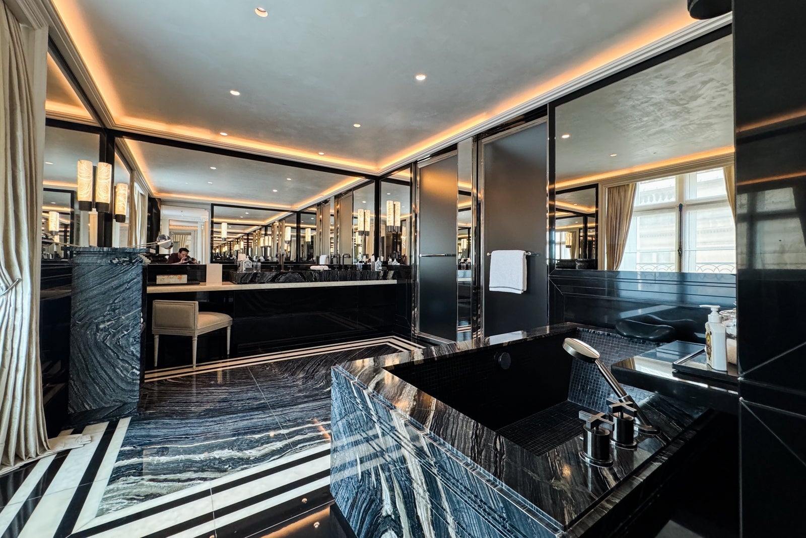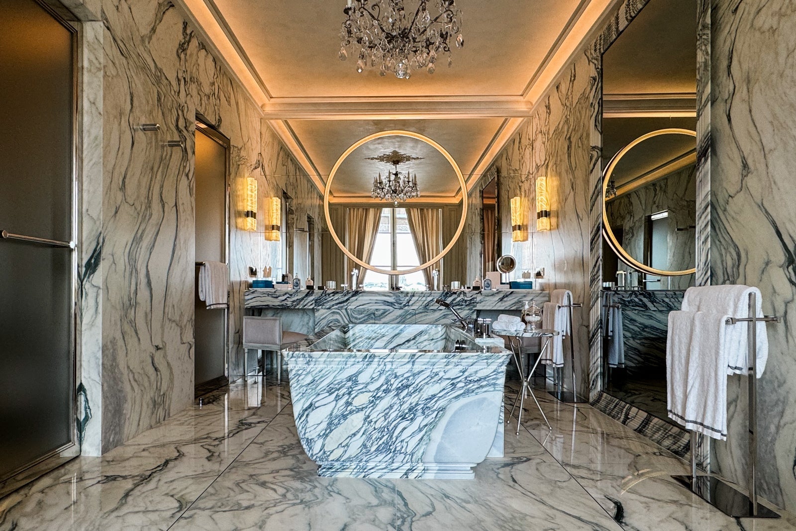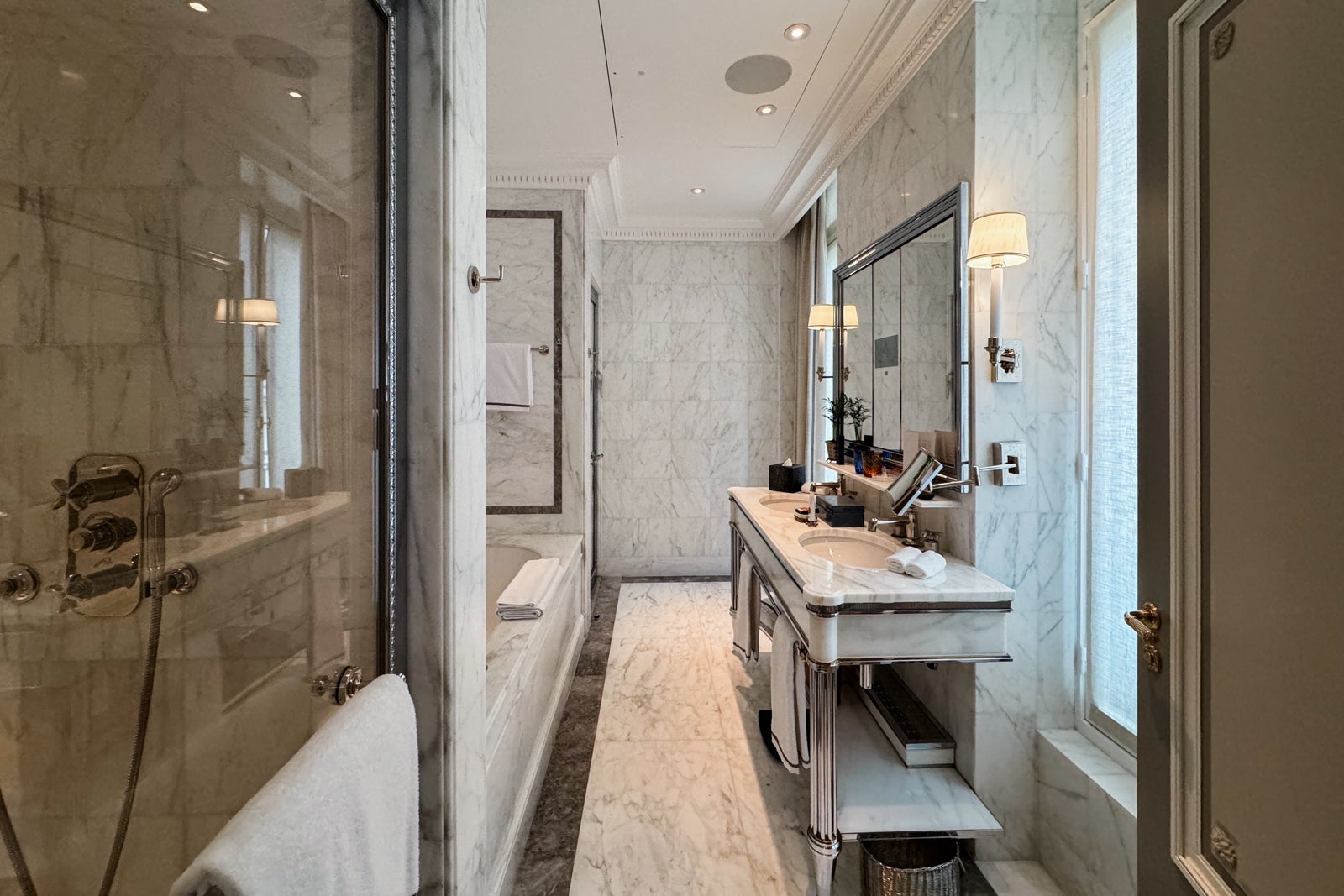 Instead, I took up temporary residence in the all-marble bathroom, sampling the fragrant Officine Universelle Buly products while weighing a bath in the huge soaking tub. I eventually opted for a refreshing rinse in the shower, whose ornate, metal-bordered glass door felt like a baroque picture frame.